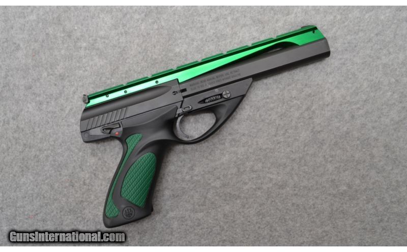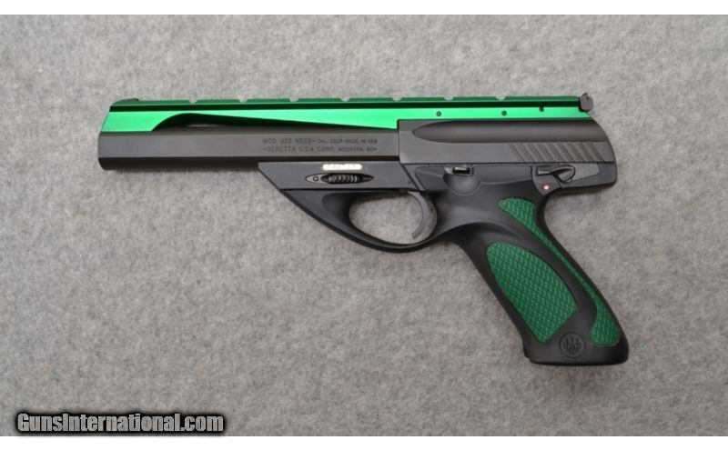 Description: Beretta Model U-22 Neos .22 LR, six inch barrel, with factory fully adjustable rear sight and front blade and with green anodized optic rail. The bore is bright with strong rifling. The barrel and slide show some minor wear at the edges. Frame shows some light wear around the trigger guard. The factory grips with green inserts are in excellent condition. Includes factory blue plastic case, paperwork, trigger lock, and two ten-round magazines. SOLD Caliber Info: .22 LR Metal Condition: Barrel and slide show some minor wear at the edges. Frame shows some light wear around the trigger guard. Wood Condition: Grips are in excellent condition. Bore Condition: Bright bore with strong rifling. Barrels: Six inch barrel. Triggers: Smooth trigger. Stock: Polymer black grips with green inserts. Weight: 2 lbs 3 oz Sights: Factory fully adjustable rear sight with front blade and green anodized optic rail. Extras: Includes factory blue plastic case, paperwork, trigger lock, and two ten-round magazines Item Location: Mitchell, SD |