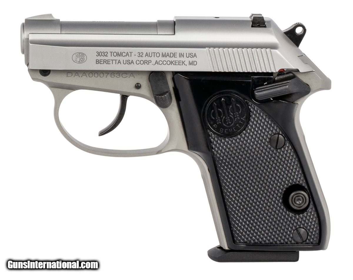 Description: Guns Listing ID: 372262 QUALITY POCKET PISTOLS. The same dedication to advanced design, uncompromising quality and strict quality control that make the 92FS, Cougar and Cheetah such international standouts is found in all Beretta small caliber, pocket-size pistols. Simplicity, safety and practical use are their best qualities. The 3032 Tomcat offers all the features of the 21 Bobcat adding a wide slide and a contoured tang to protect the thumband increase pistol control. The snag proof design and slide blade front sight permit quick presentation and fast target acquisition followed by smooth crisp trigger pull in double/single action. The tip up barrel allows direct chamber loading and safe clearing of the pistol. Jamming and stove piping problems are virtually eliminated by the open slide design shared by all small frame Berettas. The Tomcats barrel is forged from special high strength steel precisely rifled for accuracy. It has a black finish. The Inox Tomcat model has a stainless-steel slide and barrel with an exceptionally corrosion resistant and durable gray anodized frame to match the color and finish of the stainless components. The trigger hammer safety magazine and other metal parts are blued. SOLD Manufacturer: BERETTA Model: 3032 TOMCAT Caliber Info: .32 ACP Condition: new Barrels: 2.4 BARREL Finish: STAINLESS |