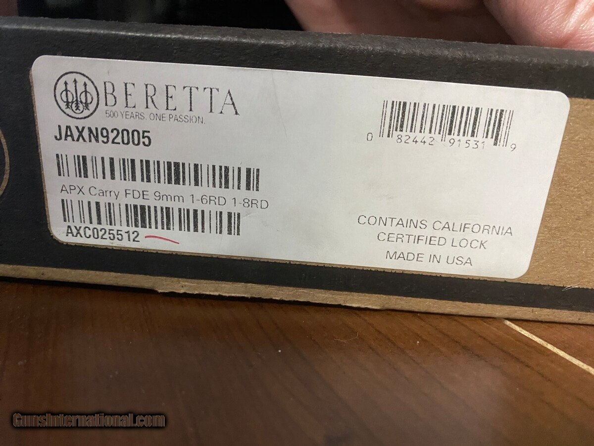 Description: Guns Listing ID: 916710 BERETTA APX CARRY - 9MM LUGER (9X19 PARA) SOLD Manufacturer: BERETTA Model: USA APX Carry Caliber Info: 9MM LUGER (9X19 PARA) Condition: Used - Non-Certified Barrels: 3.07 BARREL |