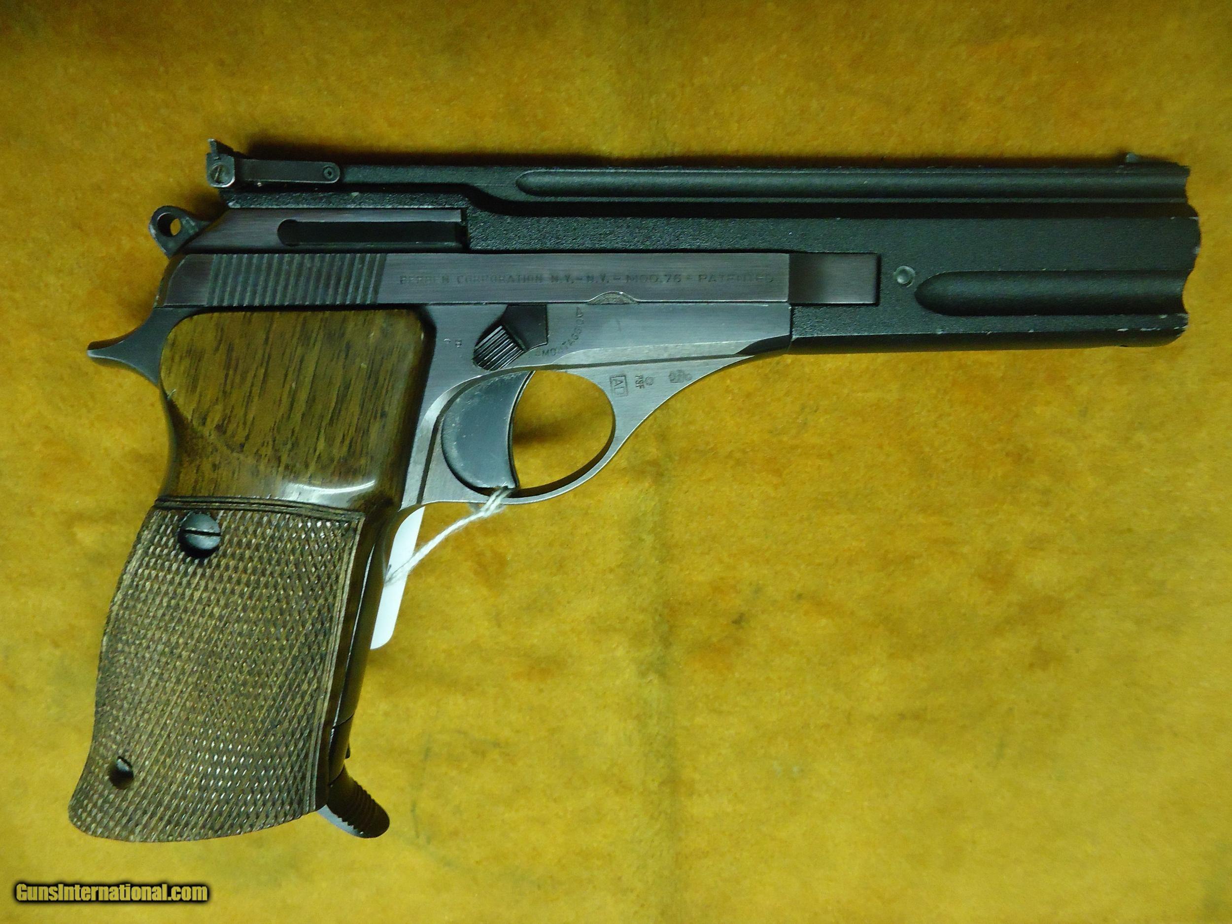 Description: Berretta Model 76W, 22 LR target pistol. 98% Pristine condition, bore perfect, has walnut thumb rest grips. 10 shot magazine .Adjustable sights. Blue finish. One of the best target pistols made, Berretta guality. This pistol has the top fame that supports the front and rear sight solidly to the frame of the pistol. Discontinued in 1985. SOLD Manufacturer: Berretta Model: 22 LR Model 76W Caliber Info: 22 LR Condition: 98% Metal Condition: Almost perfect Wood Condition: Very Good Bore Condition: perfect |