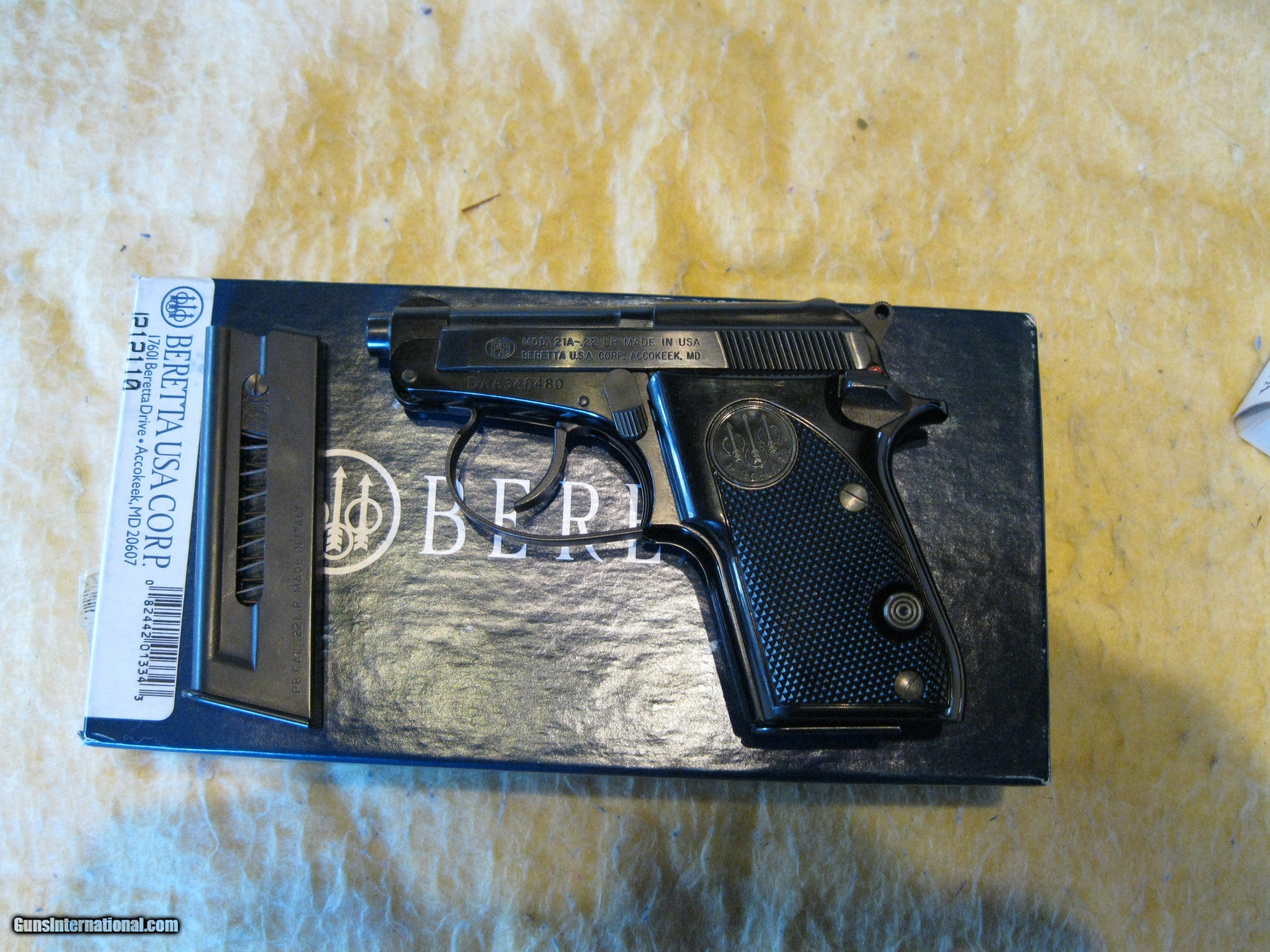 Description: Berretta Mod. 21A-22 .22LR Cal. Made in U.S.A. Plastic Grips. Original Box Papers Like new cond. Extra magazine. SOLD |