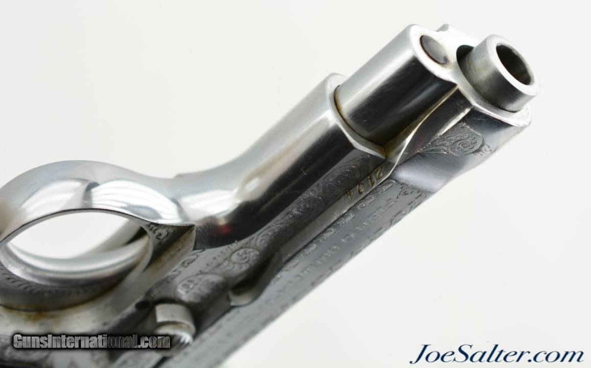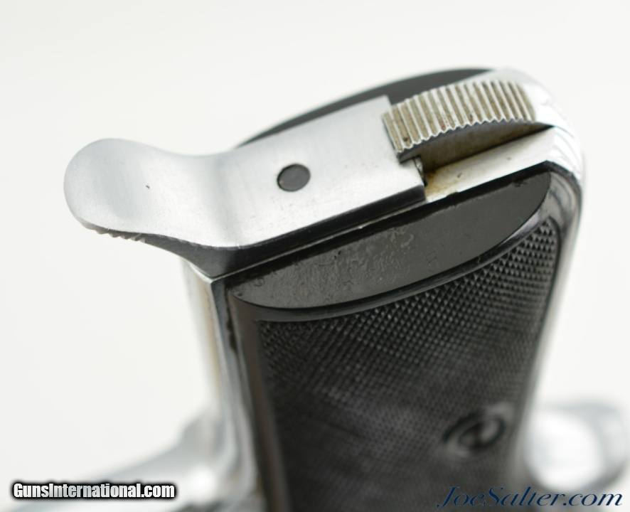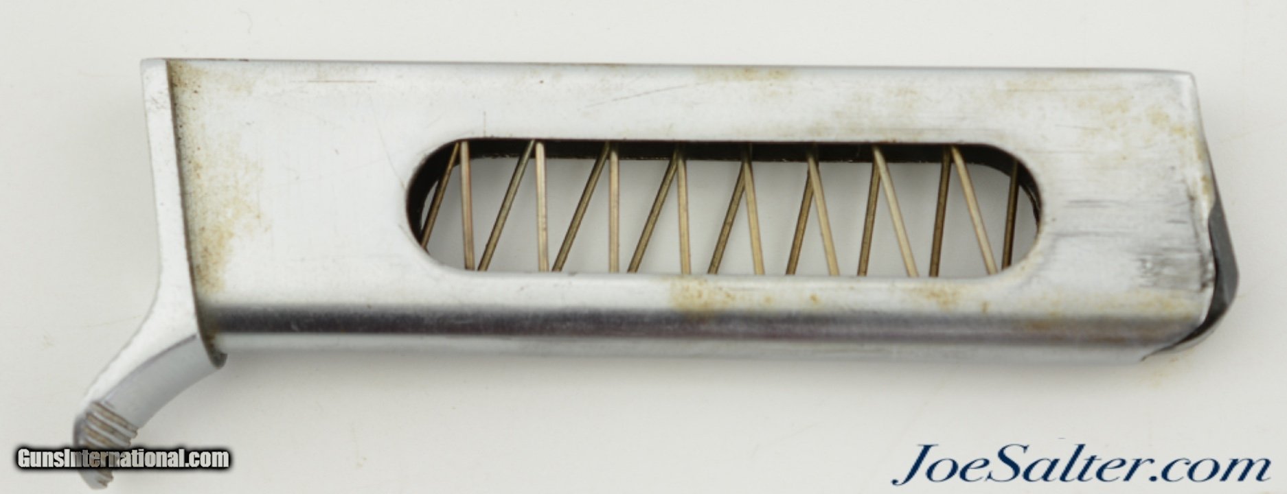Description: Serial #912104, 7.65mm (.32 ACP), 3 1/4" barrel with an excellent, bright bore. This is a 1957-made pistol that has practically all of the original hard chrome finish remaining. Some traces of pale brown staining can be seen on some of the factory floral scrollwork engraving, but this is very minor. The checkered black Beretta grips are likewise in excellent shape with only trace flattening of the points on either panel. The pistol comes with a single original chrome-finished magazine. These deluxe Model 1935s do not come up for sale very often, and this example, which is in excellent condition, would make a stellar addition to any collection. FFL or C&R SOLD |