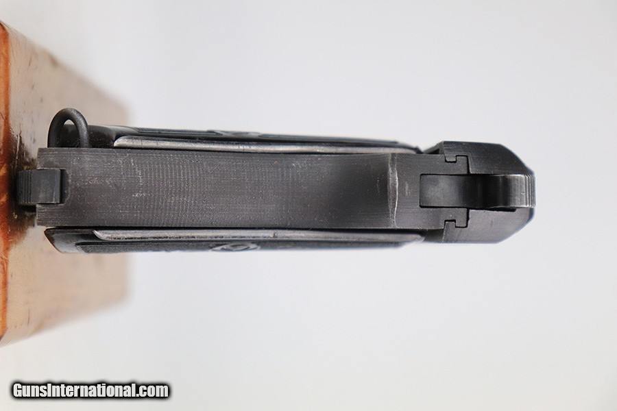 Description: This is a near-mint example of a Beretta Model 1935 issued to the Nazi military at the end of WW2, in 1945. It is all matching and has the proper "4UT" Nazi military proof on the left side of the tang (faintly struck). The gun has the proper end-of-war features such as an all-phosphate finish and no slide legend. It has retained about 98% of its original phosphate finish. There are just hints of wear on some of the high edges and some very light surface scuffs here and there. There is what appears to be a bur in the metal (most likely machining mark) on the left side of the slide near the muzzle. Comes with excellent bakelite grips and a period-correct blued magazine. The bore is mint. SOLD Curio/Relic: Yes Handgun Caliber: .32 ACP (7.65x17mm Browning SR) Bore: Mint Condition: ~98% |