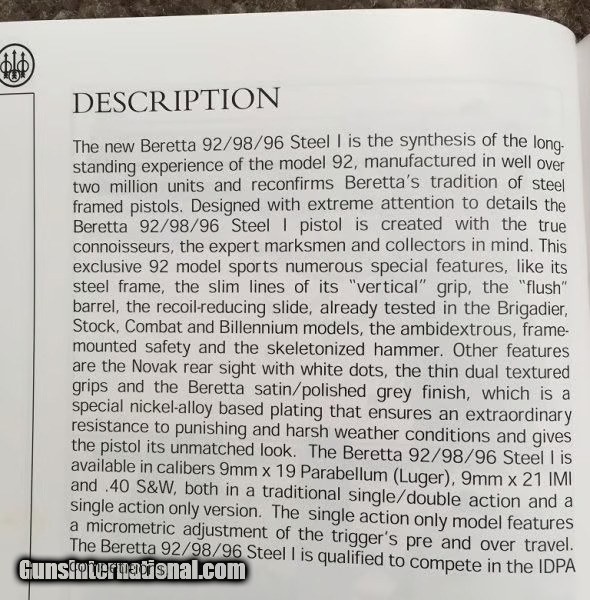 Description: The Steel I was basically built by Beretta to push the limits of their ability by building the finest 9X Series Beretta pistol there is. For many it’s thought of as the highest quality pistol Beretta ever built. The fit, finish, and attention to detail are excellent and this gun is considered by some as the masterpiece of the 9X Series. These pistols were produced and imported in 2004 and 2005 only, and even that was on a limited basis. This firearm is new-in-the-box, unfired, manufactured in 2005 with date code "BZ" on the right side of the frame. It comes with all original paperwork, manual, cleaning tools, Beretta lock and the original plastic case. I do not have the original outer cardboard box. Current pricing: $2595 or best offer... Specifications: