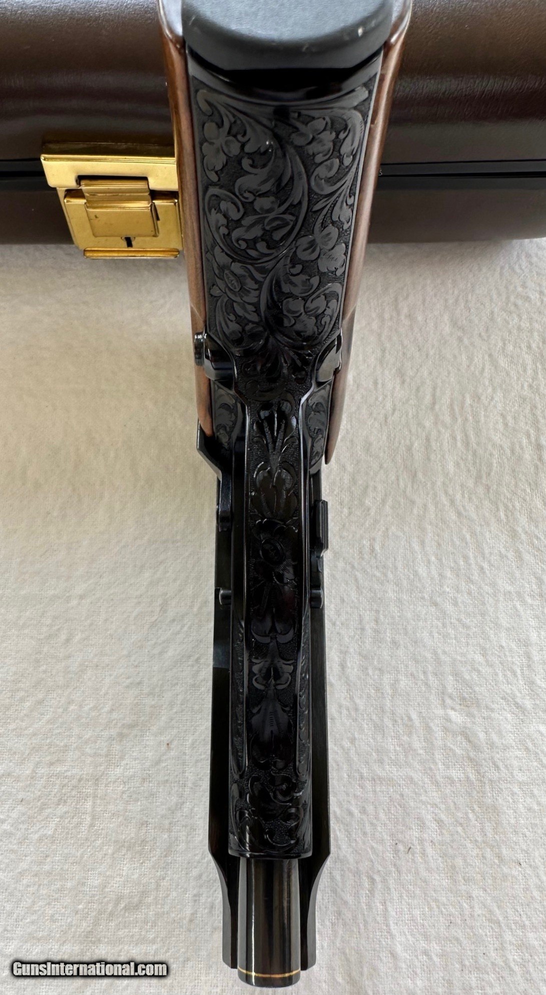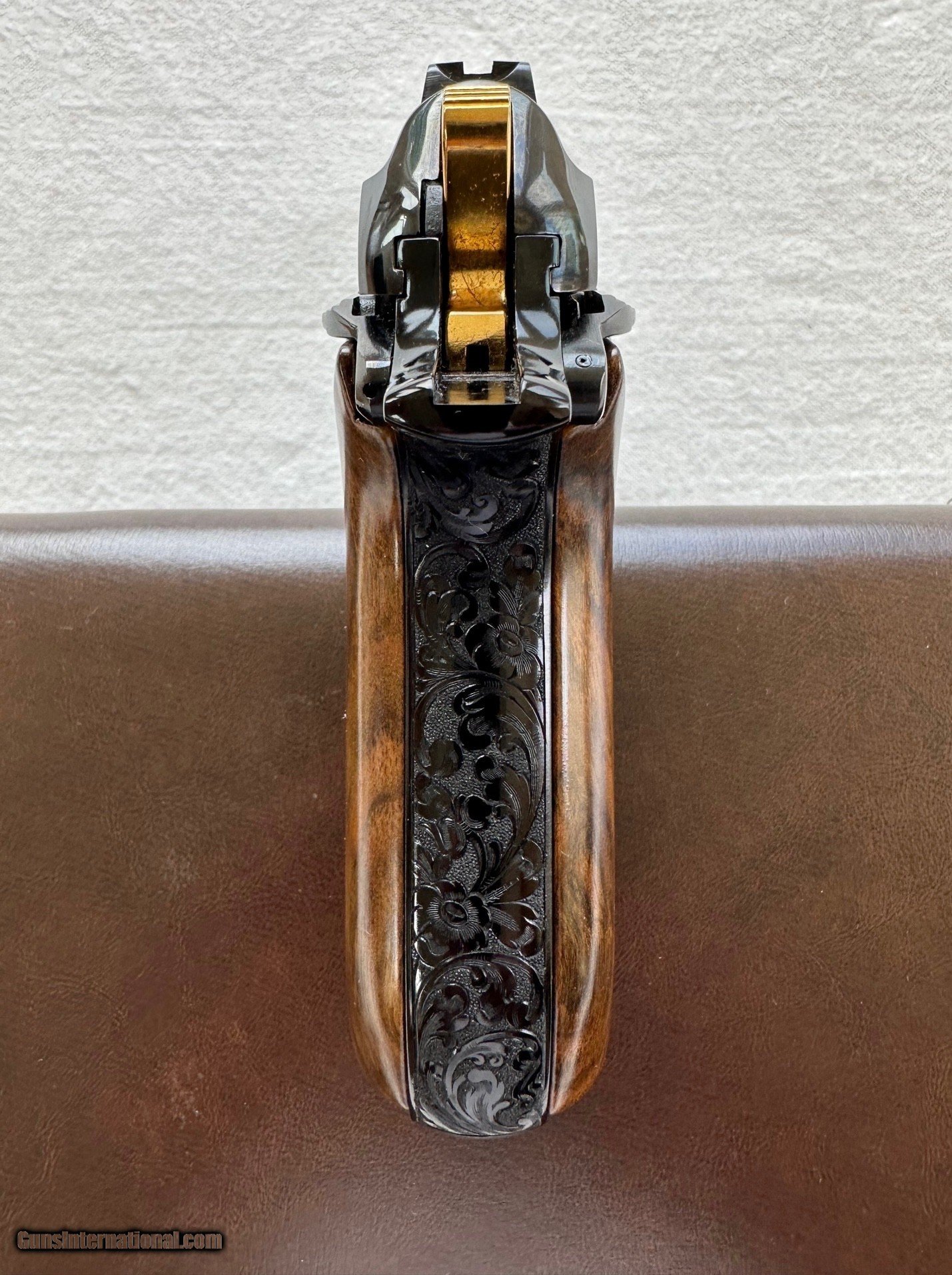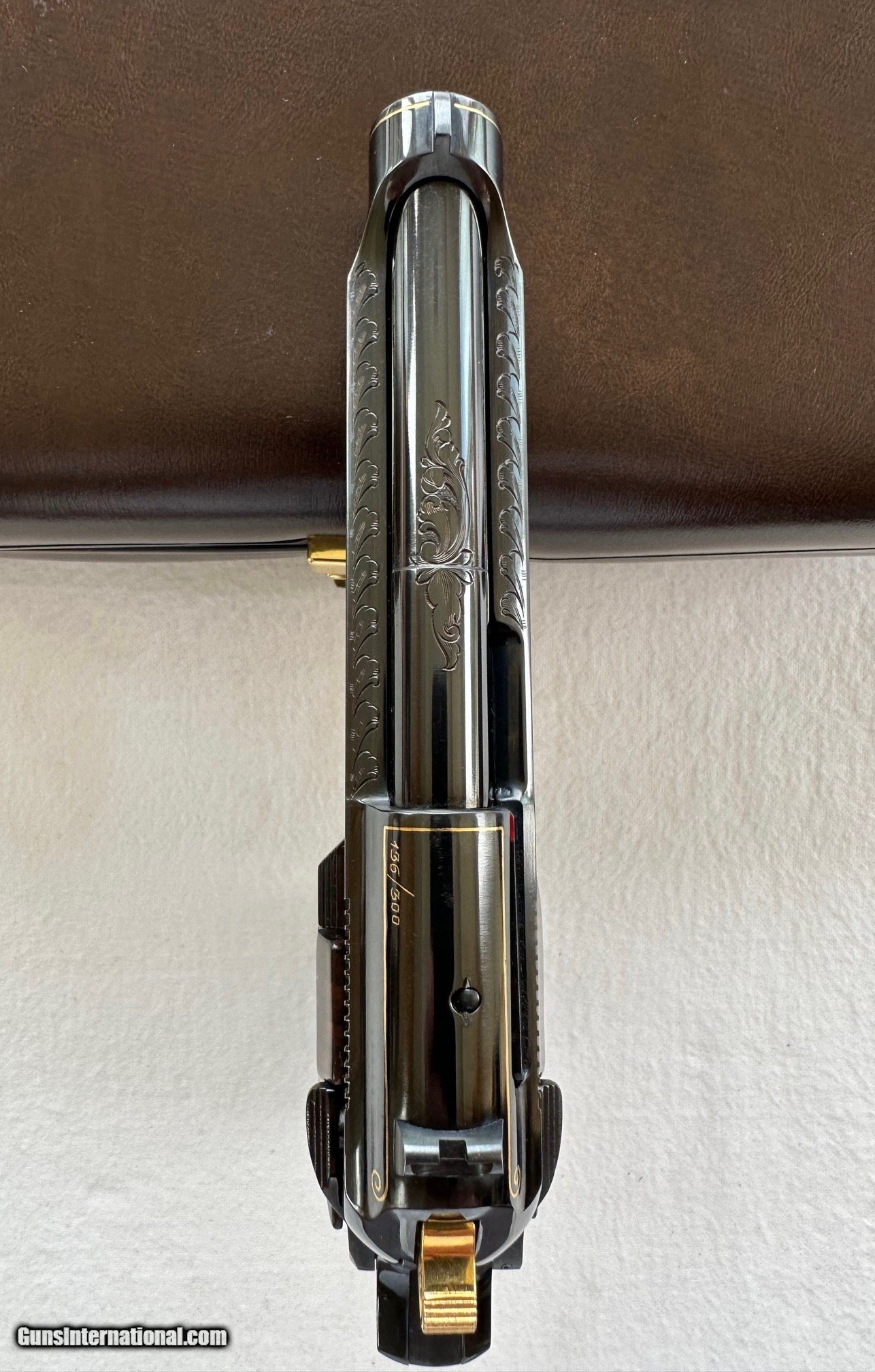 Description: Cerificate of Authenticity Made to celebrate 300 years of Beretta. A limited edition of 300 Model 84 caliber .380 pistols were hand engraved and gold embellished to commemorate this important event. Most were sold in Europe with very few ever making their way to the United States. This example is numbered 136 of 300 and is cased in its original french fitted leather case with spare magazine and cleaning equipment. Walnut grips with commemorative gold emblem. Scroll and vine engraved with dot punch background on receiver. Gold border inlay on slide panels and top. Gold finished hammer and trigger. Barrel Length 4" Caliber/Bore .380 ACP Model 84 Seller Information I am selling some of my personal collection. I do not accept trades. I accept payment by cashiers check or personal check. Personal checks must clear before the gun is shipped. (3) day non firing inspection for as new and unfired guns from the date your FFl receives the gun. All sales must go through my FFL and your FFL. My FFL is Duncan's Gun Works. Duncans is open Tuesday through Saturday 9am-5pm. Buyer pays shipping. SOLD Manufacturer: Beretta Model: 84 Serial Number: B45135Y Bore: .380 Condition: Excellent condition, unfired Metal Condition: Excellent Wood Condition: Excellent Bore Condition: Excellent Manufacture Date: Approx. 1980 |
