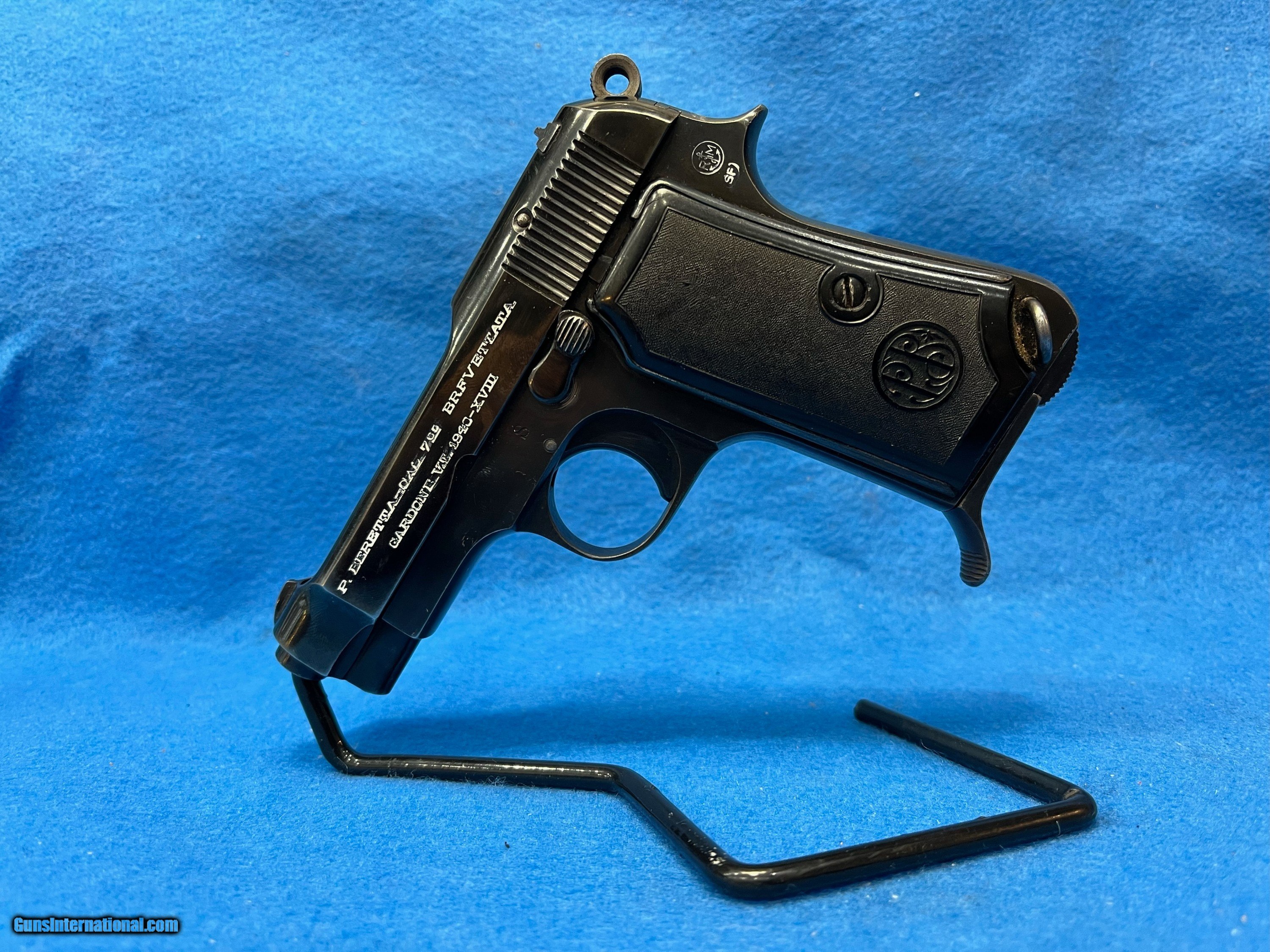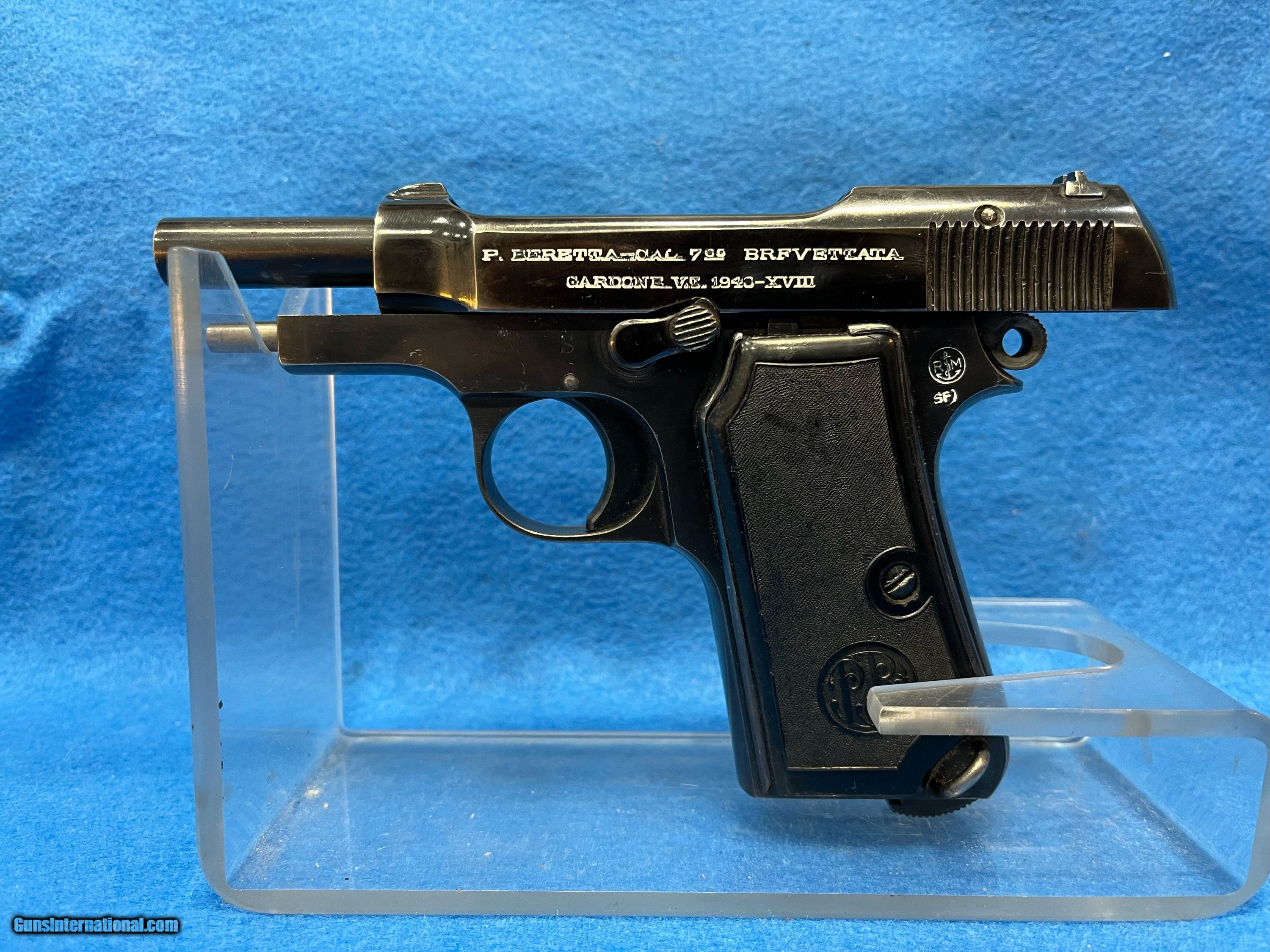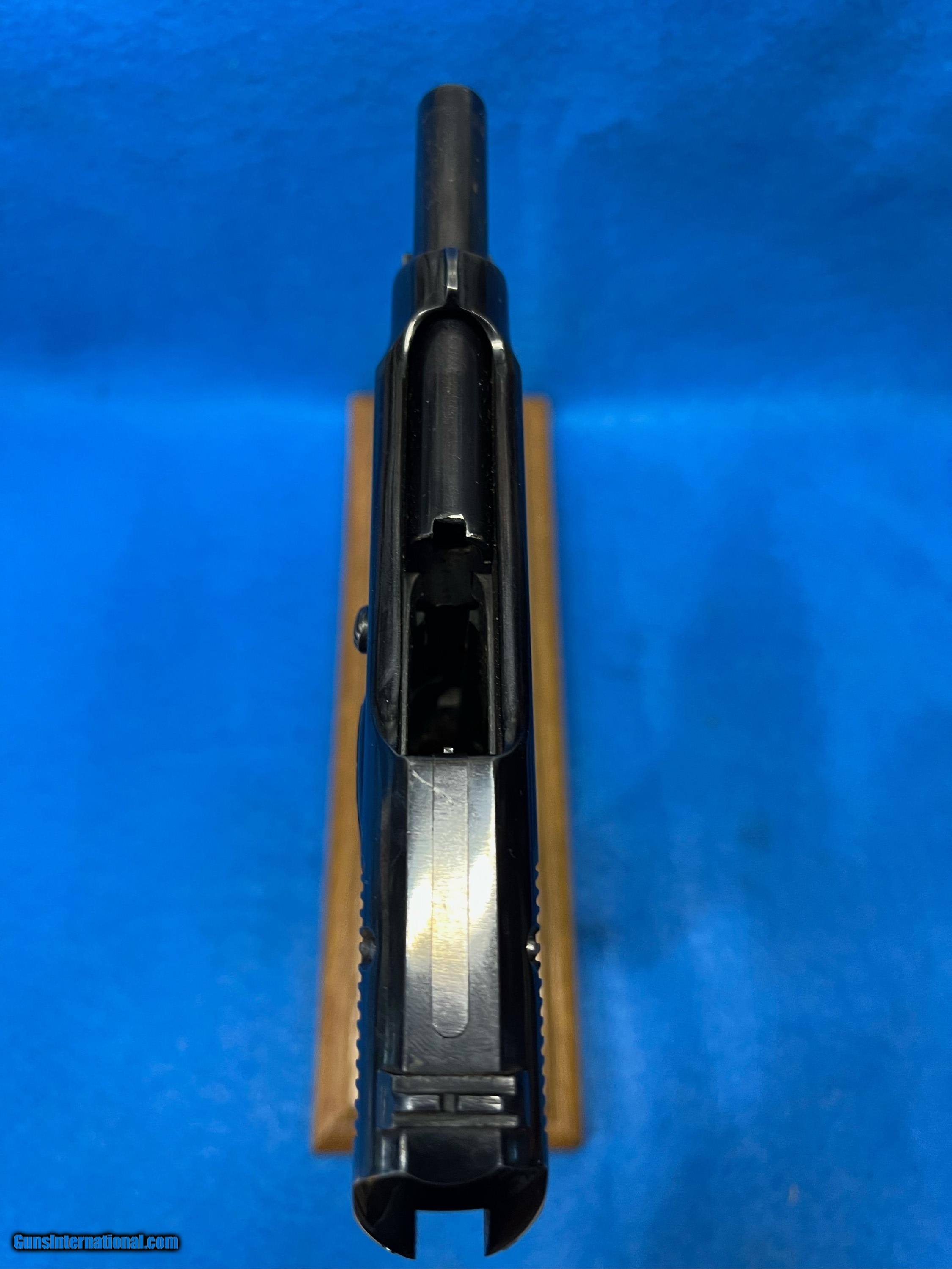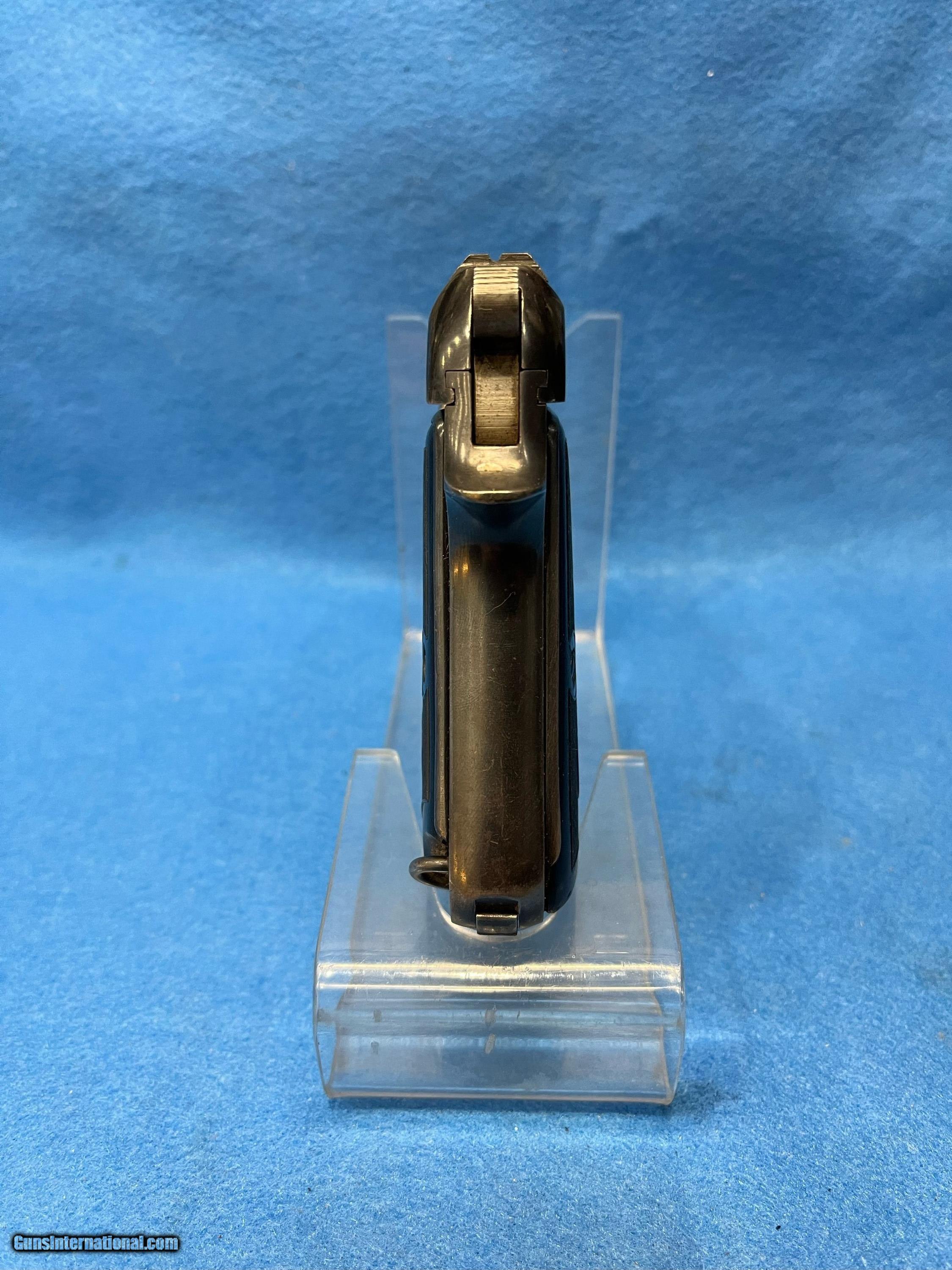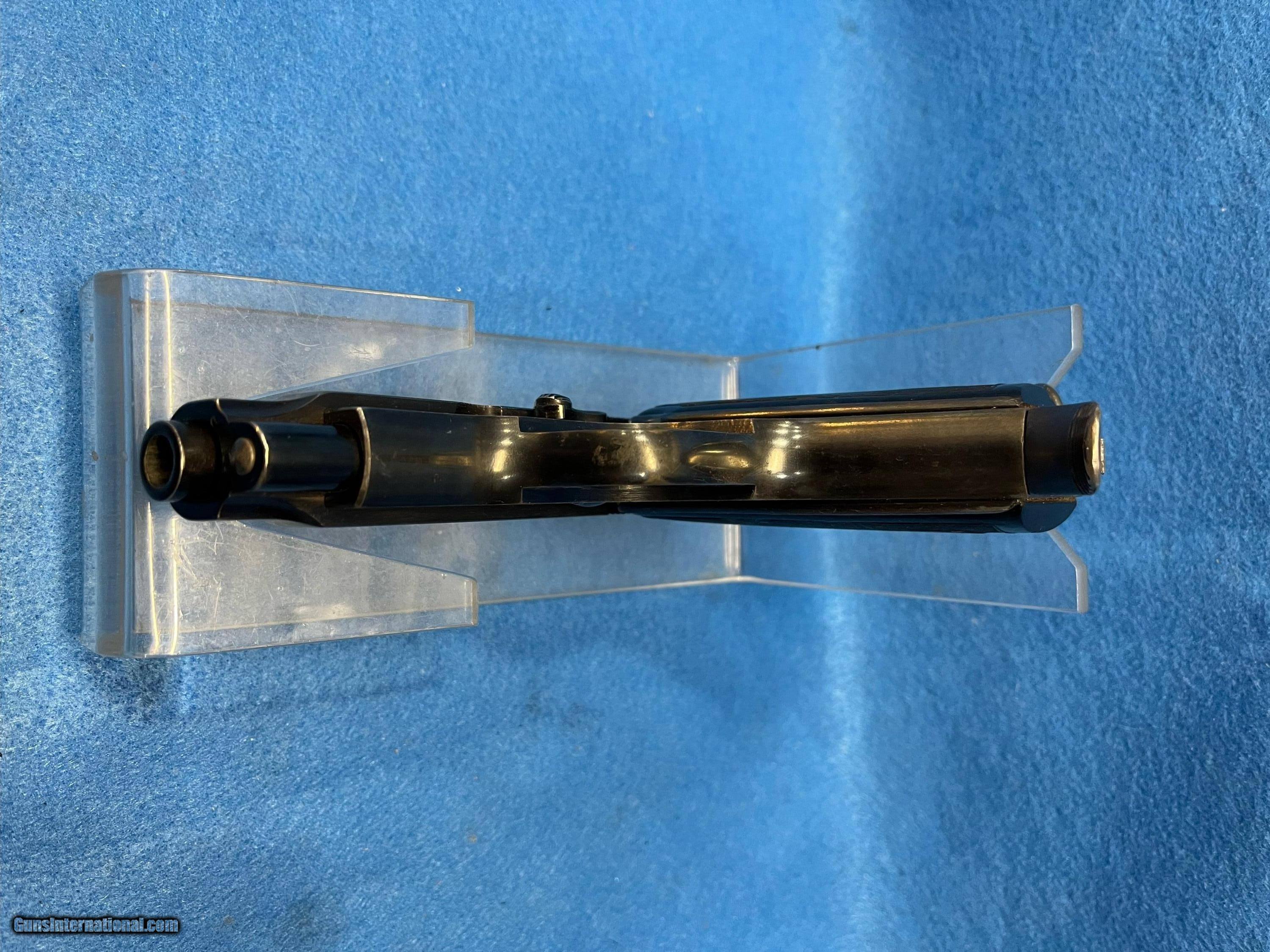 Description: SER. 445245. THIS RARE "ITALIAN NAVY" MARKED BEAUTY HAS RETAINED 98-99% 0F THE EARLY WAR HIGH POLISH FINISH. THE LEFT SIDE OF THE FRAME BELOW THE HAMMER IS STAMPED WITH AN "ANCHOR" AND "RM" IN A CIRCLE. FOR "ROYAL MARINE". THE ITALIAN NAVY PROOF. THE TINY LOSS OF FINISH THERE IS, IS DUE TO SOME VERY SLIGHT SHARP EDGE SILVERING AND A MINOR SURFACE FADING FROM A HOLSTER. THAT'S IT, NO SCRATCHES OR RUST PATCHES ANYWHERE. THE GRIP STRAPS SHOW NO SIGN OF GRAYING. ALL NUMBERS MATCH AND THE RIGHT SIDE OF FRAME ALSO HAS THE PROPER ARSENAL STAMP JUST BELOW THE ANCHOR.**.. THE BLACK PLASTIC GRIPS AND GRIP SCREW ARE FLAWLESS. THE SLIDE RAILS, BOLT FACE, FEED RAMP AND MAGAZINE FOLLOWER SHOW LITTLE IF ANY USE. THE BORE IS ABSOLUTELY PRISTINE, LASER BRIGHT WITH RAZOR SHARP RIFLING AND NOT A WHISP OF FROST ANYWHERE. IT COMES WITH ONE CORRECT FINGER GRIP MAGAZINE.THIS RARE BEAUTY WOULD PLEASE EVEN THE MOST CRITICAL INVESTOR AND CERTAINLY IS A CENTERPIECE FOR THE SERIOUS COLLECTOR. VALUE PRICED AT.... $1795.*** **THE WHITE CRAYON IS TO SHOW THE GUN IS CORRECTLY MARKED.. IT IS EASILY REMOVED WITHOUT DAMAGE WITHH A BRUSH AND LIGHTER FLUID. WE WILL DO IT ON REQUEST. *** 100% OF THE GUN'S PRICE IS SATISFACTION GUARANTEED. SOLD Handgun Caliber: .32 ACP (7.65x17mm Browning SR) |
