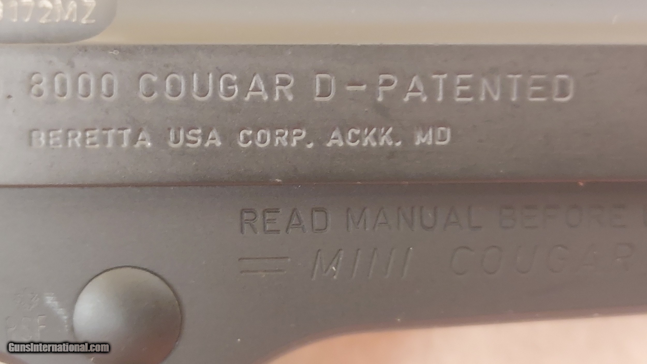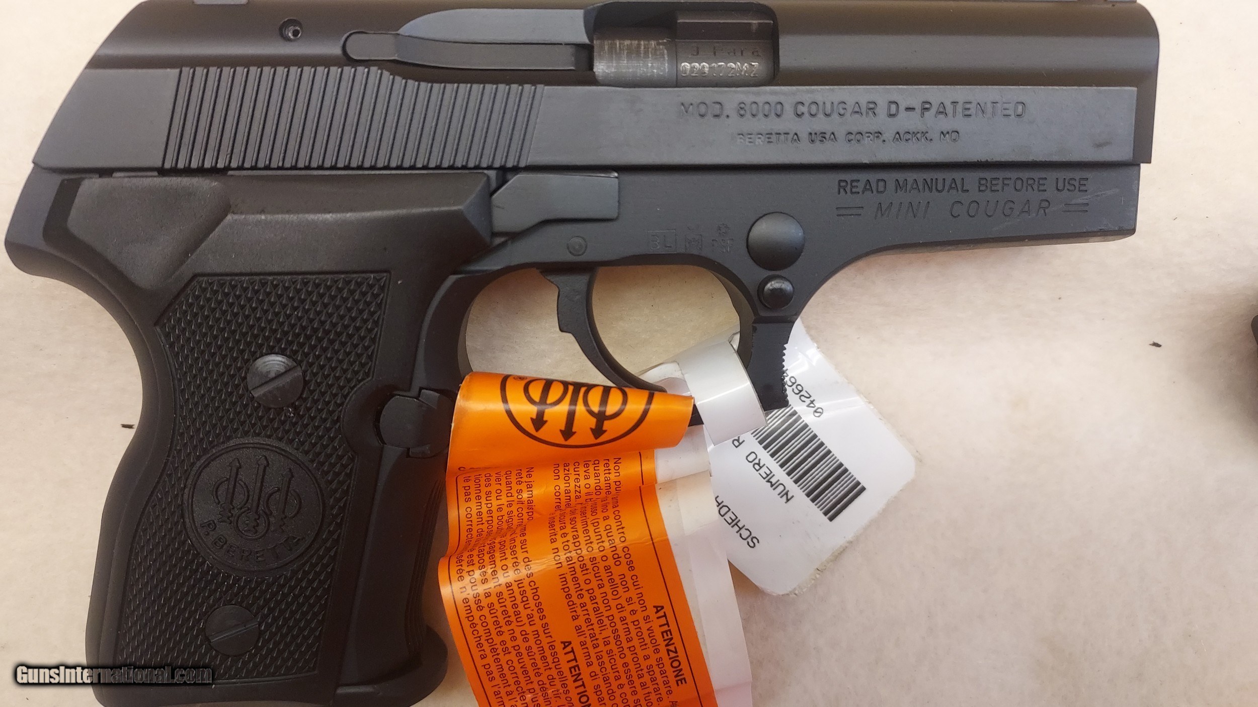 Description: Only one Beretta Model 8000 "Mini-Cougar D' (Serial number 489473) The D version, which is double action only semi-automatic pistol chambered in 9mm Parabellum. Cougar 8000 series pistols are recoil-operated, locked breech semi-automatic pistols. These pistols use a relatively rare rotating barrel locking system, in which the barrel rotates on recoil to unlock itself from the slide. The rotating motion of the barrel is controlled by the stud on its bottom, which follows the cam track in the steel frame insert. New in box, but does not have any product data. Made in Italy. They feature a 3 1/2" barrel with a steel slide, and an alloy frame with a 7" overall length and a two-finger grip, 3-dot sights, a serrated, squared trigger guard, a magazine release on the right side, and checkered black polymer 'P. Beretta" grips. An extra ten round magazine is included. They first appeared on the market in 1995 and discontinued in 2000. If you need more information or photos, please contact us. These are consignment firearms, and the owner receives the funds, so check or money order is preferred. We are an FFL Dealer so please be aware of your Federal & State laws before buying. Buyer pays exact shipping & insurance cost for shipment of firearm. SOLD Handgun Caliber: 9x19mm Parabellum (9mm Luger, 9x19mm NATO) Manufacturer: Beretta Model: 8000 D Serial Number: 489473/489475 Condition: New Metal Condition: New Action: DAO Extras: 10 RD MAG |
