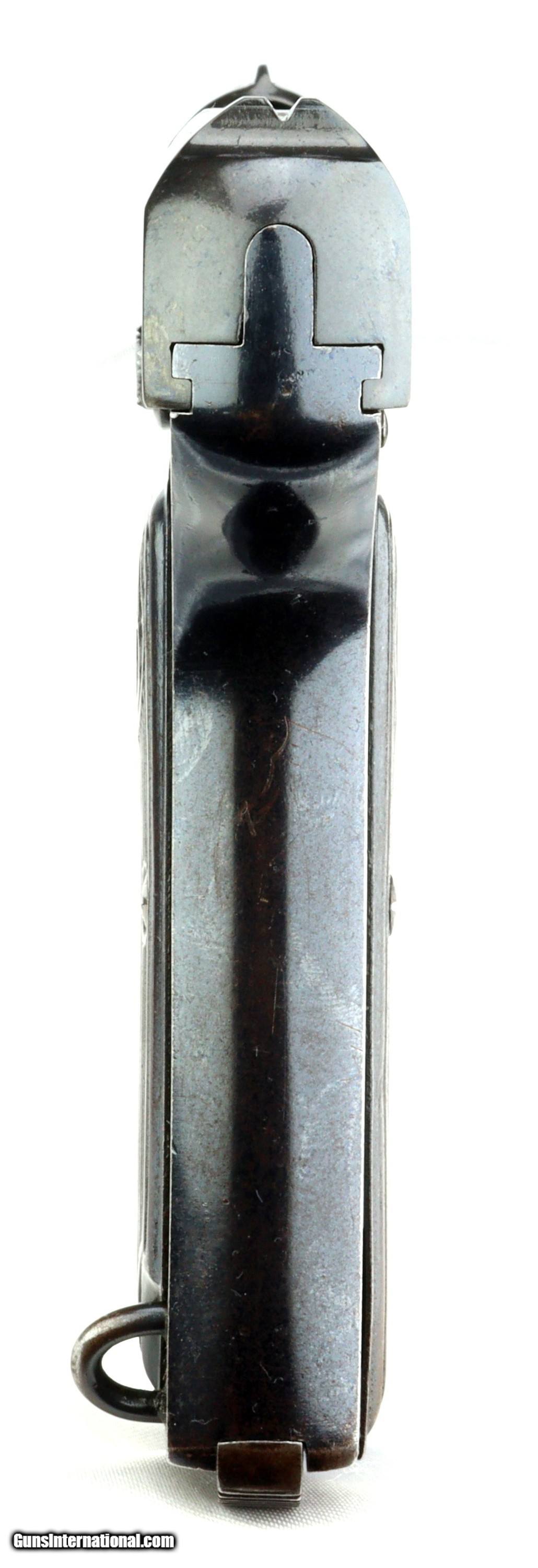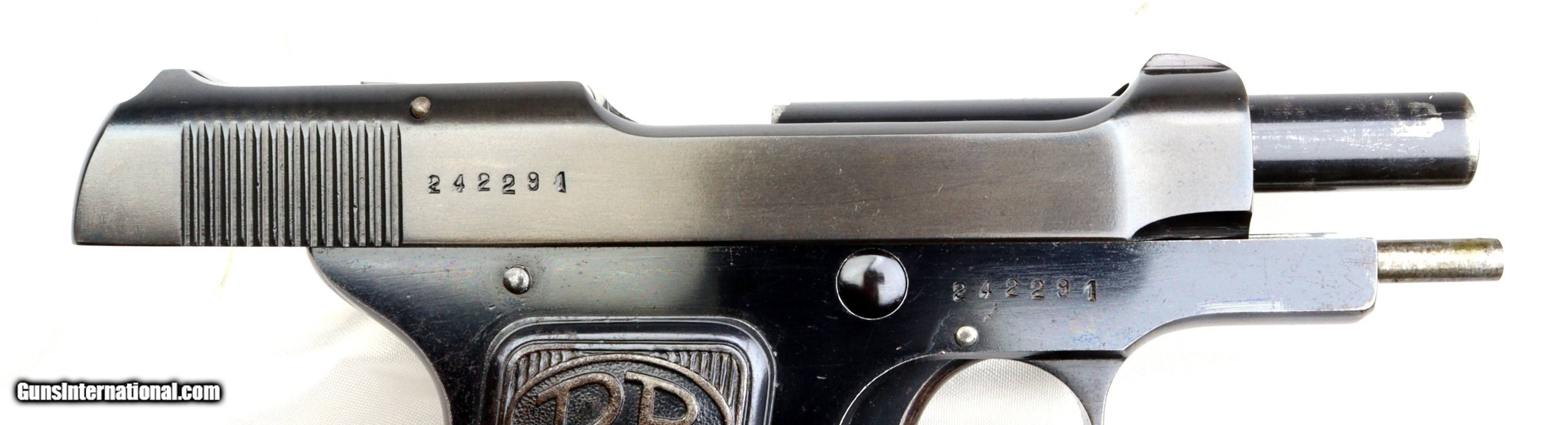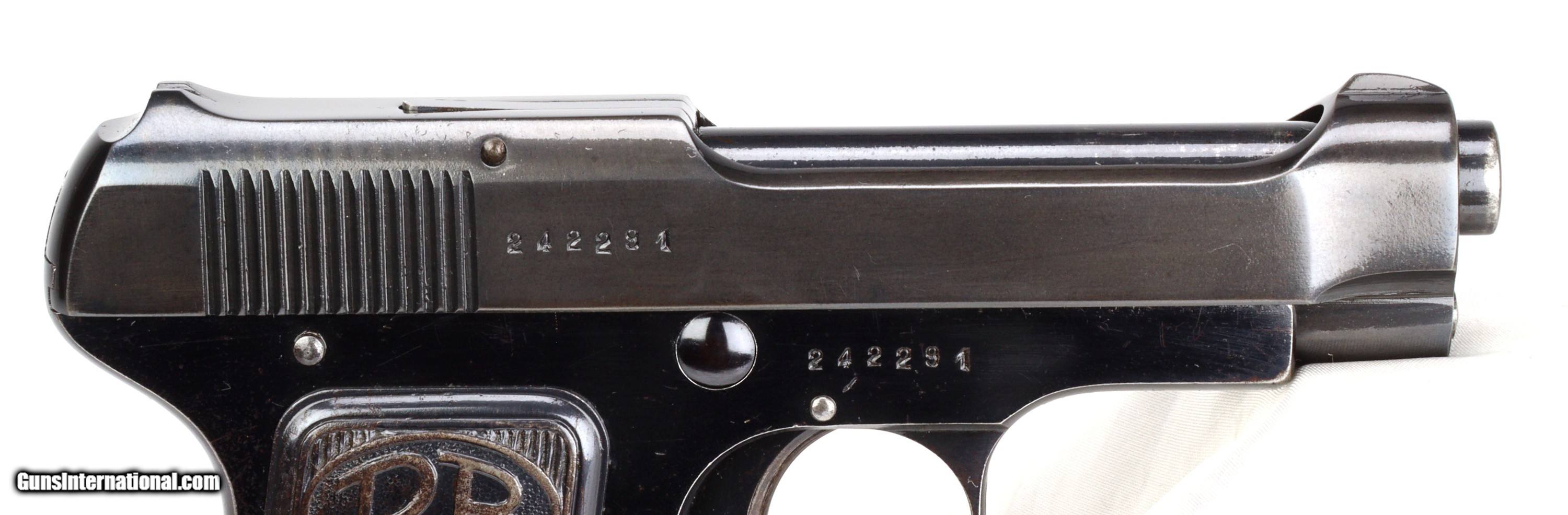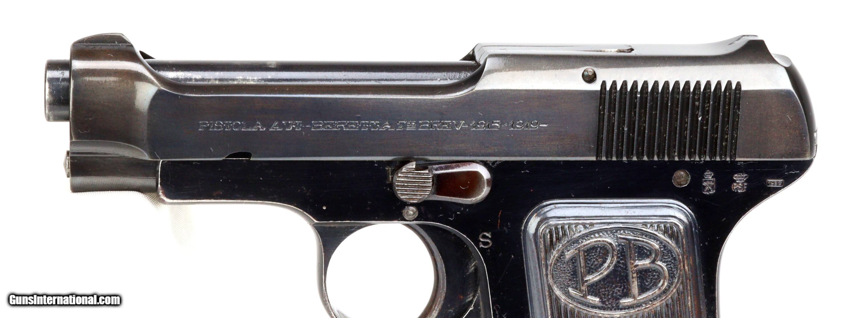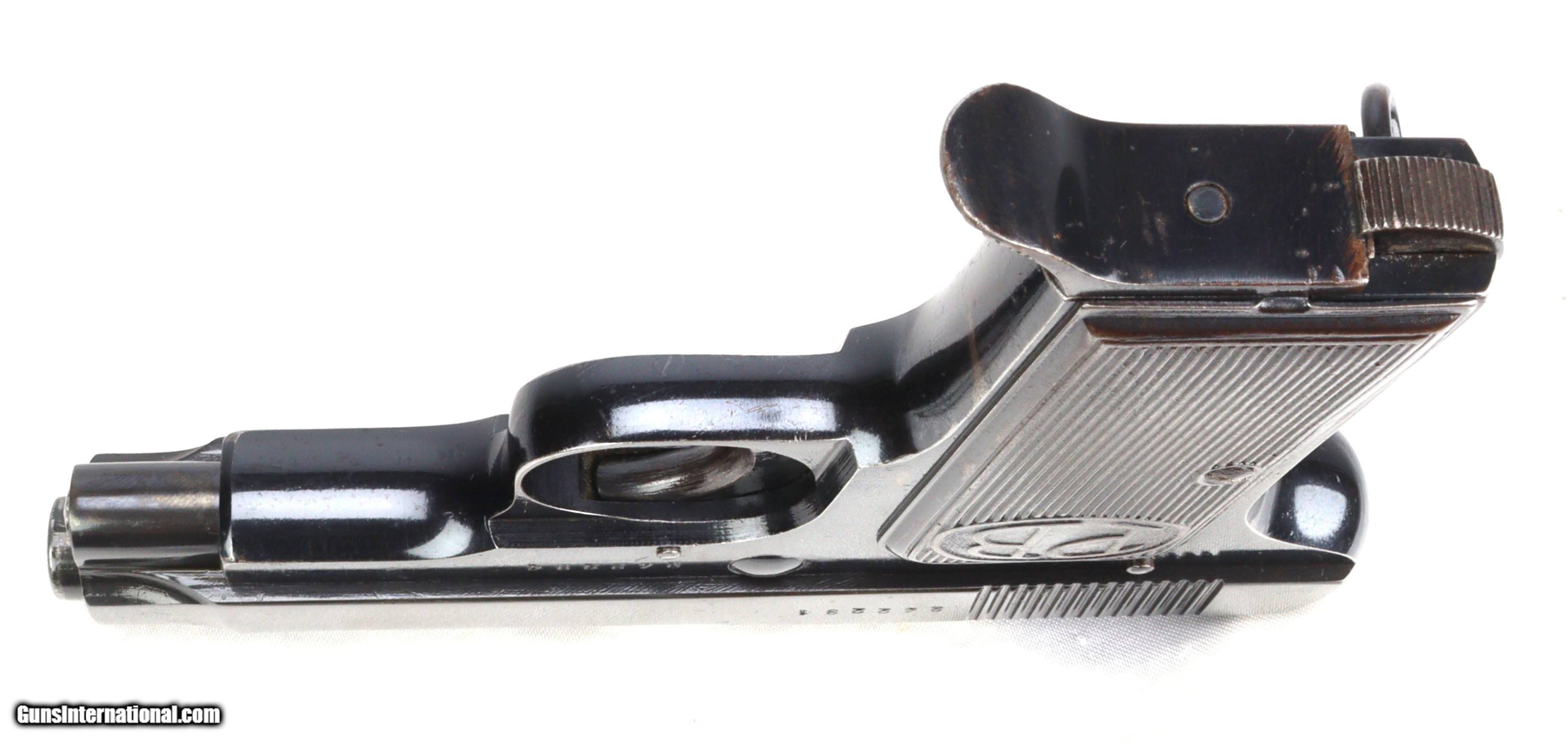 Description: In 90%+ mint sharp condition, we have a quite rare and seldom seen Beretta model 1915/1919 (Sometimes called the Model 1922) 7.65mm pocket pistol that was made in the late 1920’s to early 1930's. The pistol is all matching with a VG BORE, SHIPS WITH 2 MAGAZINES and very typical of Beretta’s the slide has turned a lovely shade of plum. This is more pronounced depending on how you hold the pistol. The plum color that you see on so many of the Pre war Beretta’s was caused by the very high nickel content of the steel used in the manufacture of the slides, which over time alters the color of the blueing used at the factory. The Model 1915 /1919 was another development in the lineage of what ultimately became the model 1934/35 Berettas, Certainly one of the more interesting and desirable Beretta’s, they are highly sought after and this example is in top condition which is rarely ever found. Pistols such as this would have been used by the early Italian Fascists on their rise to power in Italy and they would have certainly seen officer use in WWII. S/N: 242231 BBL: 3.25" MAG: 7 WT: 21oz TRIGGER: 7.5lbs Very nice blued finish with black metal grooved grips with an oval "PB" logo at the top. BORE still has good rifling, is slightly frosted but has no visible pitting. ships insured to the lower 48 for $45.00. SHOOTERSEXCHANGEdotCOM SOLD Handgun Caliber: .32 ACP (7.65x17mm Browning SR) Manufacturer: Beretta Model: 1922 Serial Number: 242231 Barrel Length: 3.25 Condition: VG to Excellent Metal Condition: VG to Excellent Bore Condition: VG to Excellent For Age Triggers: 7.5lbs Weight: 21oz |