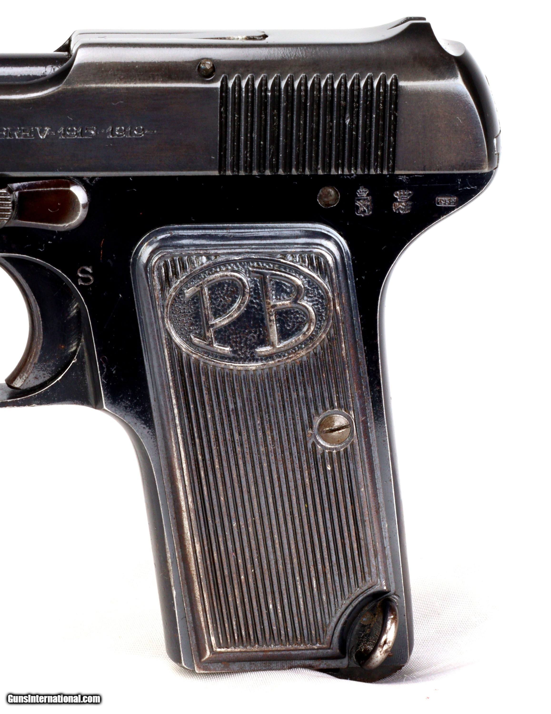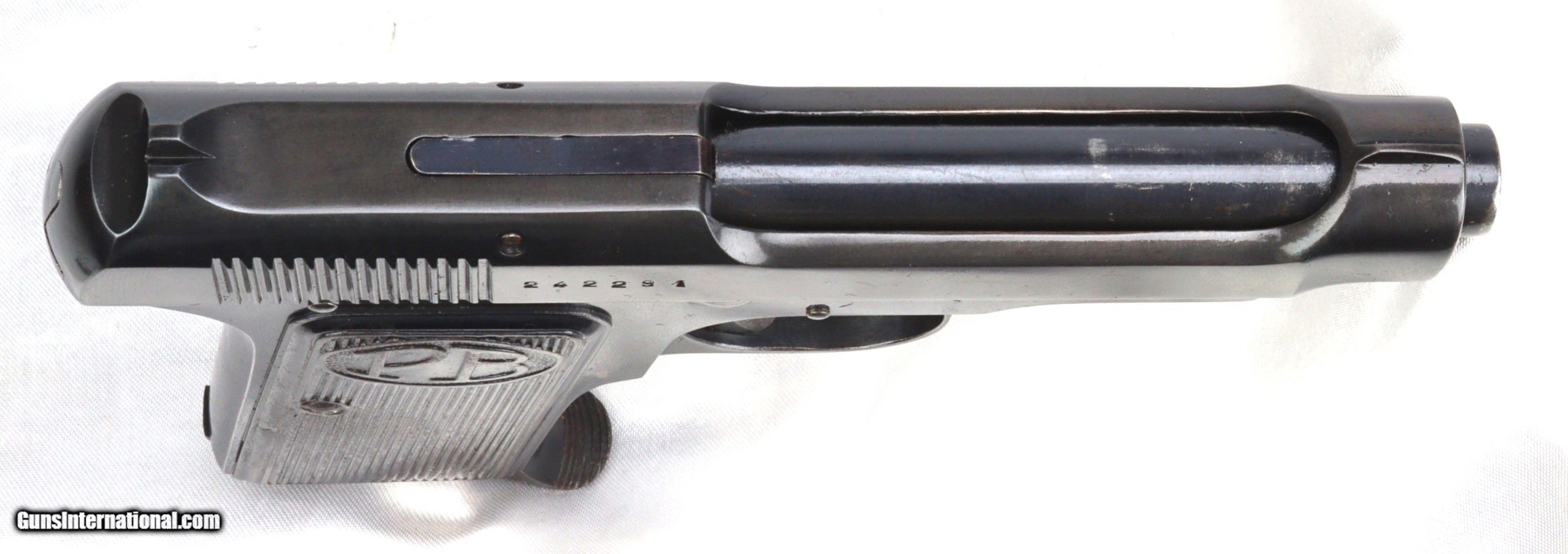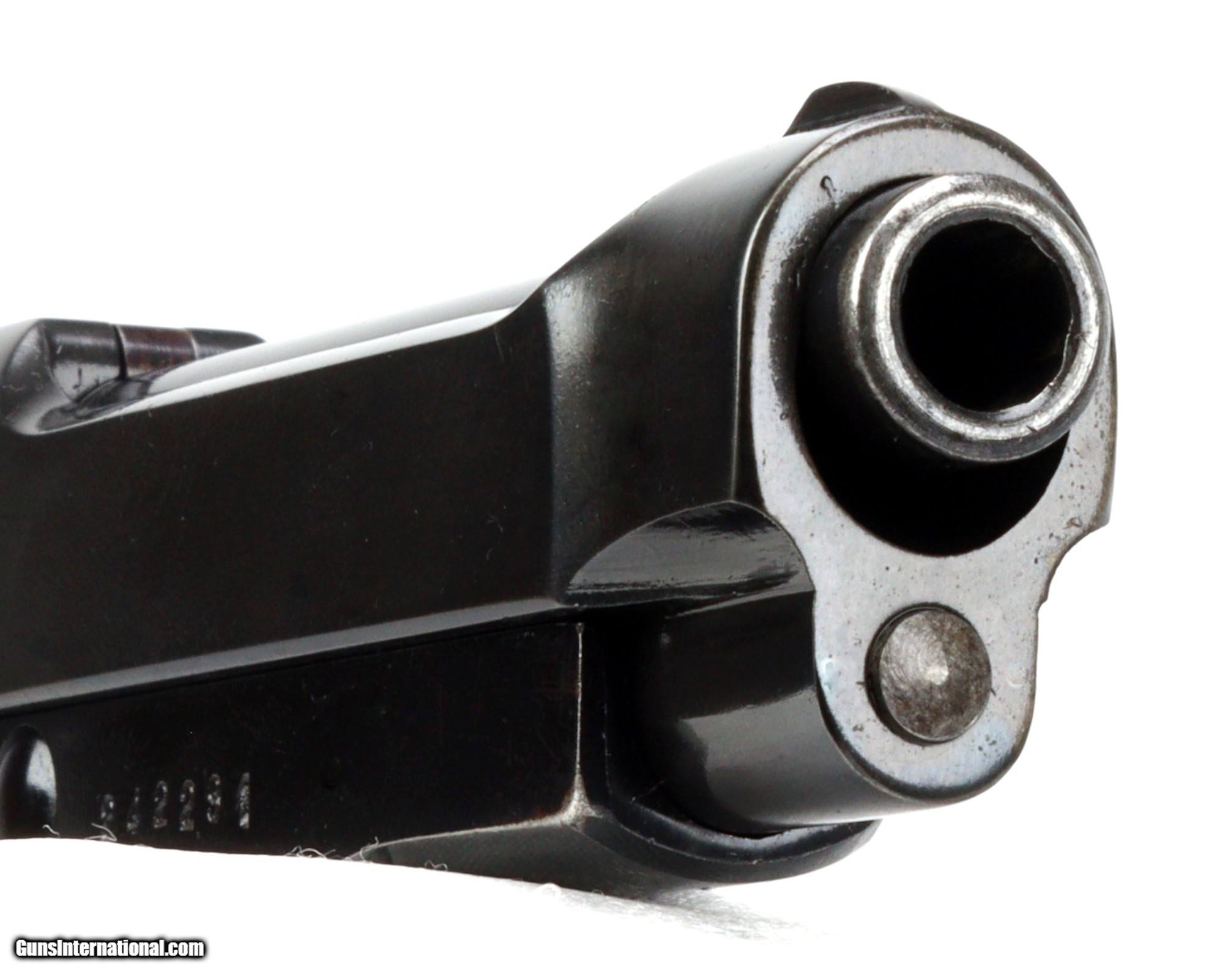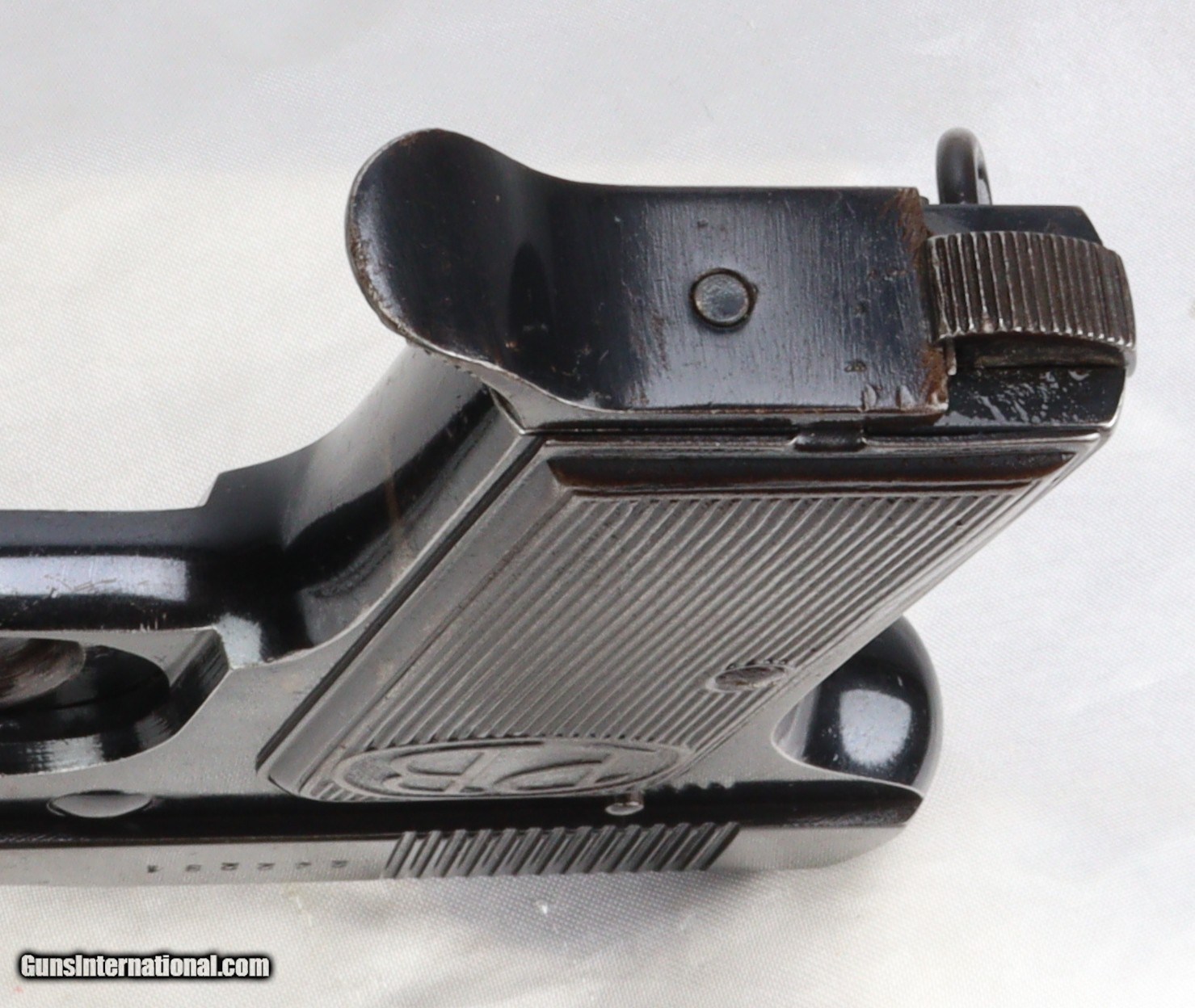 Description: In 90%+ mint sharp condition, we have a quite rare and seldom seen Beretta model 1915/1919 (Sometimes called the Model 1922) 7.65mm pocket pistol that was made in the late 1920’s to early 1930's. The pistol is all matching with a VG BORE, SHIPS WITH 2 MAGAZINES and very typical of Beretta’s the slide has turned a lovely shade of plum. This is more pronounced depending on how you hold the pistol. The plum color that you see on so many of the Pre war Beretta’s was caused by the very high nickel content of the steel used in the manufacture of the slides, which over time alters the color of the blueing used at the factory. The Model 1915 /1919 was another development in the lineage of what ultimately became the model 1934/35 Berettas, Certainly one of the more interesting and desirable Beretta’s, they are highly sought after and this example is in top condition which is rarely ever found. Pistols such as this would have been used by the early Italian Fascists on their rise to power in Italy and they would have certainly seen officer use in WWII. S/N: 242231 BBL: 3.25" MAG: 7 WT: 21oz TRIGGER: 7.5lbs Very nice blued finish with black metal grooved grips with an oval "PB" logo at the top. BORE still has good rifling, is slightly frosted but has no visible pitting. ships insured to the lower 48 for $45.00. SHOOTERSEXCHANGEdotCOM SOLD Handgun Caliber: .32 ACP (7.65x17mm Browning SR) Manufacturer: Beretta Model: 1922 Serial Number: 242231 Barrel Length: 3.25 Condition: VG to Excellent Metal Condition: VG to Excellent Bore Condition: VG to Excellent For Age Triggers: 7.5lbs Weight: 21oz |