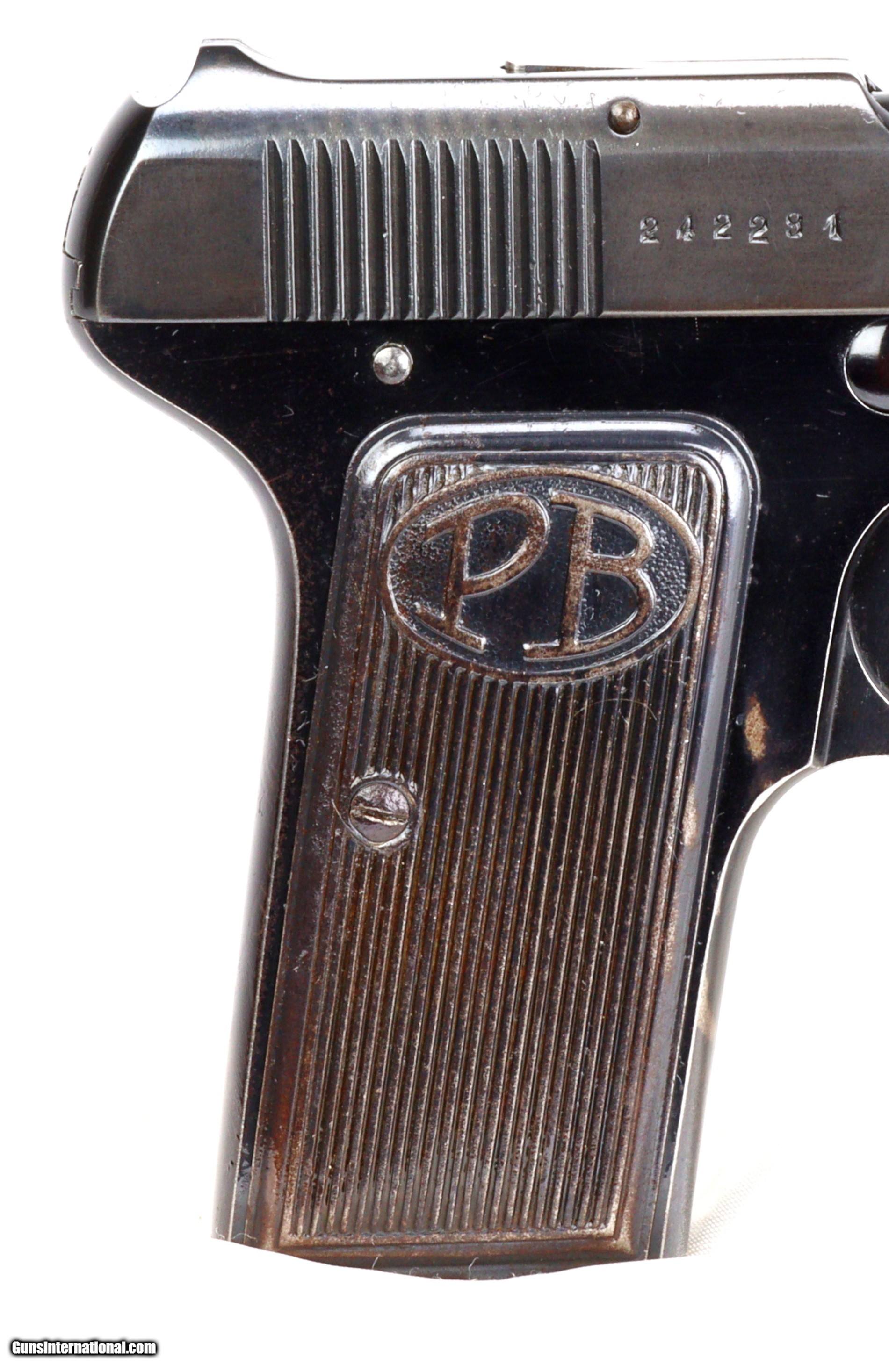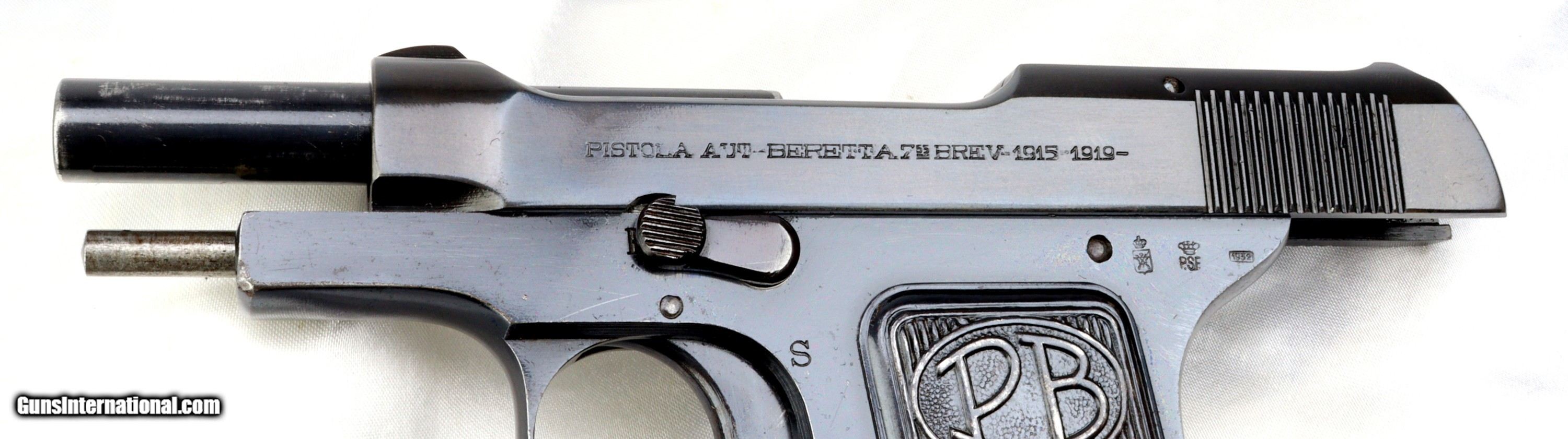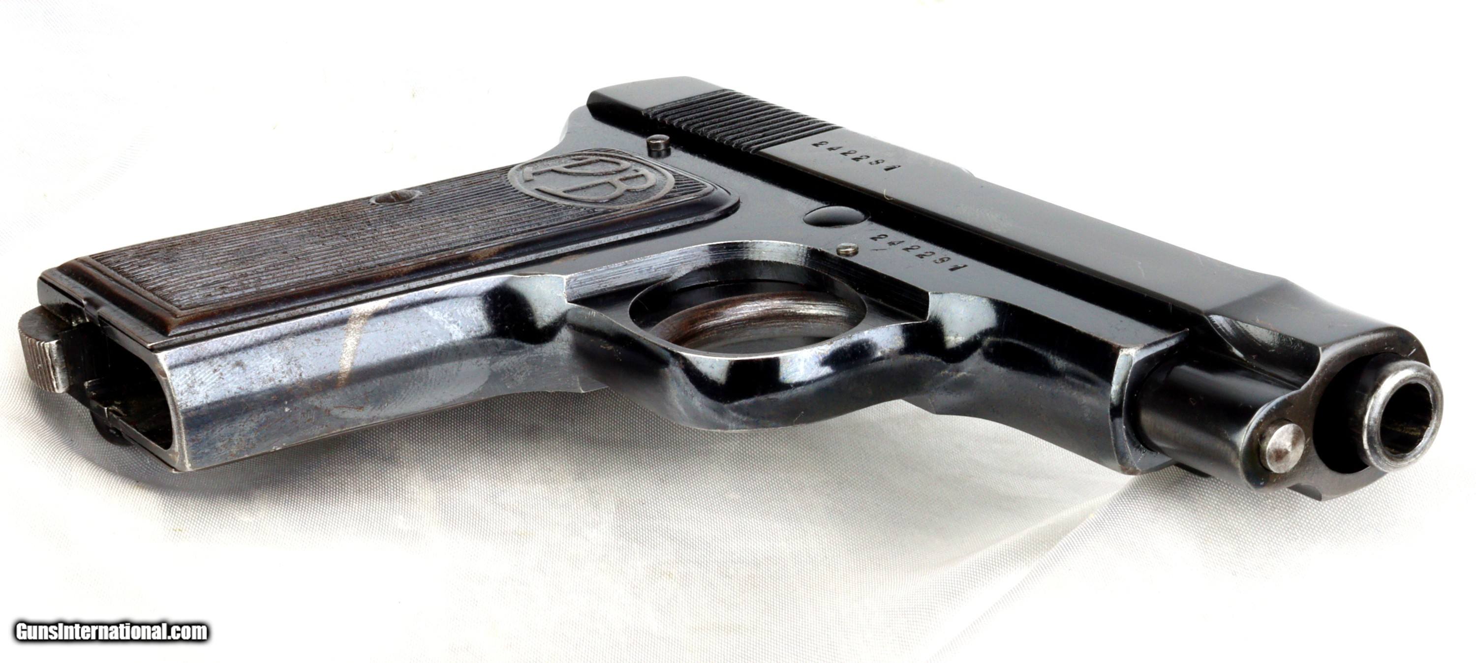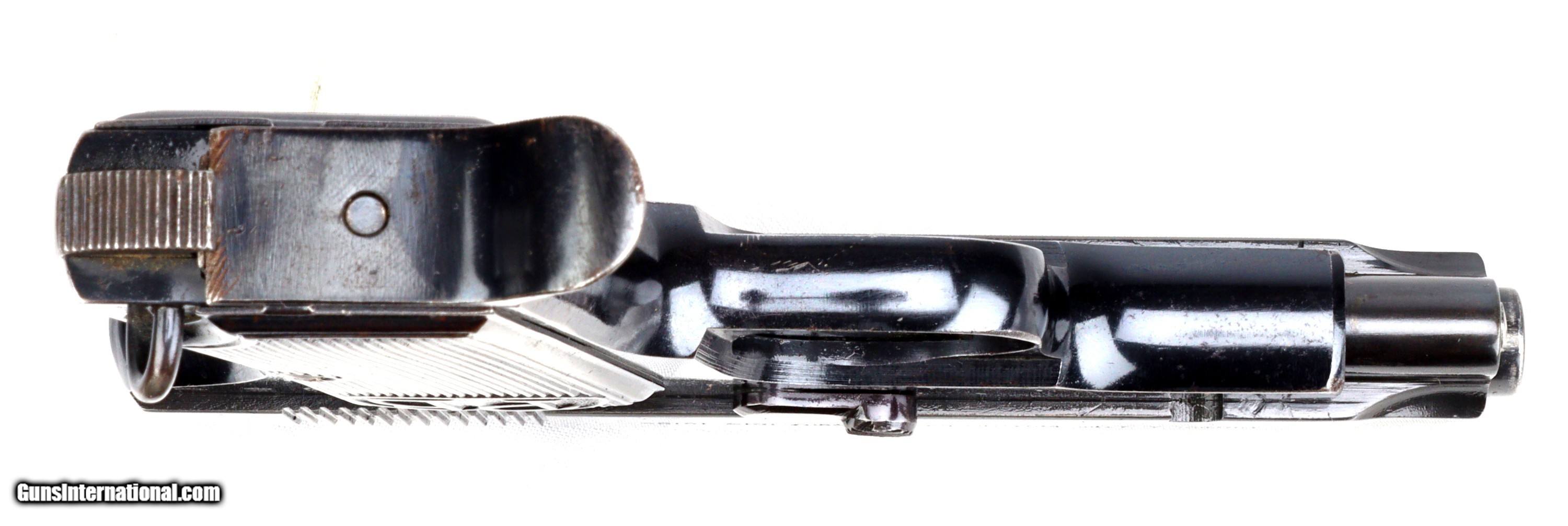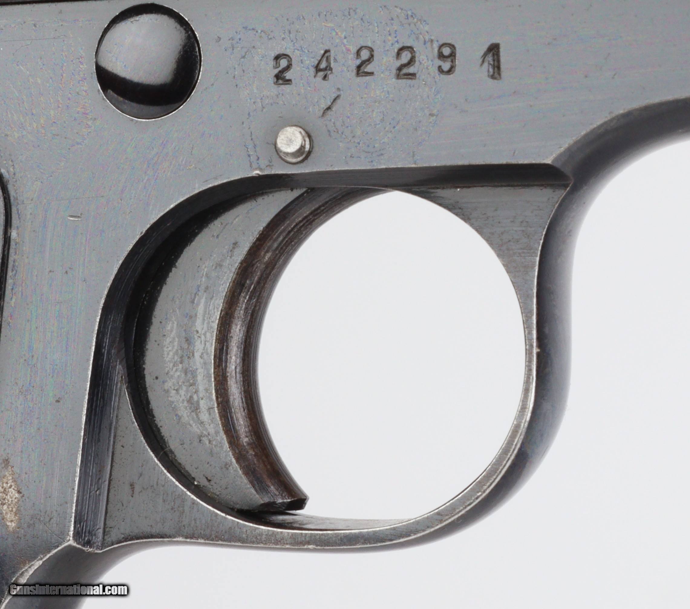 Description: In 90%+ mint sharp condition, we have a quite rare and seldom seen Beretta model 1915/1919 (Sometimes called the Model 1922) 7.65mm pocket pistol that was made in the late 1920’s to early 1930's. The pistol is all matching with a VG BORE, SHIPS WITH 2 MAGAZINES and very typical of Beretta’s the slide has turned a lovely shade of plum. This is more pronounced depending on how you hold the pistol. The plum color that you see on so many of the Pre war Beretta’s was caused by the very high nickel content of the steel used in the manufacture of the slides, which over time alters the color of the blueing used at the factory. The Model 1915 /1919 was another development in the lineage of what ultimately became the model 1934/35 Berettas, Certainly one of the more interesting and desirable Beretta’s, they are highly sought after and this example is in top condition which is rarely ever found. Pistols such as this would have been used by the early Italian Fascists on their rise to power in Italy and they would have certainly seen officer use in WWII. S/N: 242231 BBL: 3.25" MAG: 7 WT: 21oz TRIGGER: 7.5lbs Very nice blued finish with black metal grooved grips with an oval "PB" logo at the top. BORE still has good rifling, is slightly frosted but has no visible pitting. ships insured to the lower 48 for $45.00. SHOOTERSEXCHANGEdotCOM SOLD Handgun Caliber: .32 ACP (7.65x17mm Browning SR) Manufacturer: Beretta Model: 1922 Serial Number: 242231 Barrel Length: 3.25 Condition: VG to Excellent Metal Condition: VG to Excellent Bore Condition: VG to Excellent For Age Triggers: 7.5lbs Weight: 21oz |