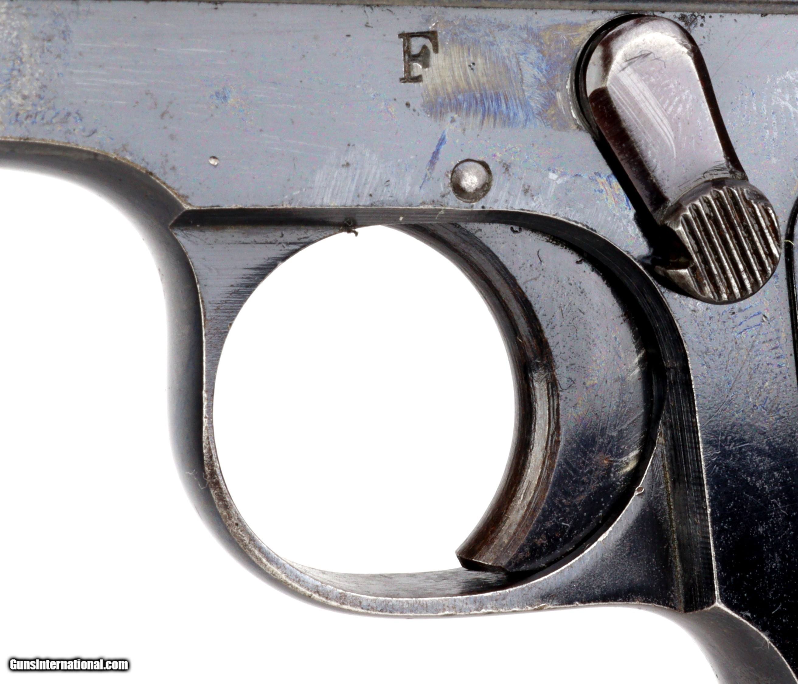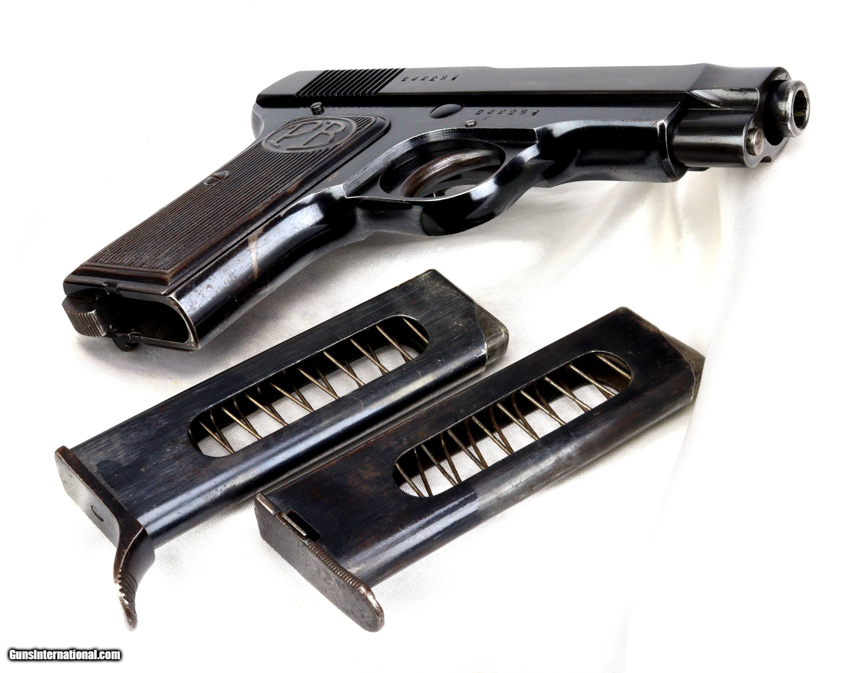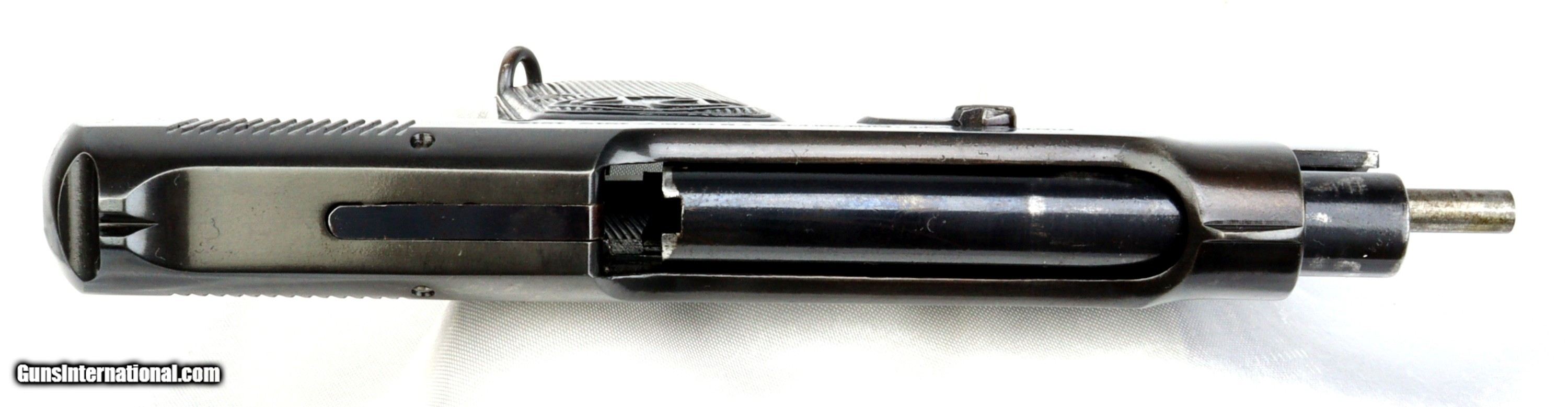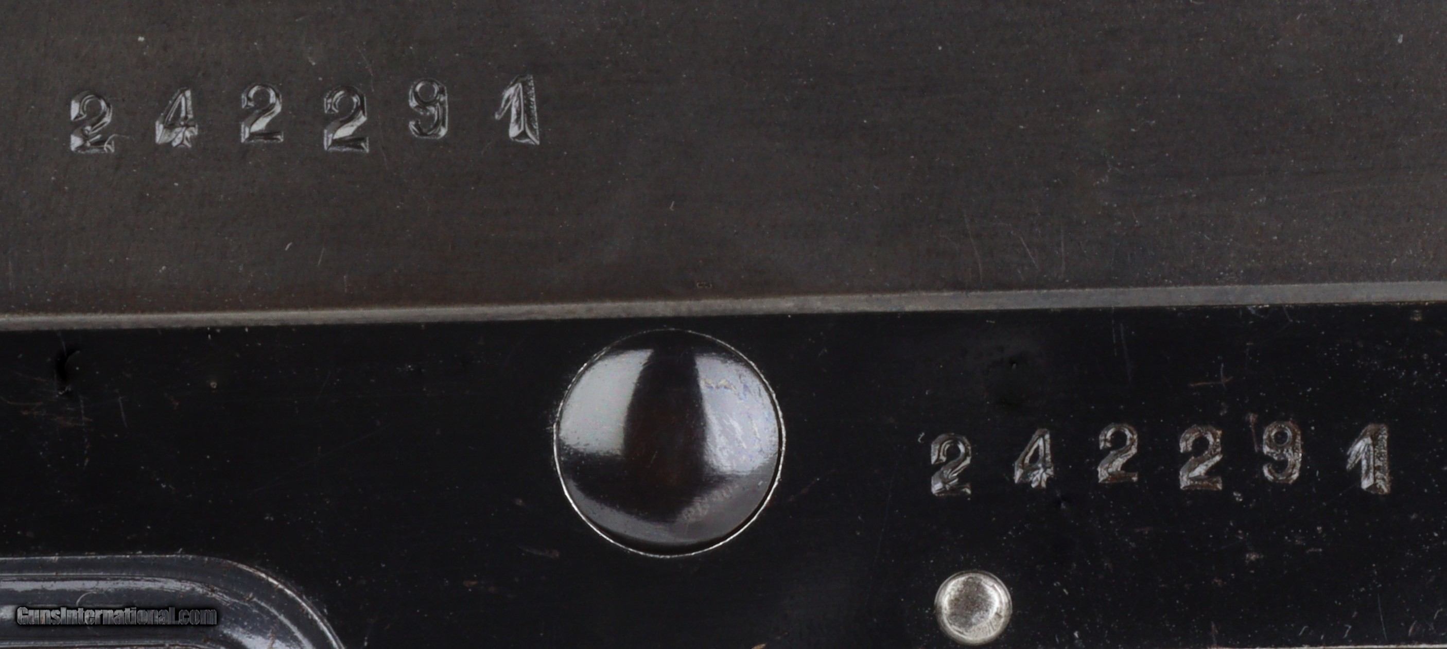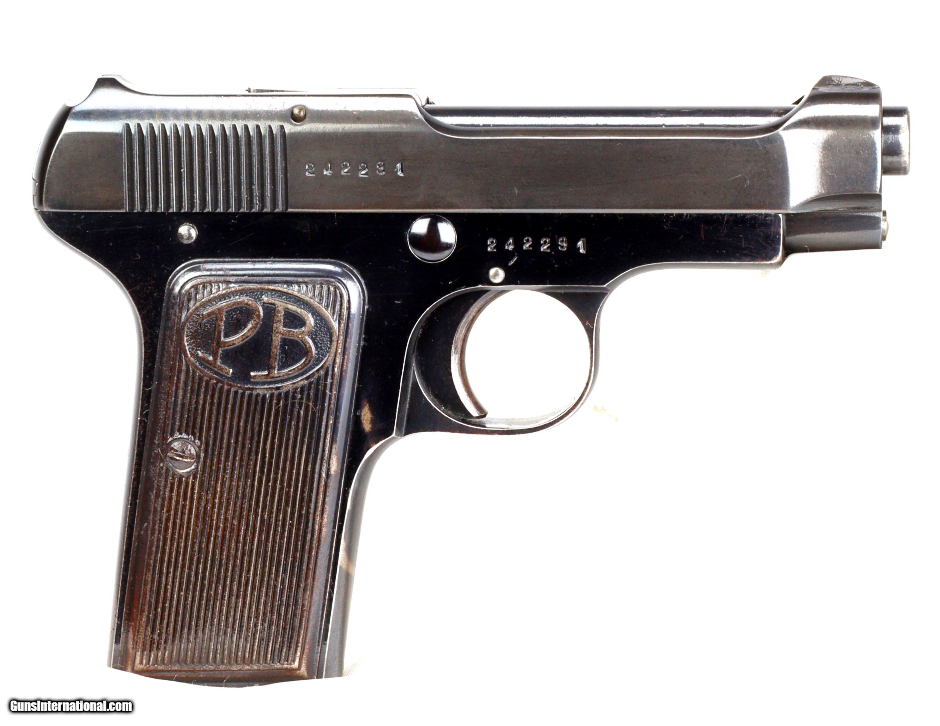 Description: In 90%+ mint sharp condition, we have a quite rare and seldom seen Beretta model 1915/1919 (Sometimes called the Model 1922) 7.65mm pocket pistol that was made in the late 1920’s to early 1930's. The pistol is all matching with a VG BORE, SHIPS WITH 2 MAGAZINES and very typical of Beretta’s the slide has turned a lovely shade of plum. This is more pronounced depending on how you hold the pistol. The plum color that you see on so many of the Pre war Beretta’s was caused by the very high nickel content of the steel used in the manufacture of the slides, which over time alters the color of the blueing used at the factory. The Model 1915 /1919 was another development in the lineage of what ultimately became the model 1934/35 Berettas, Certainly one of the more interesting and desirable Beretta’s, they are highly sought after and this example is in top condition which is rarely ever found. Pistols such as this would have been used by the early Italian Fascists on their rise to power in Italy and they would have certainly seen officer use in WWII. S/N: 242231 BBL: 3.25" MAG: 7 WT: 21oz TRIGGER: 7.5lbs Very nice blued finish with black metal grooved grips with an oval "PB" logo at the top. BORE still has good rifling, is slightly frosted but has no visible pitting. ships insured to the lower 48 for $45.00. SHOOTERSEXCHANGEdotCOM SOLD Handgun Caliber: .32 ACP (7.65x17mm Browning SR) Manufacturer: Beretta Model: 1922 Serial Number: 242231 Barrel Length: 3.25 Condition: VG to Excellent Metal Condition: VG to Excellent Bore Condition: VG to Excellent For Age Triggers: 7.5lbs Weight: 21oz |