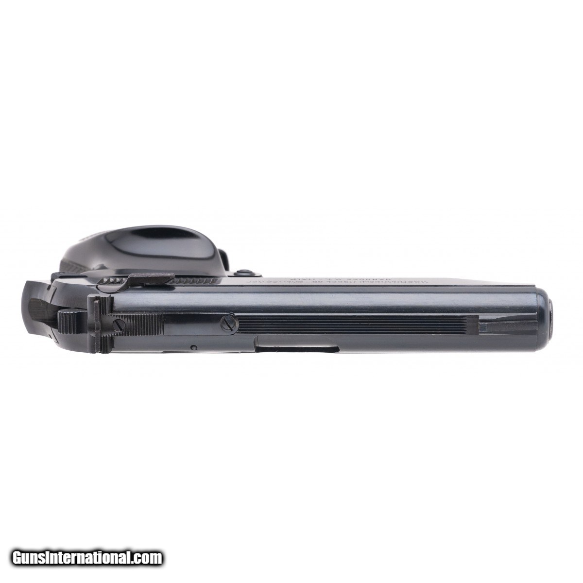 SN: 03982.Made in 1975. .32 with a 3.5" barrel. Bore is excellent with strong rifling. Steel frame pistol with adjustable rear sights. Finish is in very good condition. Thumbrest grips show minimal wear. Action functions properly. Pistol comes with box, paperwork, and extra magazine. Overall very good condition.