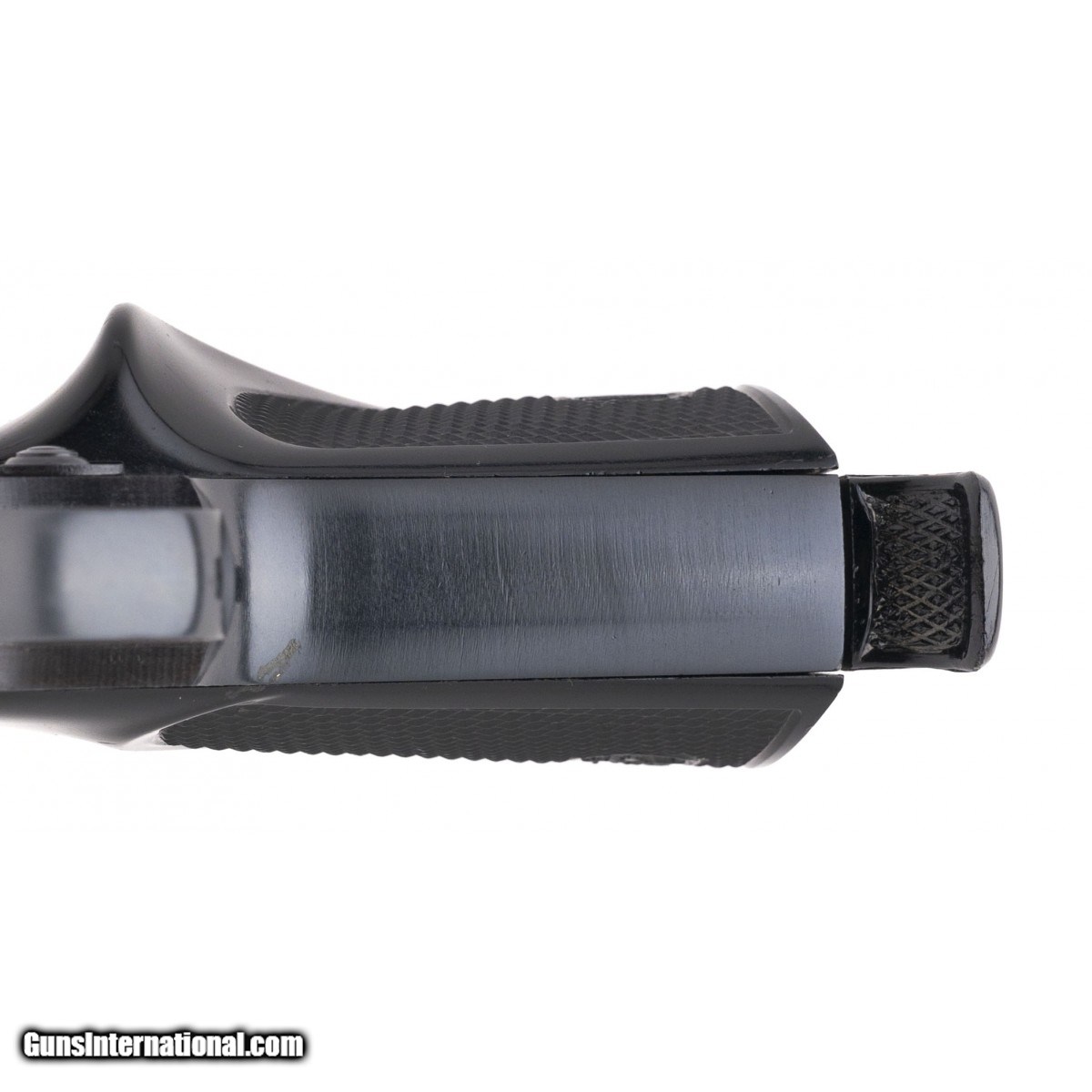 Description: " SN: 03982.Made in 1975. .32 with a 3.5" barrel. Bore is excellent with strong rifling. Steel frame pistol with adjustable rear sights. Finish is in very good condition. Thumbrest grips show minimal wear. Action functions properly. Pistol comes with box, paperwork, and extra magazine. Overall very good condition. SOLD |