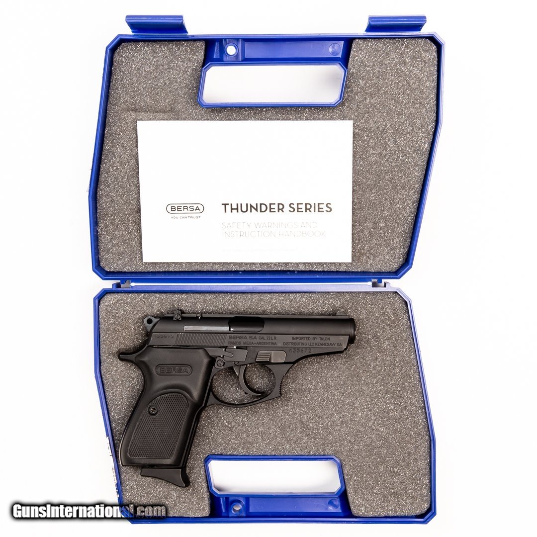 Description: Guns Listing ID: 334216 This Bersa Thunder features one 10-round magazine. SOLD Manufacturer: BERSA Model: THUNDER 22 Caliber Info: .22 LR Condition: Used - Non-Certified Barrels: 3.5 BARREL Action: SEMI AUTOMATIC Finish: BLACK Weight: 1.2 lbs. |