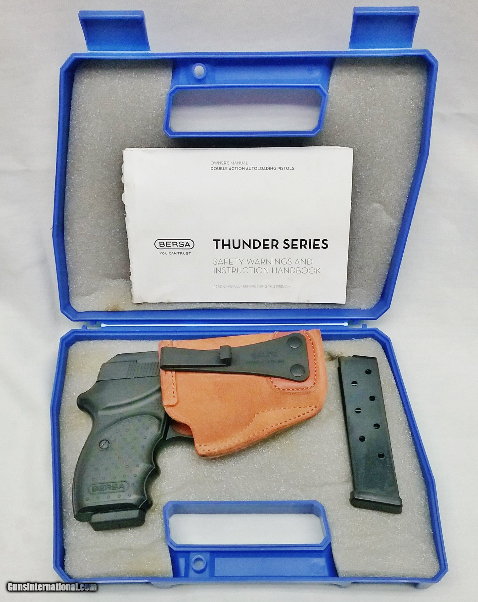Description: This .380 ACP Bersa Thunder has a 3-1/4” blued barrel and matte slide mounted with fixed 3 dot sights. The bore is very good. The left side of the slide is stamped with manufacturer and model information. The black steel frame has textured polymer grips bearing the Bersa name on both sides. This pistol is in very good condition. Pistol comes with two 8-round magazines, a Galco leather holster and the factory case with papers. The weight is 13 oz. Our stock number is A885. Will ship to any FFL anywhere in the United States. Buyer pays freight and insurance. SOLD Manufacturer: Bersa Model: Thunder Caliber Info: .380 ACP Bore: Rifled Condition: Very Good Metal Condition: Very Good Bore Condition: Very Good Barrels: One Action: Semi-Automatic Triggers: One Finish: Blued Weight: 13 oz Sights: Fixed 3 dot Case: Yes Item Location: OR |