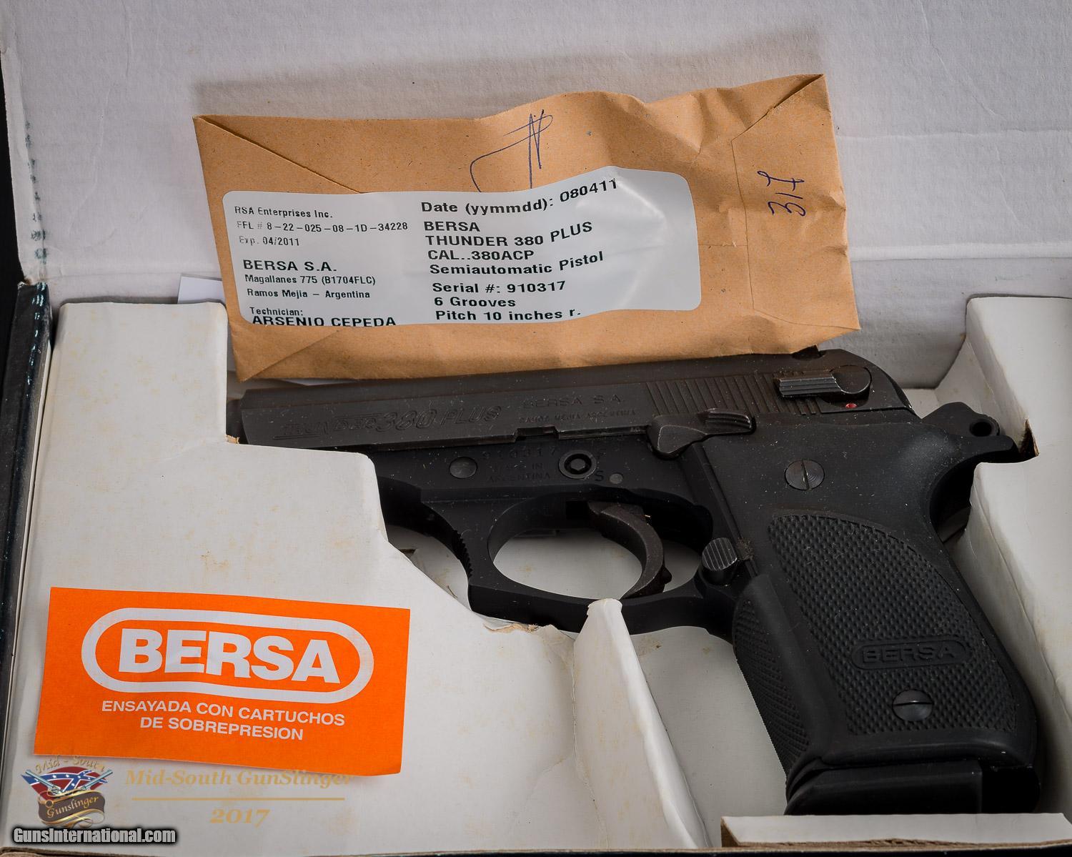 Description: Presented for sale, you will find a Bersa Thunder 380 Plus pistol chambered for 380 Auto. This Thunder 380 Plus is factory new and priced to sell. This pistol is factory new. The images will illustrate this pistol much better than I can describe. Included in the listing is the Bersa Thunder 380 plus, one (1) fifteen (15) round magazine, trigger lock, fired case, instruction manual, warranty card and OEM case. This pistol will ship via FedEx Express Standard Overnight to the lower 48 for $39.95. Thank you for looking. Our phones are answered 24/7 by a human that speaks English. Mid-South GunSlinger Will Sell Your Guns for You!!!