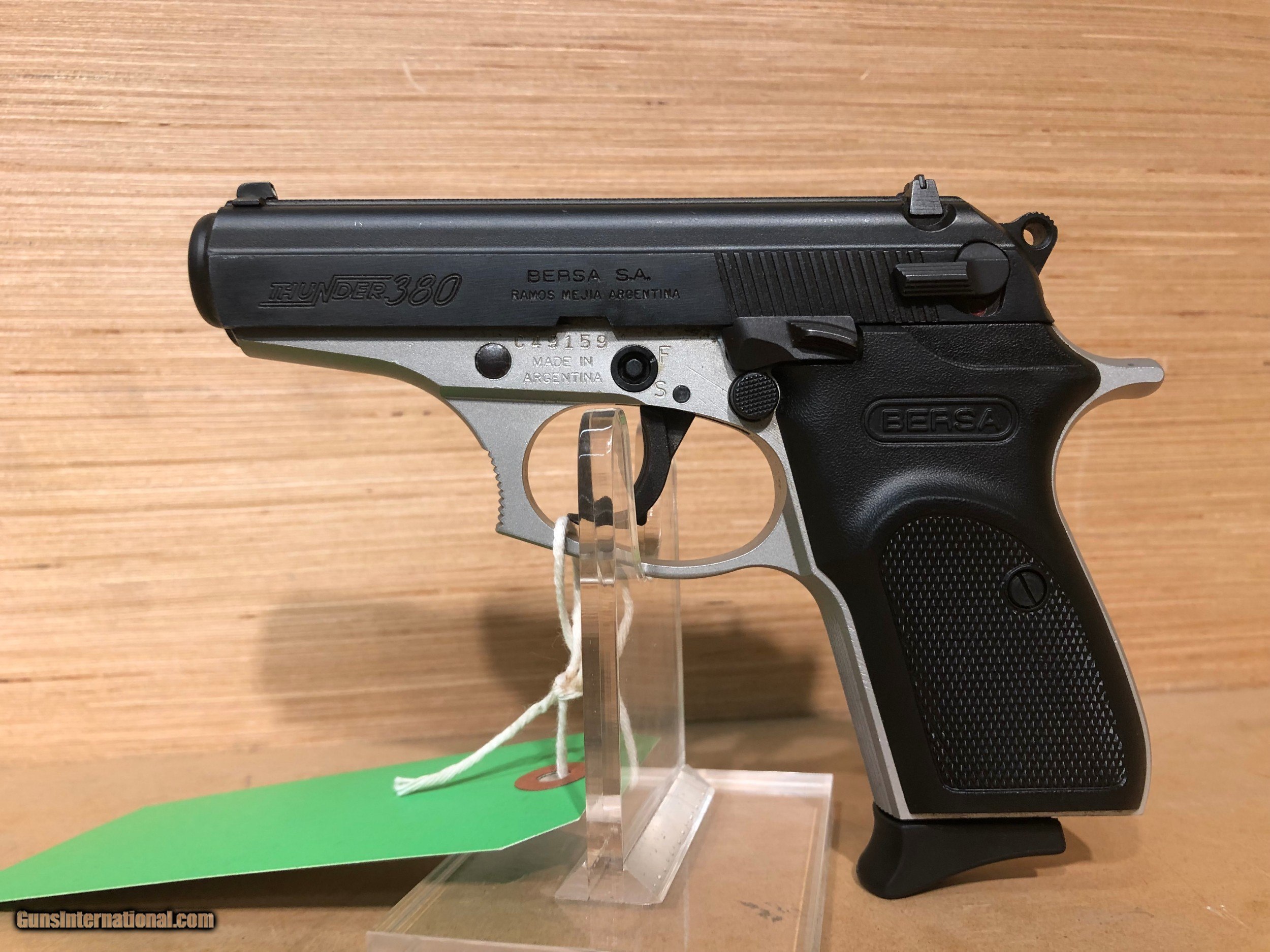 Description: USED IN GOOD CONDITION Bersa Thunder 380 Standard Pistol, 380 ACP, 3.5", Black Checkered Grips, Nickel / Matte Finish, 8 Rds ****PLEASE CALL IN THE WITH THE SELLER’S INVENTORY NUMBER IF INQUIRING ABOUT A FIREARM****** WE DO NOT SHIP FIREARMS AND/OR FIREARMS’ PARTS OUT OF THE 50 UNITED STATES, SO DON’T ASK PRICE REFLECTS PAYMENT BY MONEY ORDER / CASHIERS CHECK. A 3% PREMIUM IS ADDED FOR CREDIT CARDS. WE DO ACCEPT PERSONAL OR BUSINESS CHECKS, BUT THERE IS A 10 DAY GRACE PERIOD ON THEM. Shipping is $40 for handgun and $30 for long gun. Shipping to Alaska and Hawaii will be more based on weight of firearm. WE DO OFFER A LAYAWAY PLAN. YOU CAN LAYAWAY FOR 30, 60, OR 90 DAYS. THERE IS A $5.00 CHARGE FOR EVERY 30 DAYS ITEM IS ON LAYAWAY. WE ALSO REQUIRE A 20% DOWN PAYMENT ON LAYAWAY ITEM. LAYAWAYS ARE NON REFUNDABLE. HERE IS HOW THIS PROCESS WORKS. YOU WOULD CALL US AT 540-337-9218 WITH LISTER # TO PURCHASE THE GUN. THEN ONCE I HAVE RECEIVED PAYMENT AND AN FFL (FEDERAL FIREARMS LICENSE) FROM A LICENSED DEALER IN YOUR AREA OF YOUR CHOICE. WE WILL THEN SHIP THE GUN TO THEM. YOU WOULD THEN PICK UP THE GUN AT YOUR LOCAL DEALER AND DO PAPER WORK THERE. Please have your FFL Dealers contact information when you call. DOMINION OUTDOORS 15 ANGELA COURT FISHERSVILLE ,VA 22939 540-337-9218 540-337-2422 fax M – F 9 to 6 ETZ Sat 9 – 4 ETZ ****PLEASE CALL IN WITH THE SELLER’S INVENTORY NUMBER**** ***PLANO HARD CASES AVAIABLE FOR PURCHASE $19.99 WITH THE PURCHASE OF A FIREARM.** SOLD |