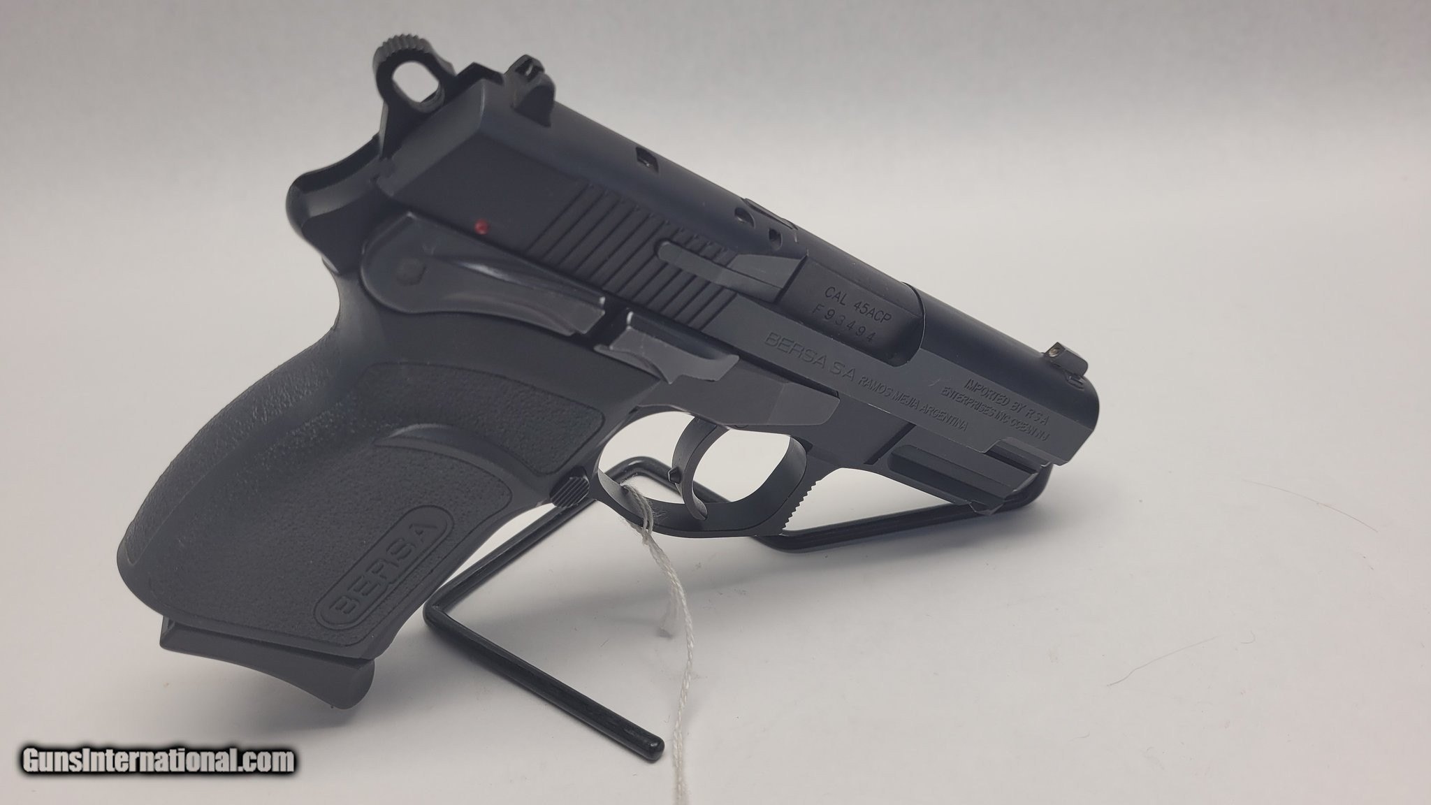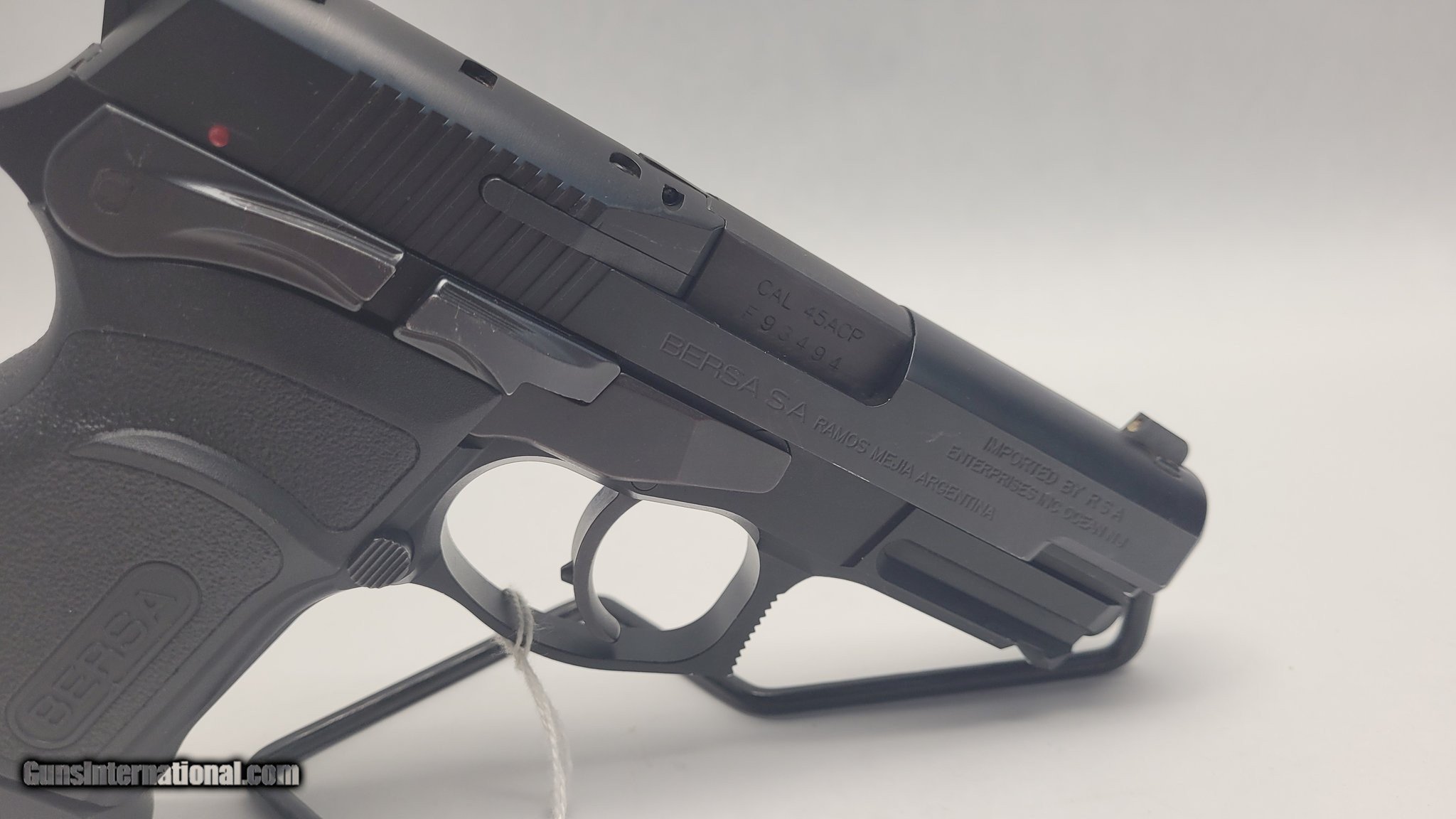Description: Guns Listing ID: 580484 Model: Bersa Thunder 45 Ultra-Compact PRO. Caliber: .45 ACP. Barrel length: 3.6 in (commonly listed for the .45 UC Pro). Capacity: 7 + 1 (7-round magazine + 1 in chamber) — includes one 7-round factory magazine. Action: Double-action / single-action (DA/SA) with decocker/safety on PRO models. Frame / slide: Alloy frame with stainless/steel slide; PRO finish options include matte black or duotone. Overall length: ~6.8 in. Height: ~5.1 in. Width: ~1.45 in. Unloaded weight: ~27 oz (varies slightly by variant/finish). Sights: Dovetailed 3-dot (interchangeable) style sights; some PRO models use interchangeable sight systems. SOLD Manufacturer: BERSA Model: Thunder 45 Ultra Compact Pro Caliber Info: .45 ACP Condition: Used - Non-Certified Barrels: 3.6" BARREL Action: SEMI AUTOMATIC Finish: black |
