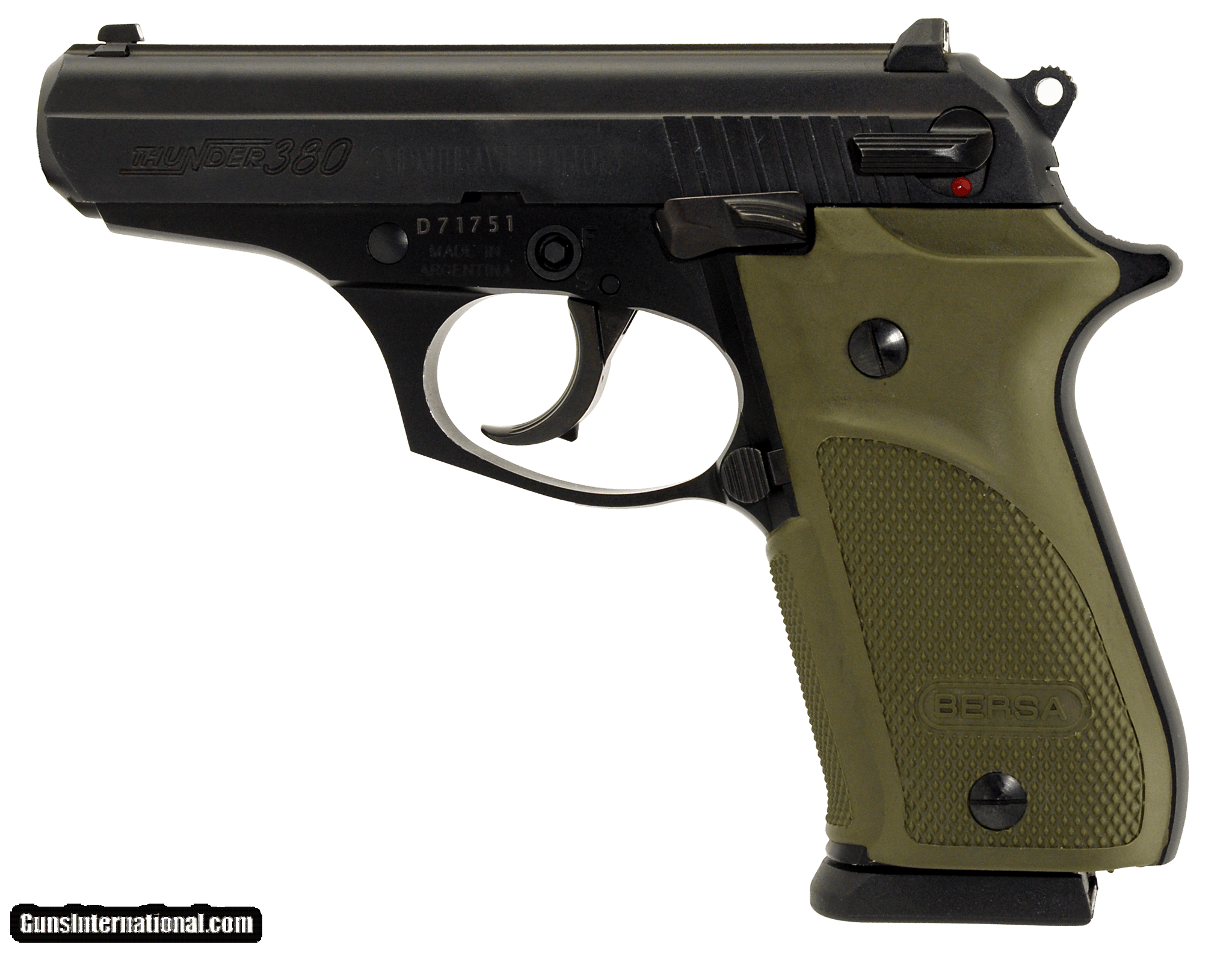Description: Guns Listing ID: 17149 The Bersa Thunder Combat is a semi-automatic pistol. It features a matte black or satin nickel finish aluminum alloy frame steel slide with cocking serrations 3.5 barrel micro-polished bore with deep rifling notched-bar dovetail rear and dovetail front three-dot sights integral locking system manual and firing pin safeties decocker combat-style trigger guard ambidextrous magazine catch and rubber grips. Details Bersa T380PMC Thunder 380 Combat Plus DASA 380ACP 3.5 151 OD Green Rubber Grip Black SOLD Manufacturer: BERSA Model: THUNDER PLUS Caliber Info: .380 ACP Condition: new Barrels: 3.5 BARREL Finish: BLACK Weight: 1.3 LBS. |