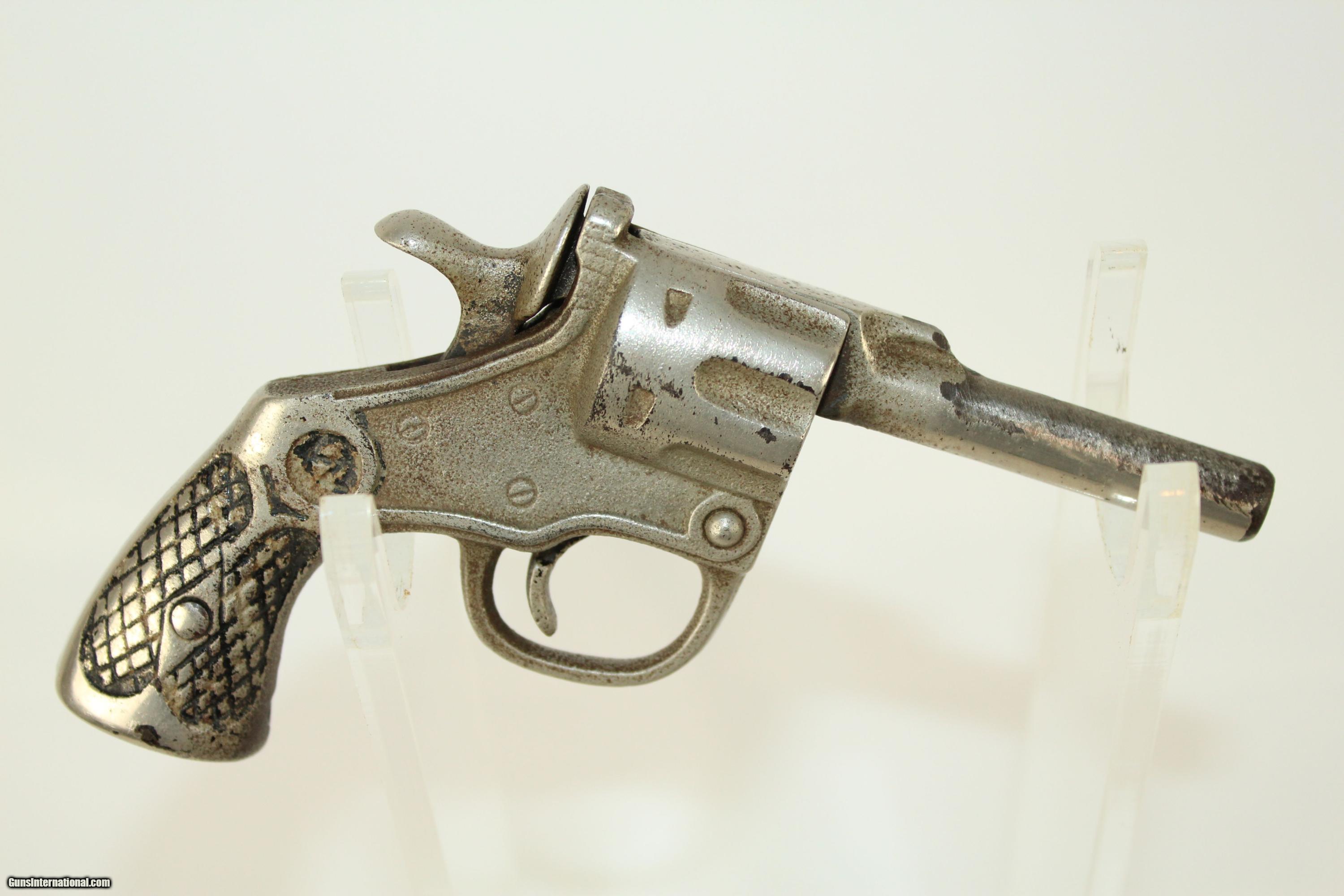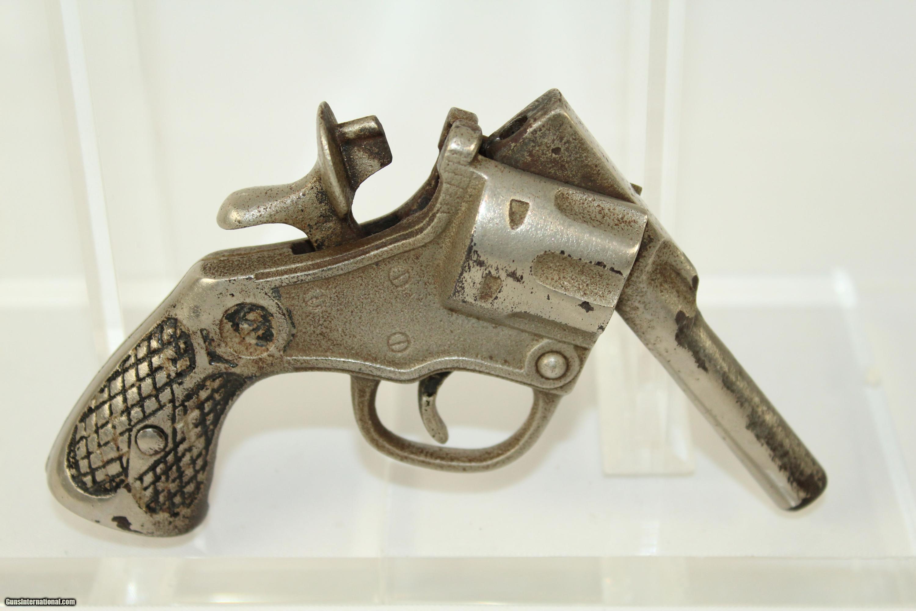 Description: Revolver-Styled Single Action .22 Blank Pistol Interesting Tip-Down Barrel Here we present an interesting Revolver-Styled Single Action .22 Blank Pistol. This is a really simple firearm with two cast pieces making up the frame and grips. The barrel tips down when the hammer is cocked. The piece is functional. Barrel is 4 inches in length. Caliber: .22 Overall condition as seen in photos. Very Fast. Very Safe. FREE SHIPPING WORLDWIDE. Delivered directly to your door by express mail! Guaranteed AUTHENTIC & Includes CERTIFICATE OF AUTHENTICITY. ancestryguns $400 #21968 SOLD Antique: Yes |