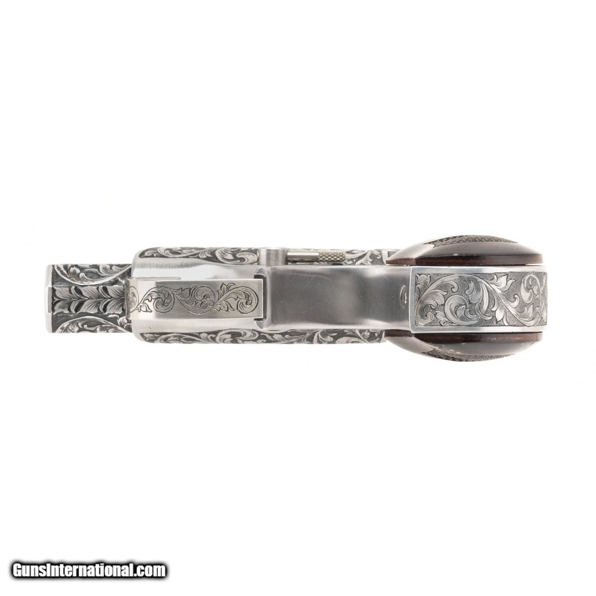 Description: " Texas-made over/under derringer with 3"" barrels. The pistol has been custom engraved with a scroll motif. The grips have some slight handling wear on the right side. Overall excellent condition. SOLD |