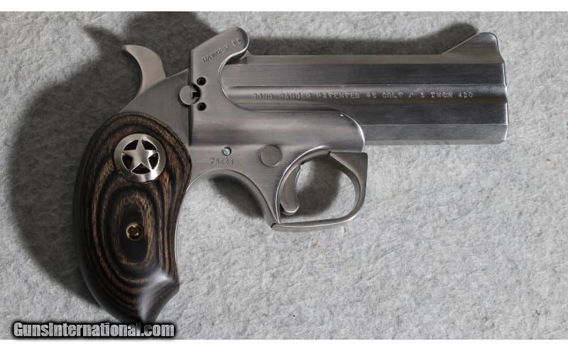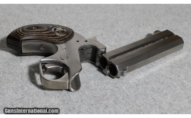 Description: Bond Arms Ranger II derringer dual chambered in .410 Gauge and .45 Colt. The black ash grip features a metal lone star badge. .45 Colt/.410 Bore SOLD Metal Condition: Very Good with Minor Handling Marks Wood Condition: Very Good with Minor Wear Bore Condition: Bright and Clear with Good Rifling Barrels: 4 inch Weight: 1 lbs 8 oz Item Location: Fort Worth, TX |