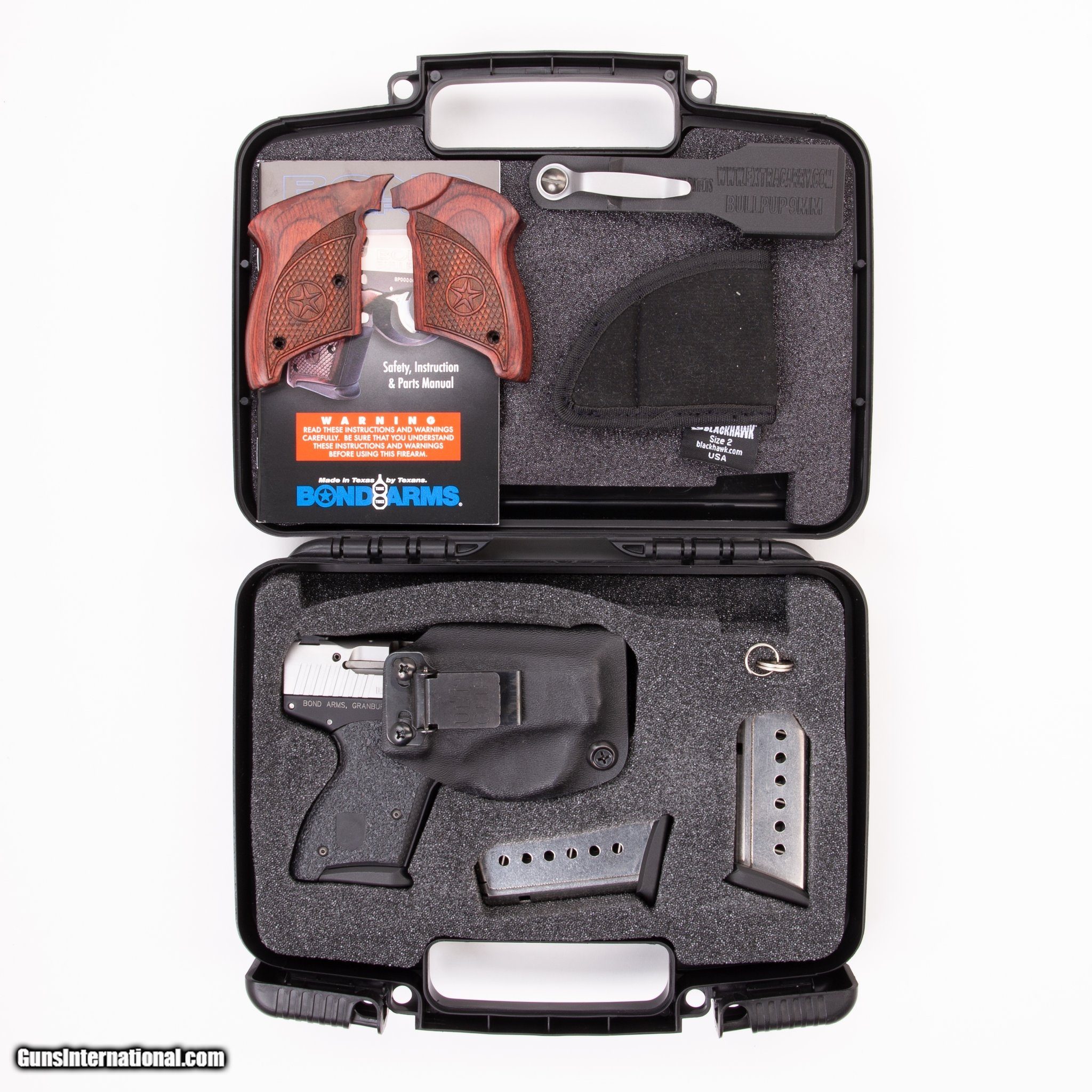Description: Guns Listing ID: 467776 This Bond Arms pistol features three 7-round magazines, the original case, owner‚‚s manual, Talon grip wrap, extra wood grips, a right hand IWB holster, a pocket holster and a belt clip magazine carrier. Get the best bang for your buck when you get a Certified Used Firearm . When you see the Certified Used stamp on any of our firearms, you can be confident that you’re getting exactly what you want – a gun only in very good to excellent condition and held to the highest quality standard. All Certified Used Guns come with a ‘no questions asked’ return policy . PLUS, ALL CERTIFIED USED GUNS SHIP FREE SOLD Manufacturer: BOND ARMS Model: BULLPUP9 Caliber Info: 9MM LUGER (9x19 PARA) Condition: Used - Certified Barrels: 3.25 Action: SEMI AUTOMATIC Finish: BLACK & STAINLESS Weight: 1 |
