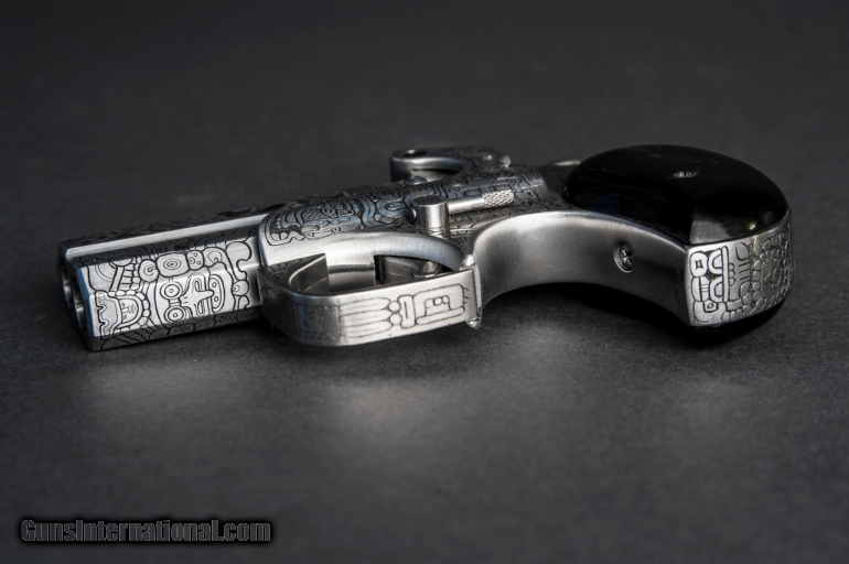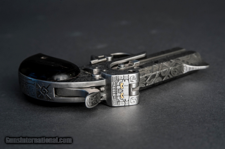 Description: BOND ARMS C2K TEXAS DEFENDER 45/.410 Custom Engraved by Otto Carter Serial #103903 ACTUAL FIREARM PICTURED How do you improve perfection? Easy, take a product known for durability, reliability, accuracy and quality; send it to Otto Carter for top of the line custom hand engraving. We are offering a truly one of a kind Bond Arms Texas Defender and matching gentelman's ring. This derringer and ring were embellished by Master Engraver Otto Carter using hand chisels, no computers or machines. Mr. Carter chose an Aztec motif for this potent little creation bringing new meaning to Montezuma's revenge.