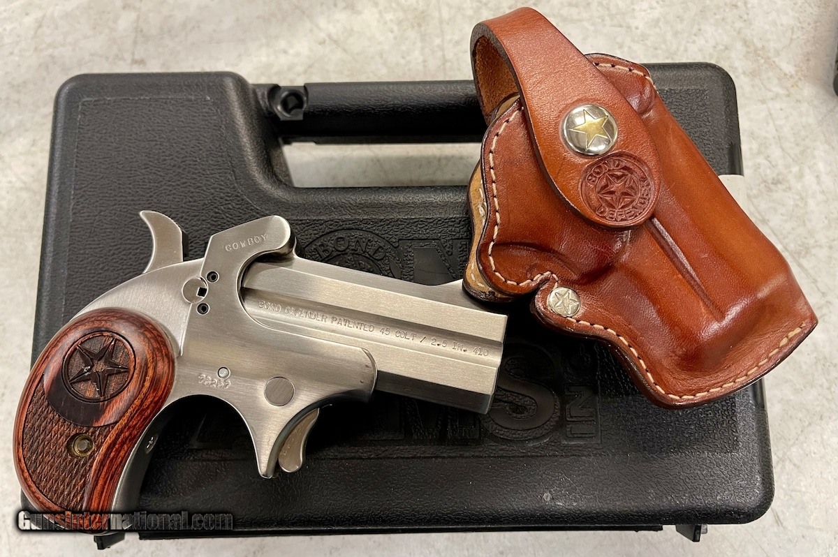 Description: Guns Listing ID: 680490 Bond Arms Cowboy with box and holster SOLD Manufacturer: BOND ARMS Model: COWBOY Caliber Info: 45LC Condition: Used - Non-Certified Barrels: 2 BARREL Finish: STAINLESS |