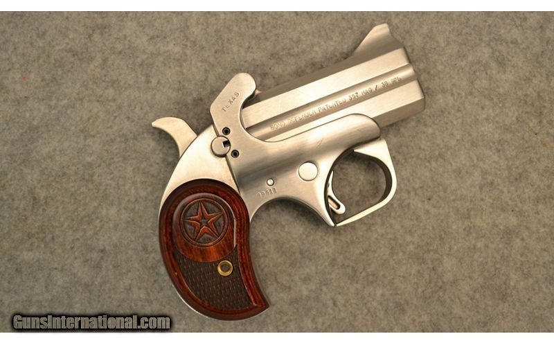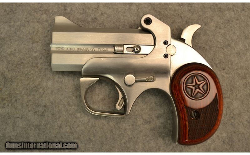 Description: Bond Arms Derringer, Texas Defender model. .357 Mag./ .38 Special SOLD Metal Condition: Excellent Wood Condition: Excellent Bore Condition: Excellent Barrels: 3 in Weight: 1.5 lbs Item Location: christiana |
