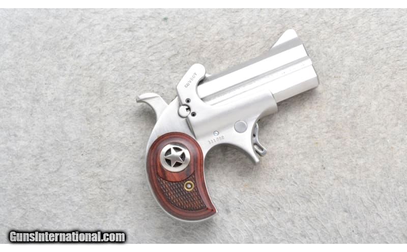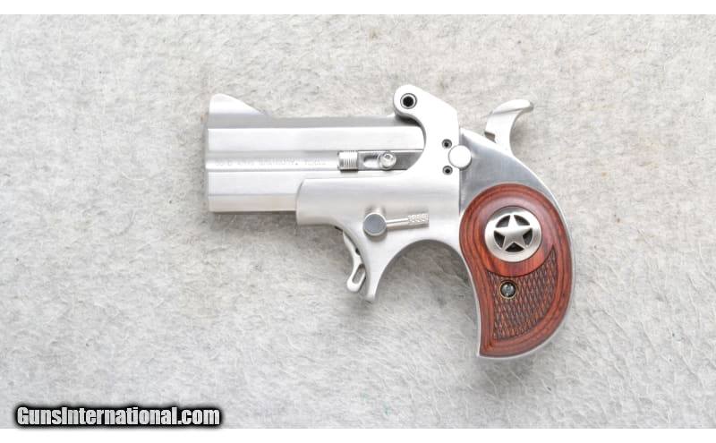 Description: This Bond Arms Model Defender is a stainless steel derringer that comes in .45 Colt and .410 Bore (2.5 inch). It has 3 inch barrels. A blade front sight and notch rear sight. The grip is a checkered hardwood laminate with a stainless steel 5 point star. .45 Colt/.410 Bore SOLD Chambers: 2.5 inch. Metal Condition: Excellent. Wood Condition: Excellent. Bore Condition: Good. Barrels: 3 inch. Weight: 20 oz. Sights: Blade front. Notch rear. Item Location: Richfield, WI |