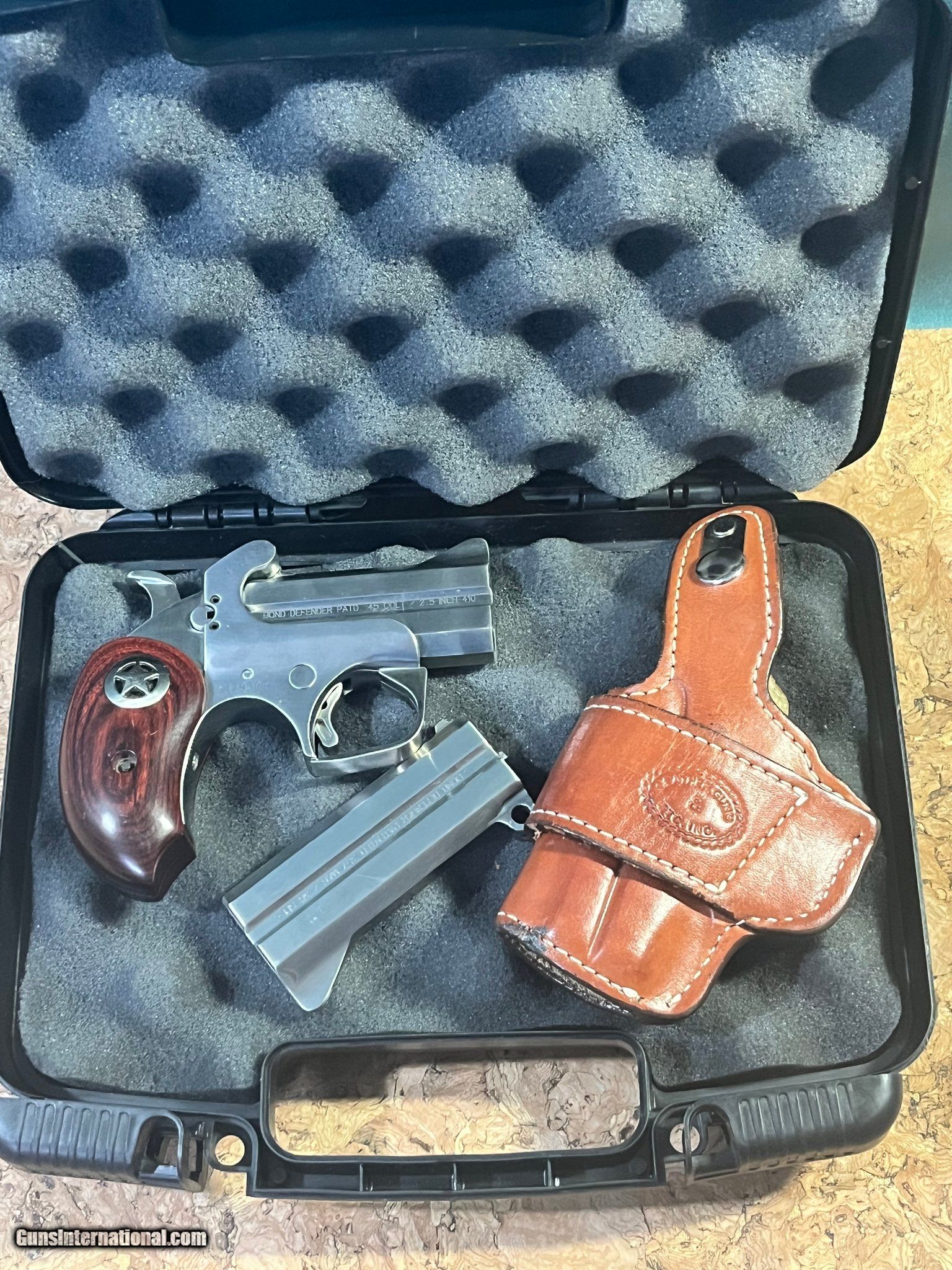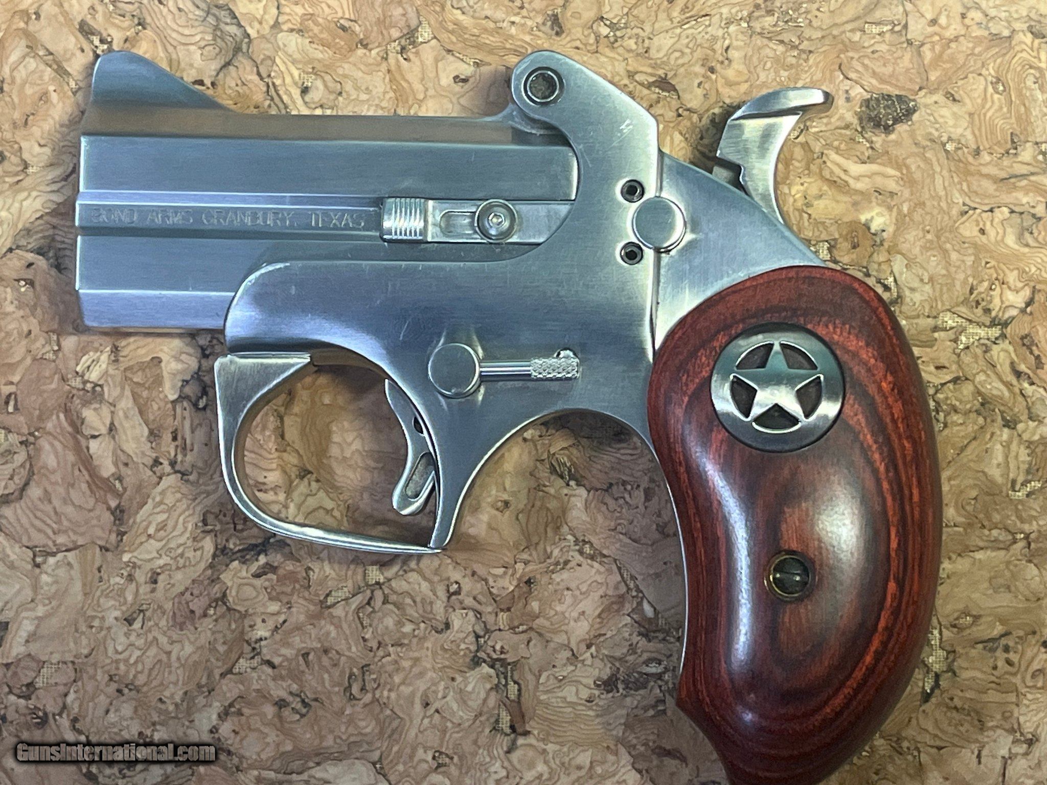 Description: Guns Listing ID: 1296688 **For Sale: Bond Arms Defender - .45 Colt/.45 ACP - 2 Rounds - 2.5\" Barrel** This Bond Arms Defender is in **like-new condition** and comes with a host of accessories. Here are the key features: 1. **Caliber**: Chambered for both .45 Colt and .45 ACP, this versatile derringer allows you to choose between two powerful rounds. 2. **Barrel Length**: The compact 2.5\" barrel ensures concealability while maintaining accuracy. 3. **Finish**: The stainless steel finish provides durability and a classic look. 4. **Accessories Included**: - **Original Protective Carrying Case**: Safely transport your Bond Arms Defender wherever you go. - **Leather Bond Arms Holster**: A high-quality holster for comfortable carry. - **Interchangeable Barrels**: - **.357 Mag / .38 SPL Barrel**: Swap out the .45 barrels for this option when you need a different caliber. - **.45 Colt Barrel**: The original .45 Colt barrel for maximum stopping power. Whether you‚‚re a collector, a concealed carry enthusiast, or simply appreciate fine craftsmanship, this Bond Arms Defender is a reliable and versatile choice. Don‚‚t miss out on this opportunit SOLD Manufacturer: BOND ARMS Model: DEFENDER Caliber Info: .45 COLT/.45 ACP Condition: Used - Non-Certified Barrels: 2.5 BARREL Finish: STAINLESS STEEL |