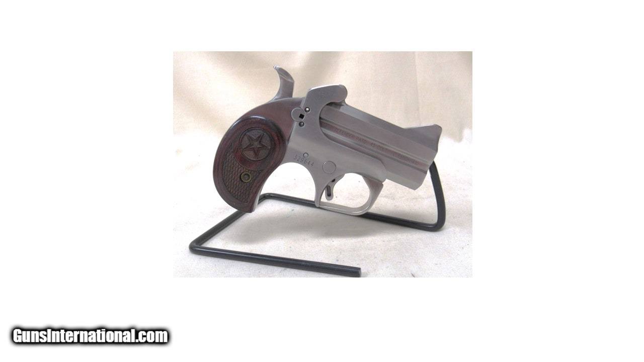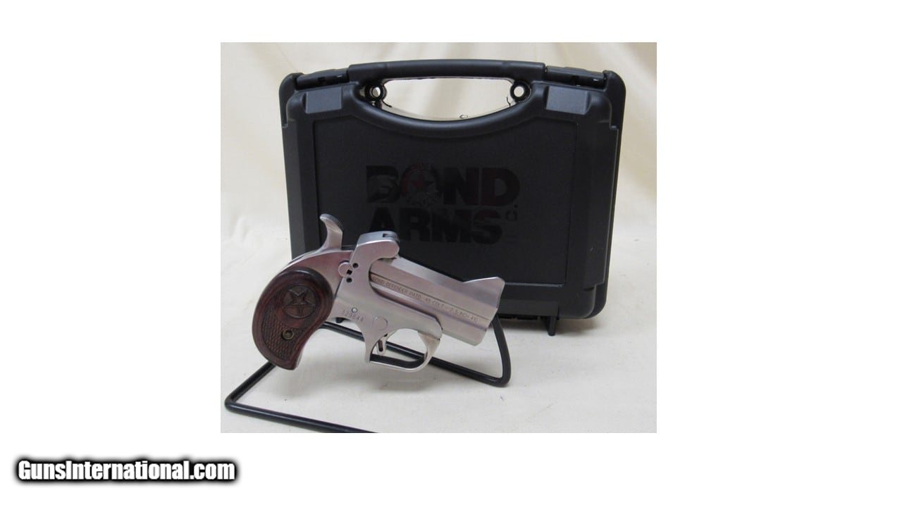 Description: Guns Listing ID: 1203915 Bond Arms Defender, Derringer in 410 or 45LC, 3\" Barrel, Stainless Steel, Silver, Rosewood Grips, Fixed Sights, 2 Rounds, With Trigger Guard, Case SOLD Manufacturer: BOND ARMS Model: DEFENDER Caliber Info: .45 LC/.410 GA Condition: Used - Non-Certified Barrels: 3 BARREL Finish: STAINLESS/WOOD GRIPS |