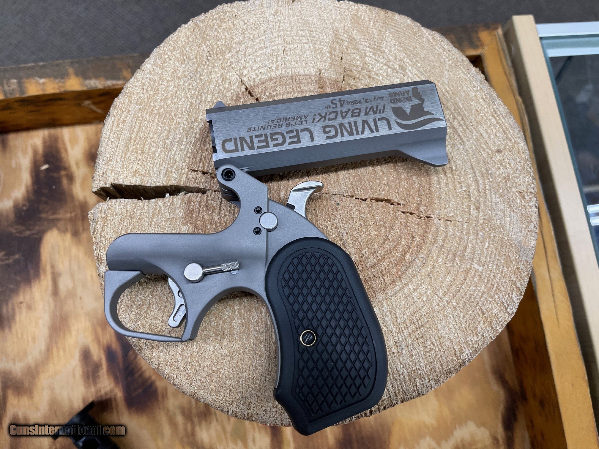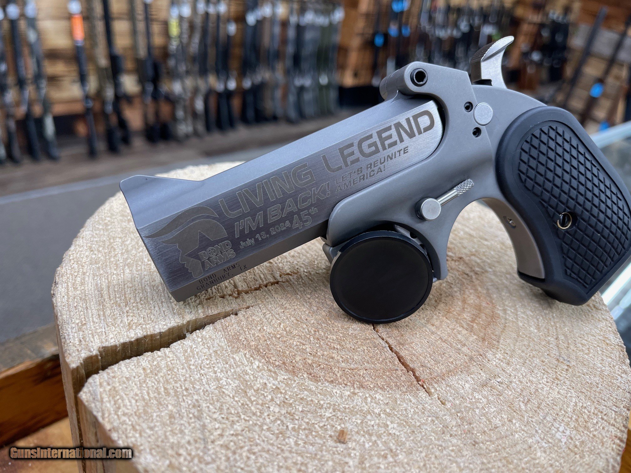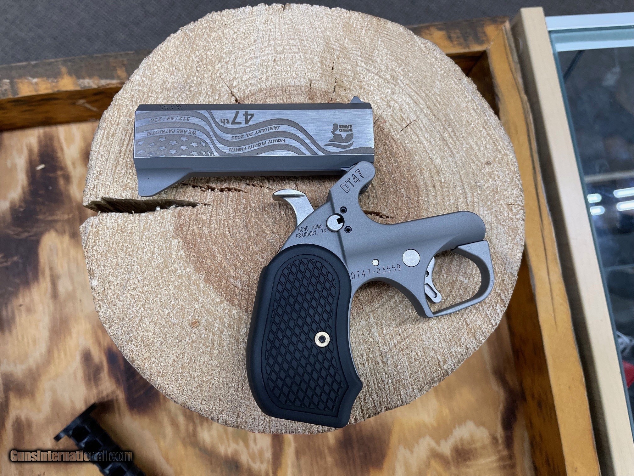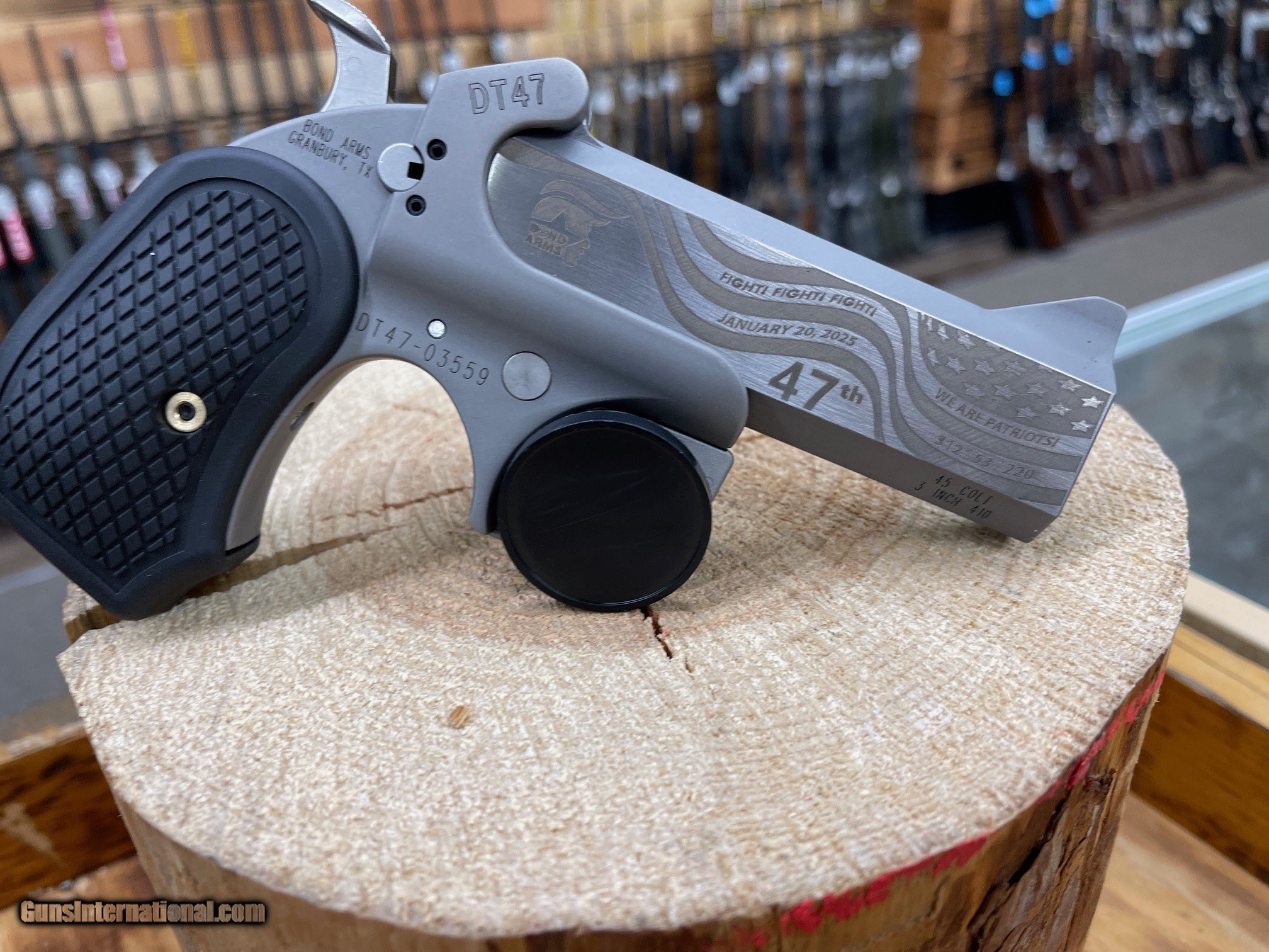 Description: A stunning salute to a remarkable comeback and victory by our 45th and 47th Commander in Chief. The DT47 features gold elaborate engraving on both sides of a flat-sided barrel; stainless steel double-barrel and frame; patented rebounding hammer; retracting firing pin; cross bolt safety; spring-loaded locking lever and B6 extended resin grips. The DT47 is a Limited Edition. shoots up to 3" 410 shells and 45 Long Colt SOLD Handgun Caliber: .45 Colt Shotgun Gauge: .410 Gauge Manufacturer: Bond Model: DT47 Barrel Length: 4.25 |