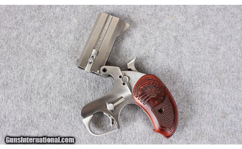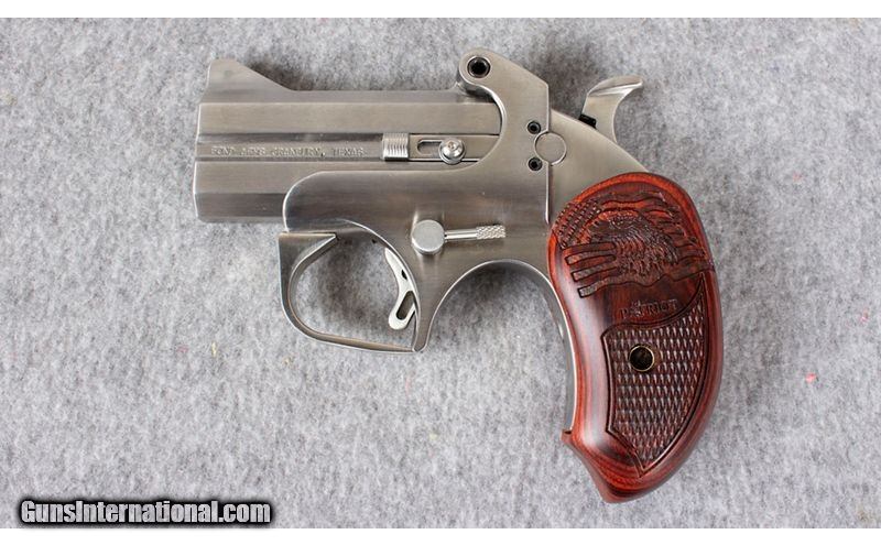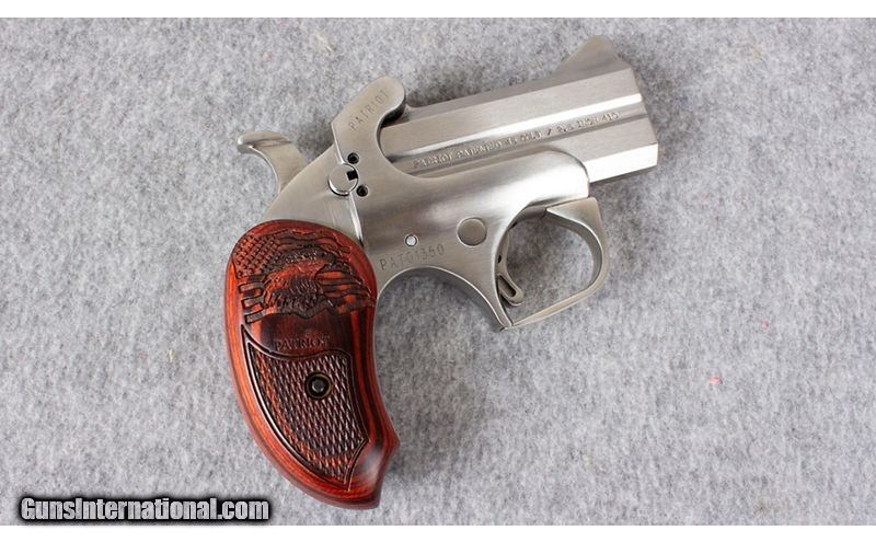 Description: Bond Arms, Patriot double barrel derringer chambered for .45 LC. This handgun is all stainless steel with cherry colored wood grips. .45 Long Colt SOLD Metal Condition: Very Good Wood Condition: Very Good Bore Condition: Very Good Barrels: 3 Butt Pad: "Checkered, laser cut wood Weight: 24 oz. Sights: Integral Item Location: East Hartford, CT |