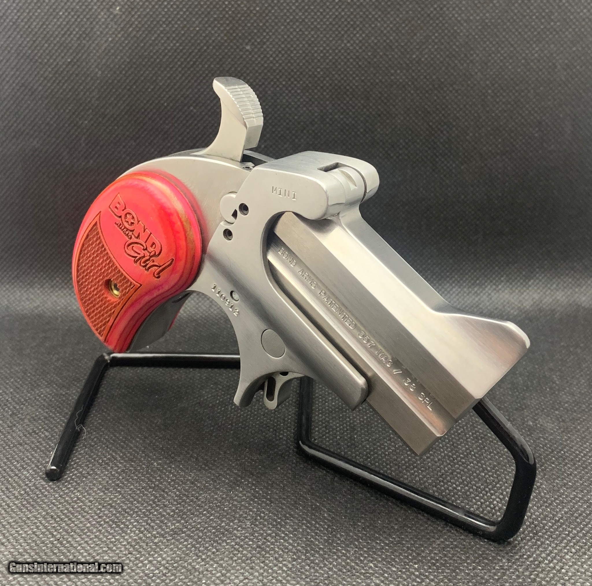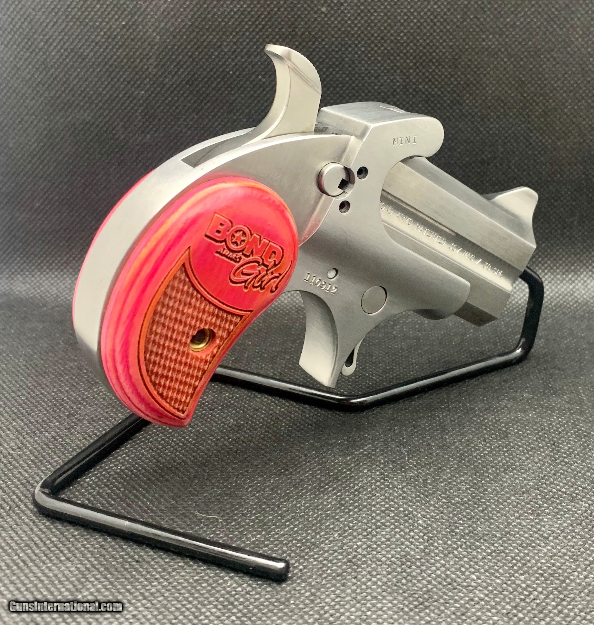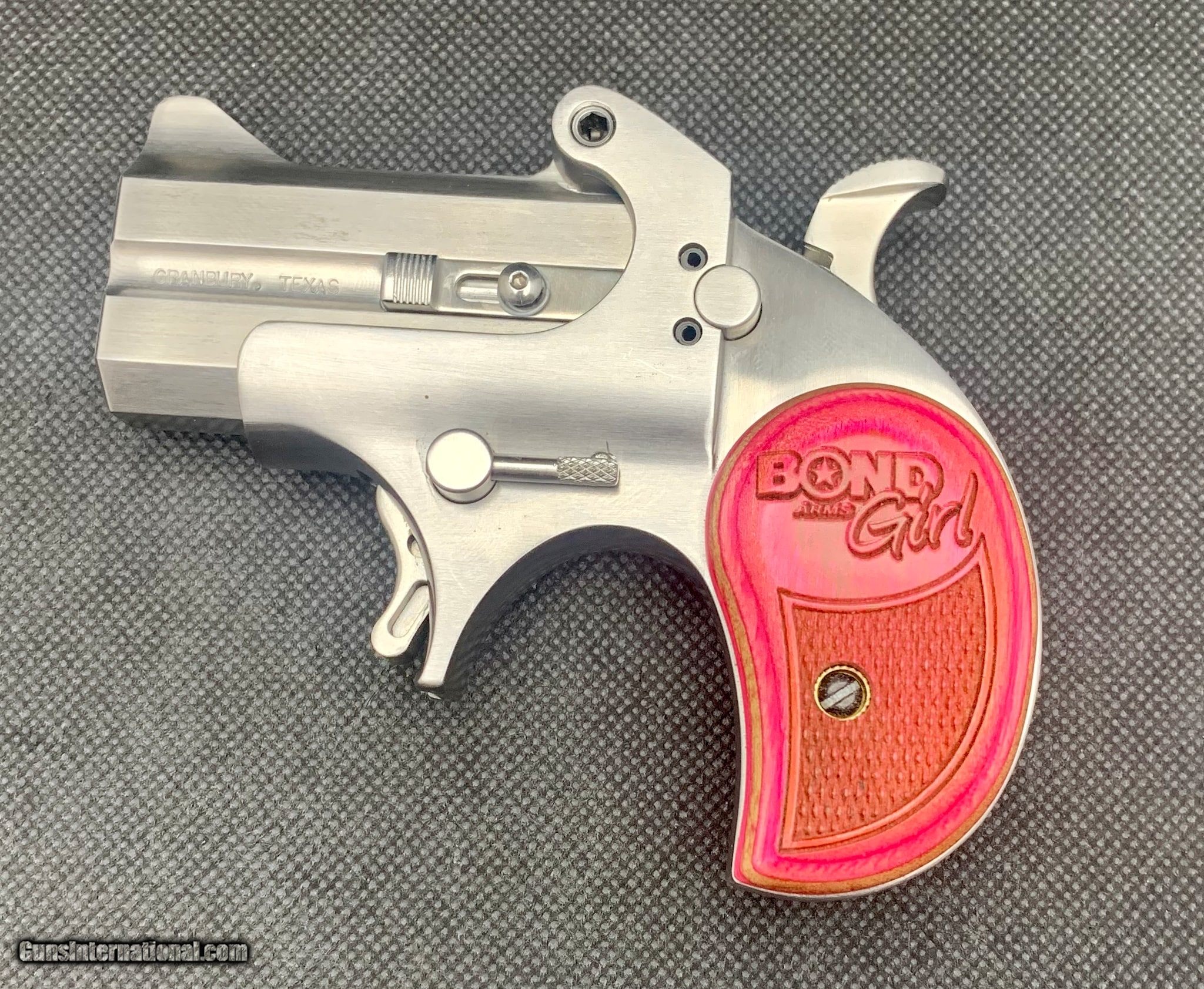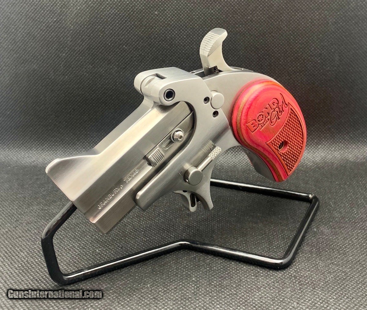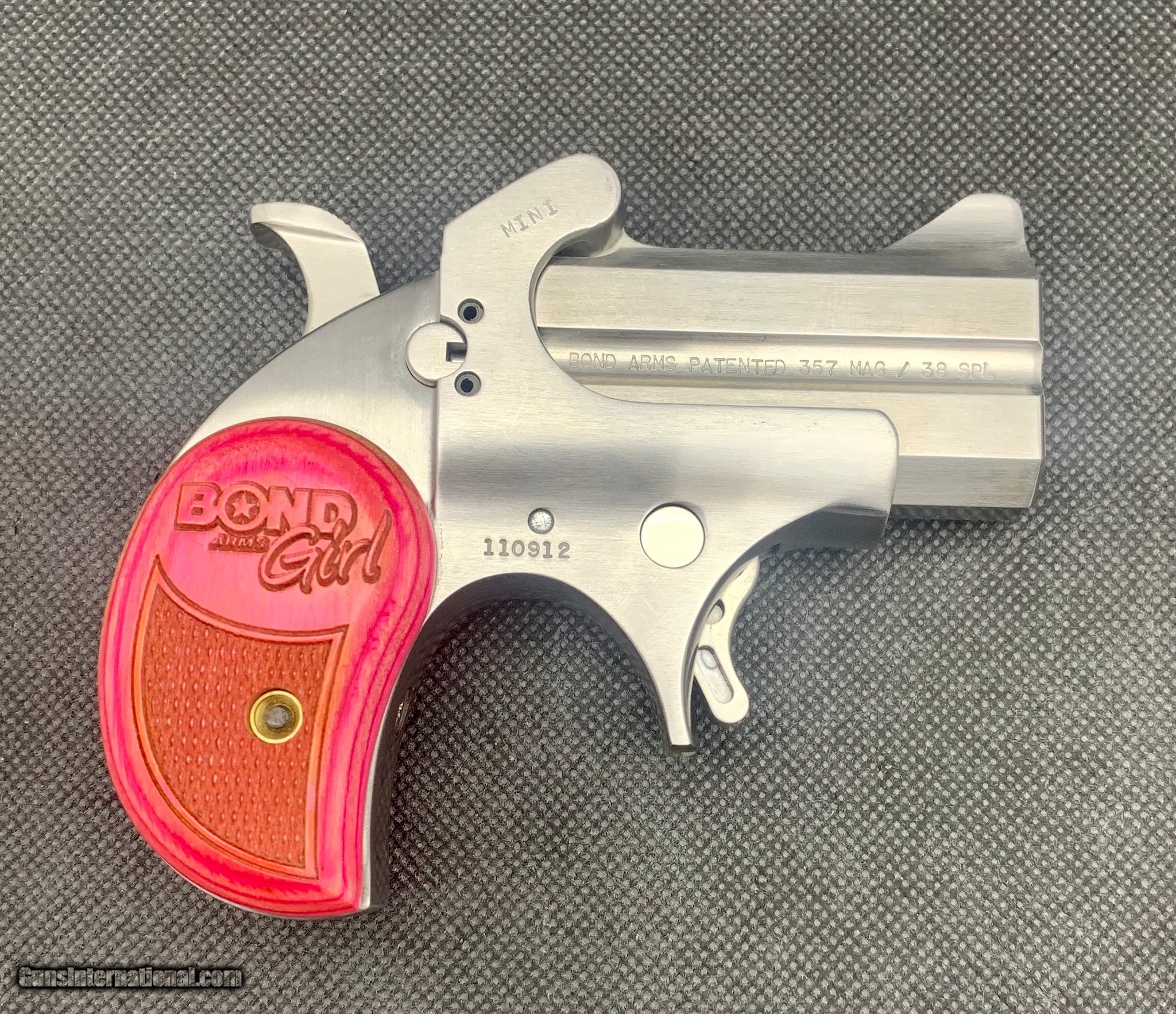 Description: Guns Listing ID: 305680 BOND ARMS MINI GIRL 357 MAG/ 38 SPL DOUBLE BARREL DERRINGER PRE-OWNED, IN VERY GOOD CONDITION SOLD Manufacturer: BOND ARMS Model: Pink Mini Caliber Info: .357 MAG Condition: Used - Non-Certified Barrels: 2 BARREL Finish: STAINLESS |