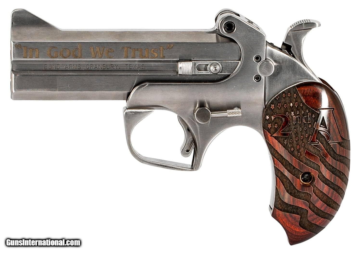 Description: Guns Listing ID: 466325 The Bond Arms Protect the Second Amendment (PT2A) is a derringer chambered in 45LC410 bore shells or in 357 Mag38 Special. This gun earns its name by the engravement of part of the text of the Second Amendment to the Constitution on the barrels. Rosewood grips are also engraved with an American flag. All parts of this derringer are manufactured in the United States. Details The Protect the 2nd Amendment has a 4 14 long barrel (versus 3 12 barrel). This longer barrel provides tighter shot patterns higher velocities and even more manageable recoil than shorter barrels. The Protect the 2nd Amendment will accept all the extra interchangeable barrels and also has the extended grips for added comfort. This model also includes the BAD Premium Leather Driving Holster. - Stainless steel double-barrel and frame - Compatible with all Bond Arms barrels - Automatic spent casing extractor - Patented rebounding hammer - Retracting ring pins - Cross-bolt safety - Spring-loaded cammed locking lever - CALIBER .45LC.410 - BARREL 4.25 - GRIP Extended Rosewood - SIGHTS Front blade fixed rear - LENGTH 6.25 - WEIGHT 23.5 oz. SOLD Manufacturer: BOND ARMS Model: PT2A Caliber Info: .45 LC Condition: new Barrels: 4.25 BARREL |