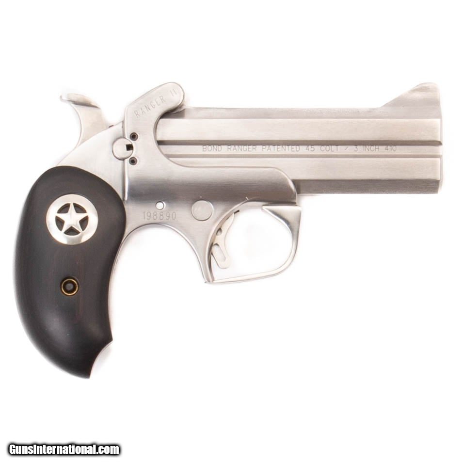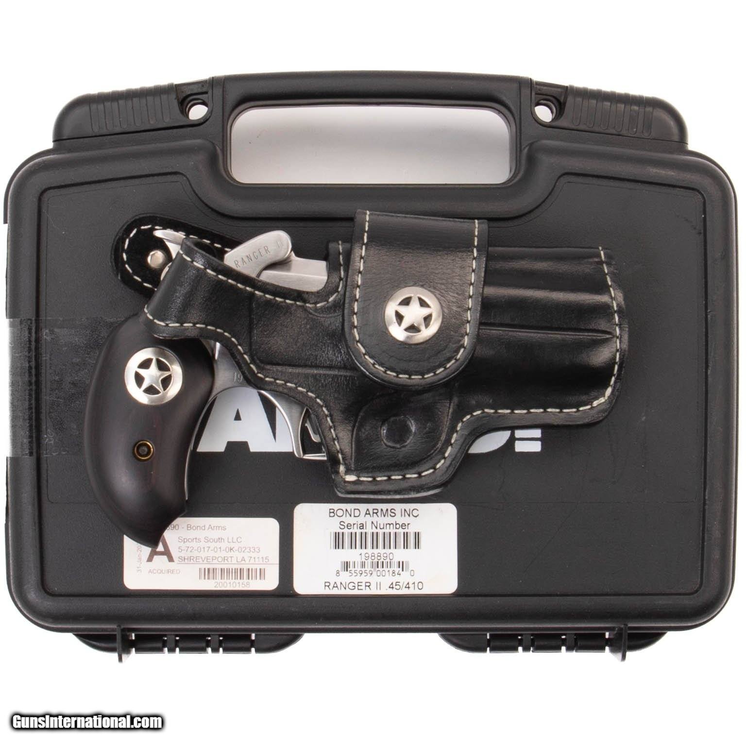 Description: Guns Listing ID: 484077 This Bond Arms Derringer has a 3\" chamber and comes with the original case, owner‚‚s manual and a right hand OWB leather holster. Get the best bang for your buck when you get a Certified Used Firearm . When you see the Certified Used stamp on any of our firearms, you can be confident that you’re getting exactly what you want – a gun only in very good to excellent condition and held to the highest quality standard. All Certified Used Guns come with a ‘no questions asked’ return policy . PLUS, ALL CERTIFIED USED GUNS SHIP FREE SOLD Manufacturer: BOND ARMS Model: RANGER II Caliber Info: .45 LC/.410 GA Condition: Used - Certified Barrels: 4.25 Action: OVER/UNDER Finish: stainless Weight: 1.6 |
