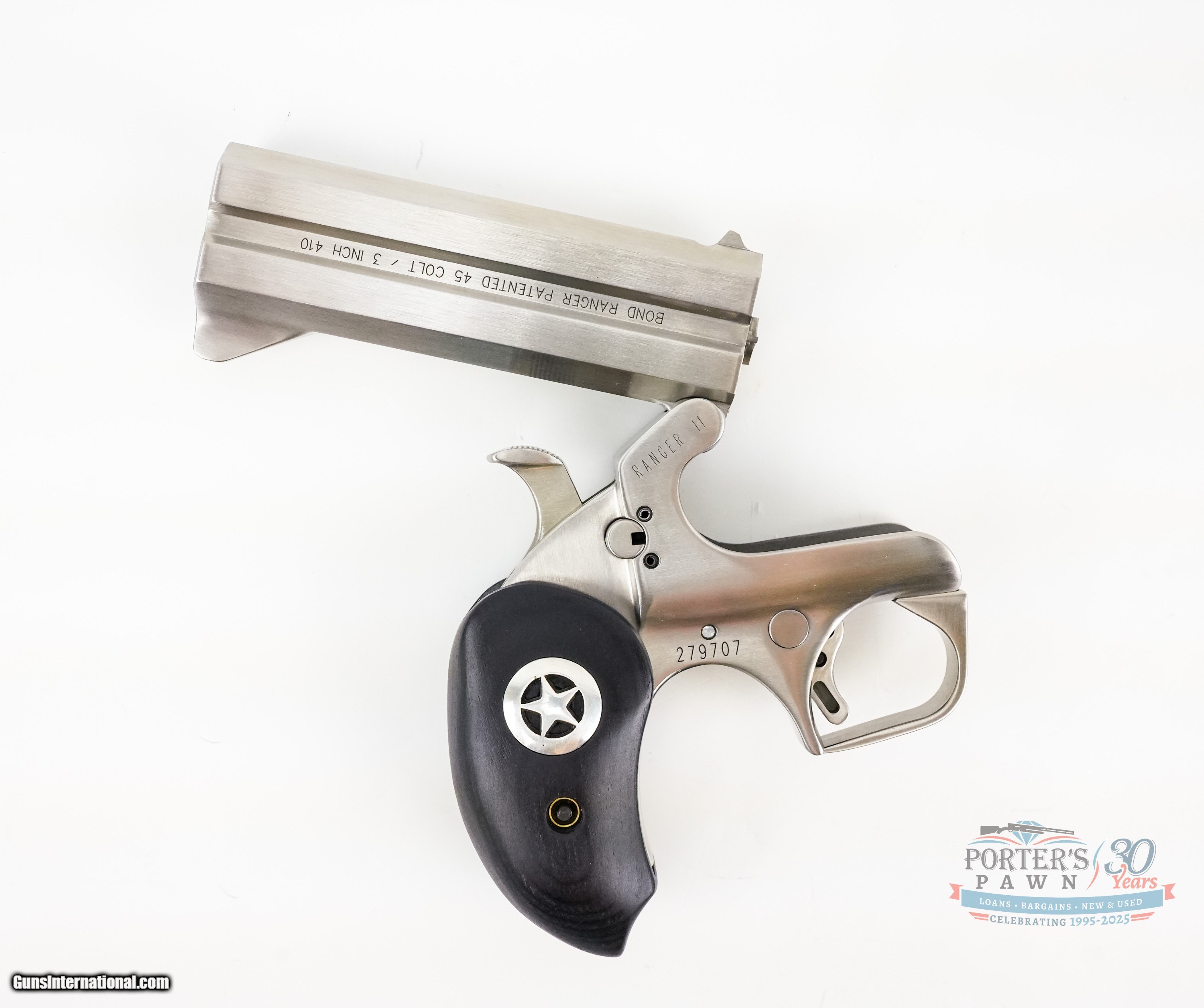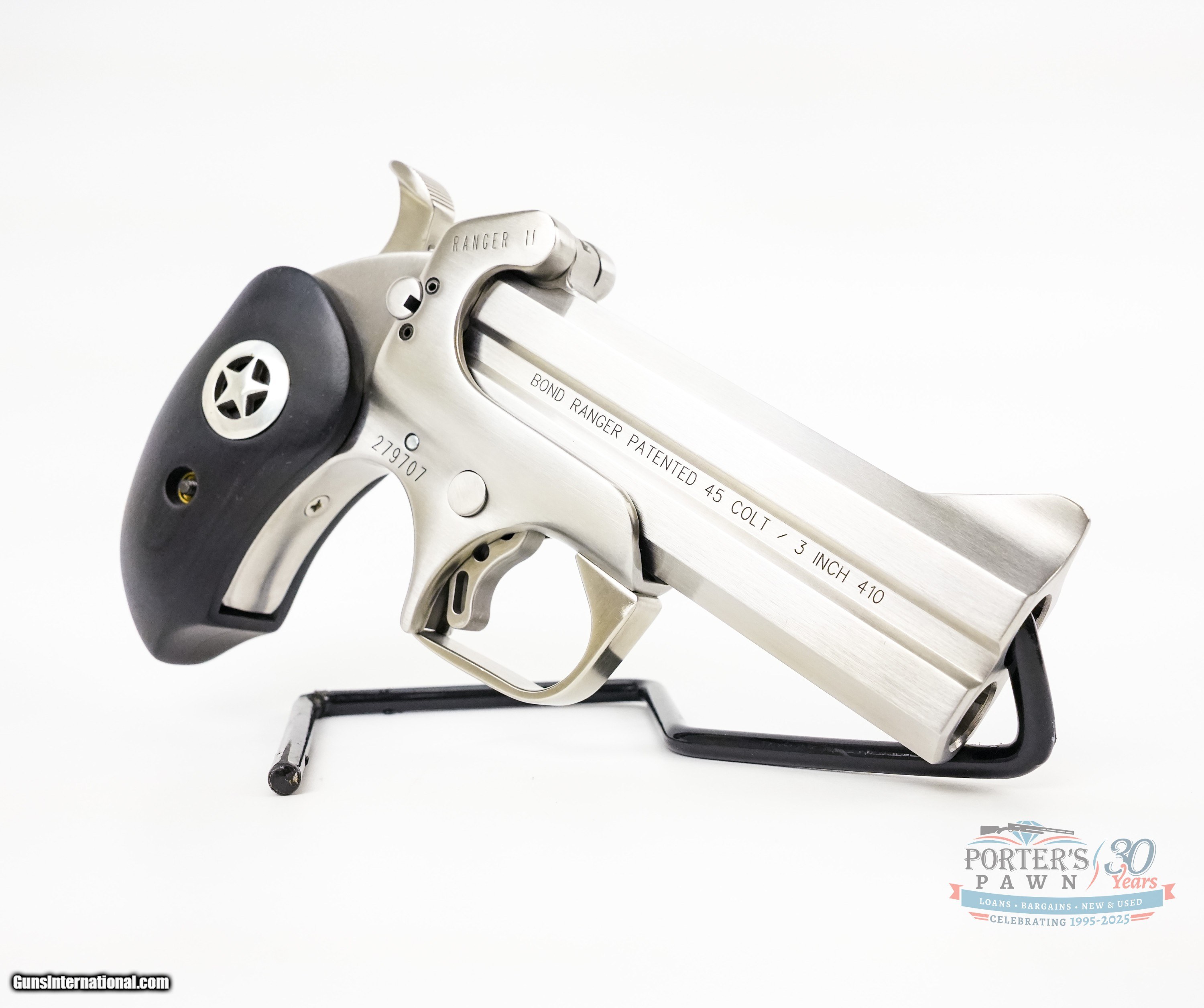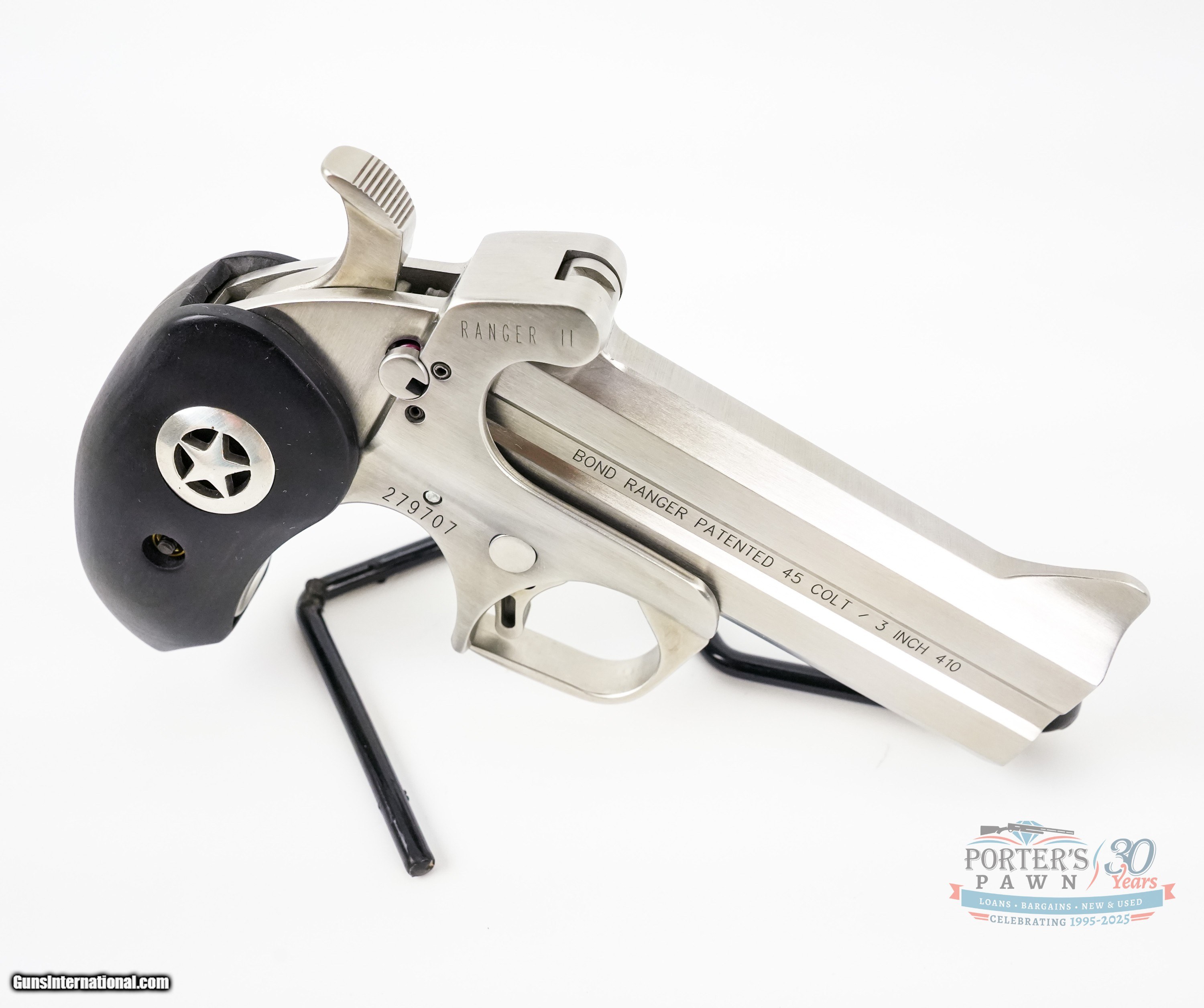 Description: Bond Arms Ranger II – .45LC / .410 – 4.25" Barrel – Leather Holster Included Break-Action 2-Shot Pistol – Stainless Steel – Extended Black Ash Grip – Excellent Condition This listing is for a Bond Arms Ranger II, a powerful and compact break-action 2-shot pistol chambered in both .45 Long Colt and .410 bore. The Ranger II is designed to deliver unmatched versatility, capable of firing 3” .410 shells or .45LC with authority. Known for its robust stainless-steel construction and patented safety features, this pistol offers confidence in both defensive and sporting applications. The extended black ash grip is adorned with a striking metal Lone Star badge, offering both enhanced control and a distinctive look. A black Ranger II driving holster is included, making this an excellent carry or range-ready package. Built with precision and reliability, the Ranger II is compatible with all standard Bond Arms barrels, offering even greater customization potential. Specifications