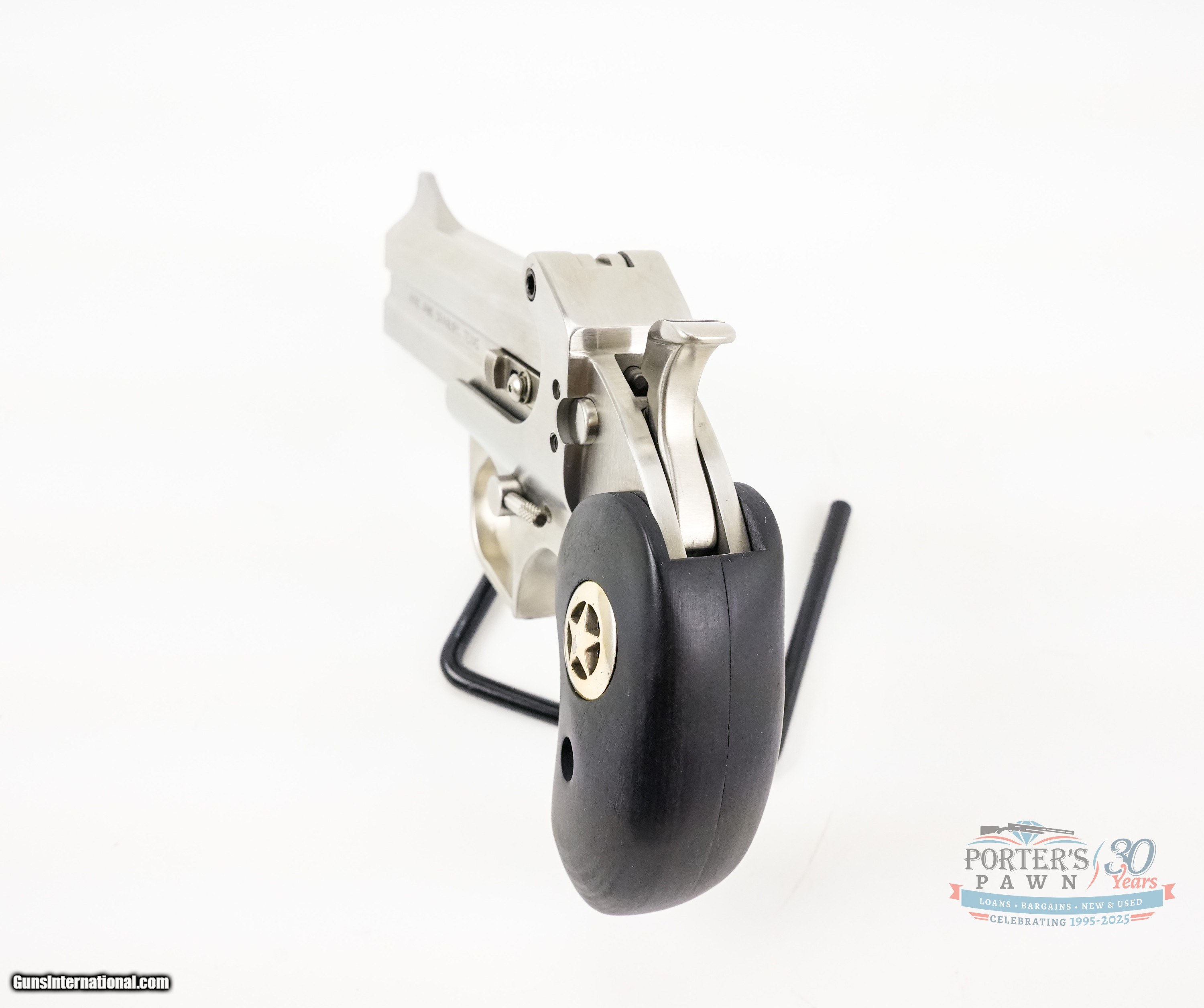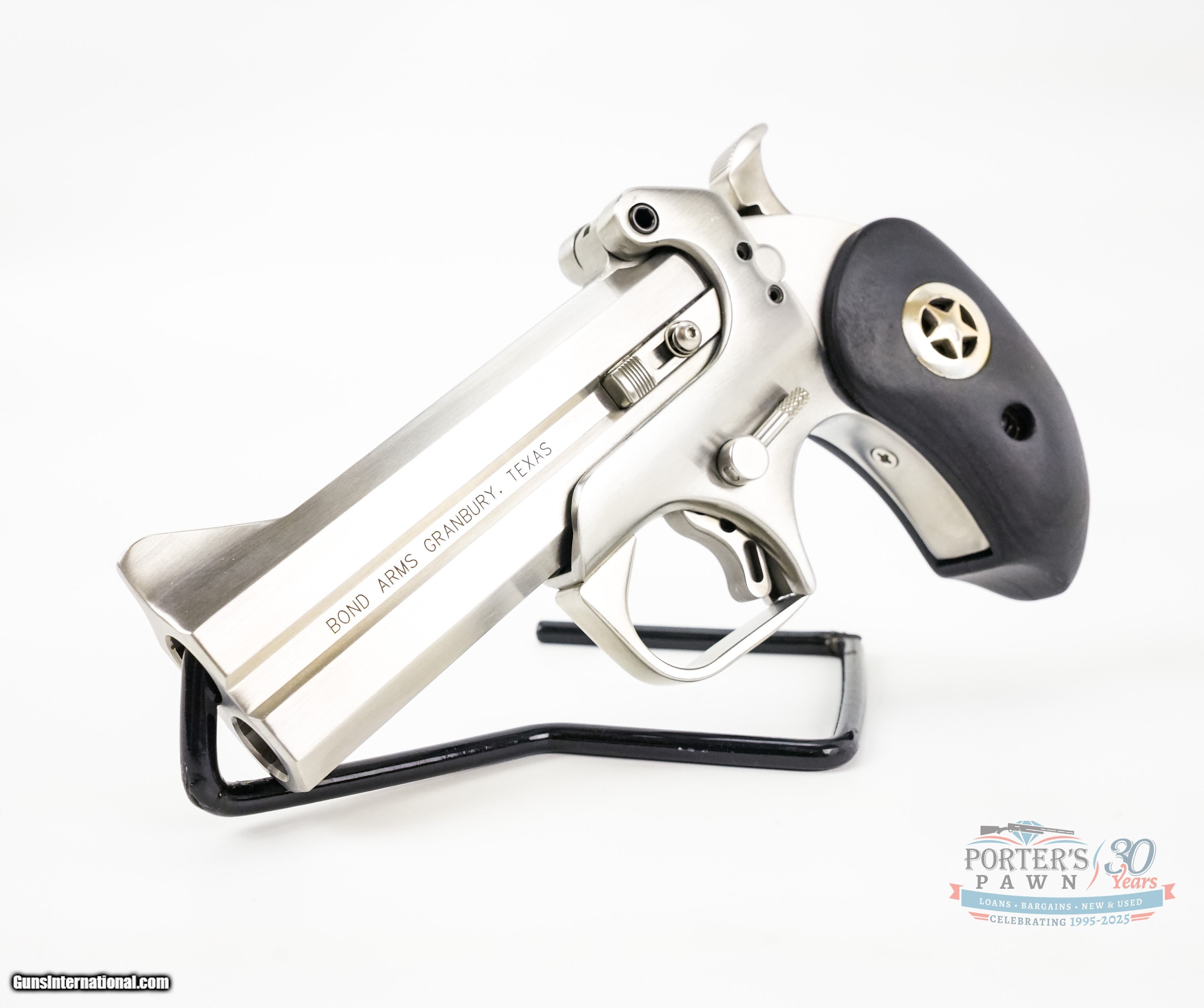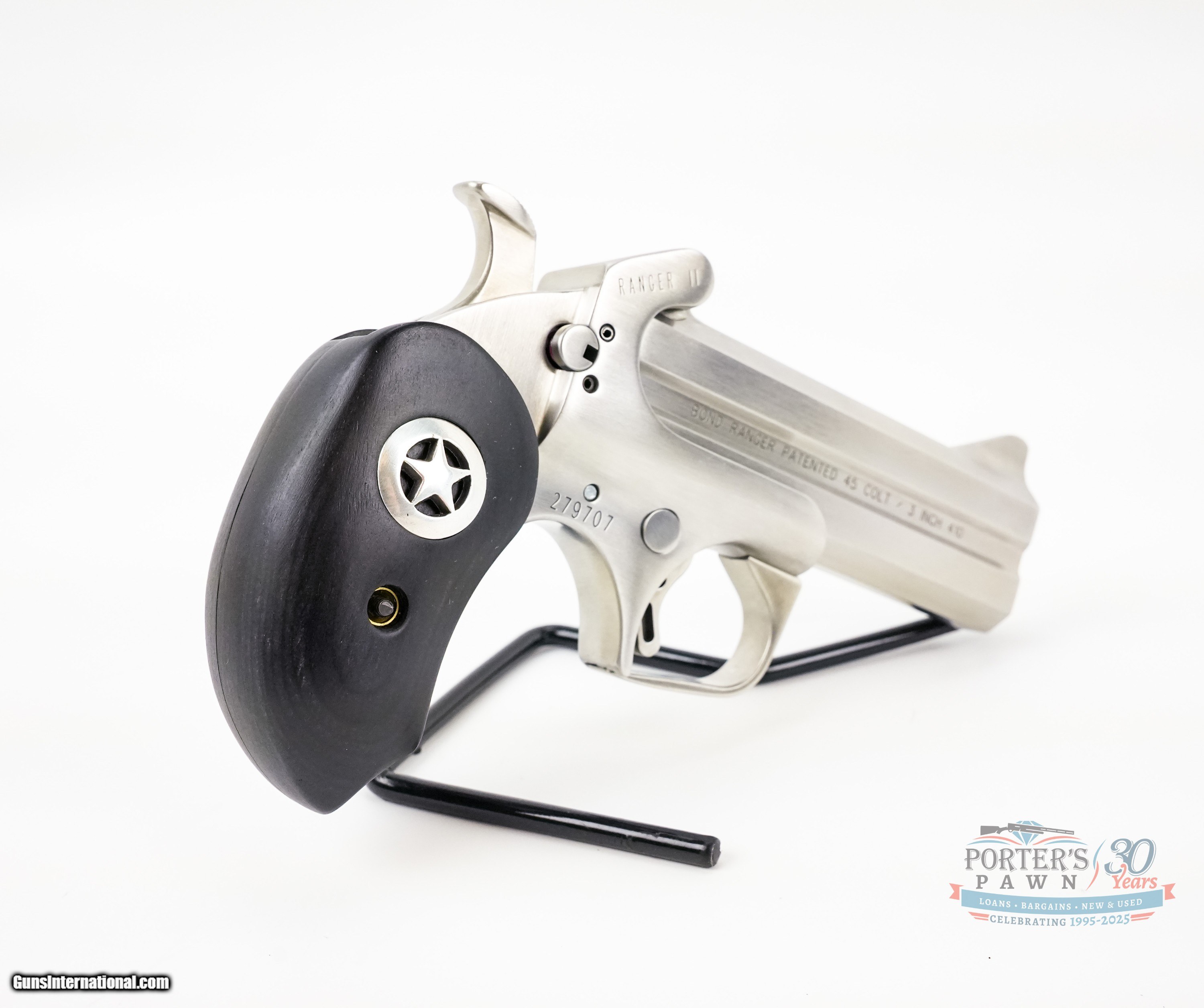 Description: Bond Arms Ranger II – .45LC / .410 – 4.25" Barrel – Leather Holster Included Break-Action 2-Shot Pistol – Stainless Steel – Extended Black Ash Grip – Excellent Condition This listing is for a Bond Arms Ranger II, a powerful and compact break-action 2-shot pistol chambered in both .45 Long Colt and .410 bore. The Ranger II is designed to deliver unmatched versatility, capable of firing 3” .410 shells or .45LC with authority. Known for its robust stainless-steel construction and patented safety features, this pistol offers confidence in both defensive and sporting applications. The extended black ash grip is adorned with a striking metal Lone Star badge, offering both enhanced control and a distinctive look. A black Ranger II driving holster is included, making this an excellent carry or range-ready package. Built with precision and reliability, the Ranger II is compatible with all standard Bond Arms barrels, offering even greater customization potential. Specifications