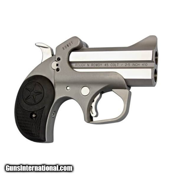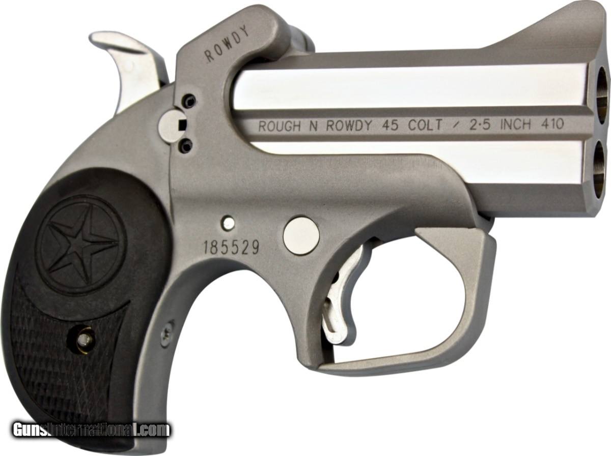 Description: Manufacturer: Bond Arms Inc. Model: Rough N Rowdy Derringer SKU: BARW45410 Caliber: .45 Colt / .410 GA, 2.5" Barrel Length: 3" Capacity: 2 Rounds Material: Stainless Steel Finish: Matte Stainless Grips: Black Rubber Sights: Blade Front, Fixed Rear Overall Length: 5" Weight: 20 oz The compact, yet rough-looking, Rowdy is a new type of Bond Arm gun. It’s built with a 3? barrel chambered for 45/410. Works best with smoothed lined holsters. Features: