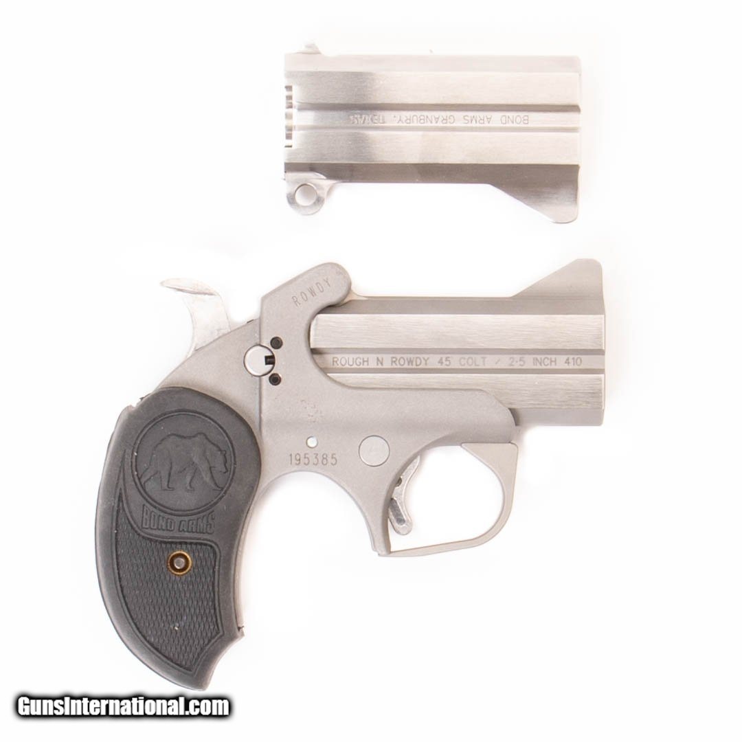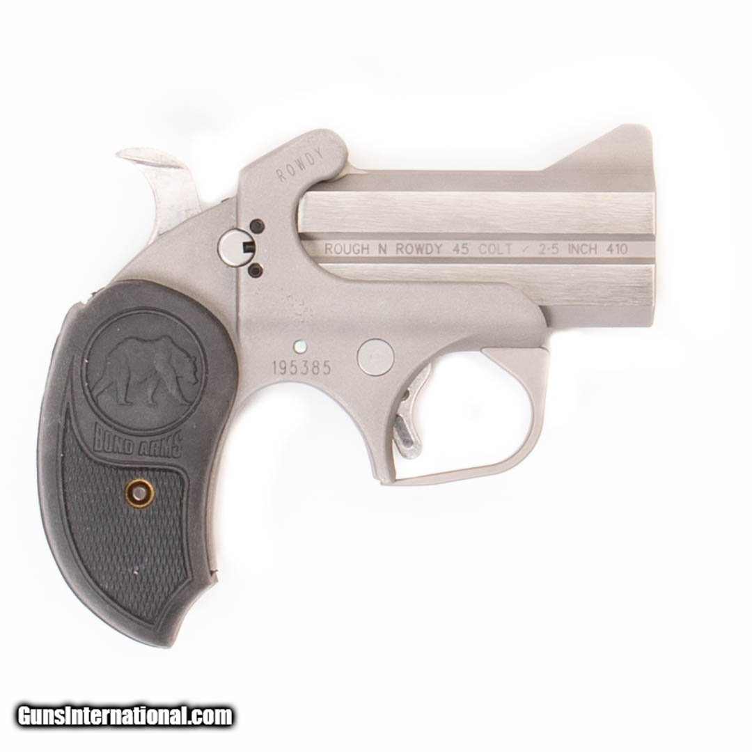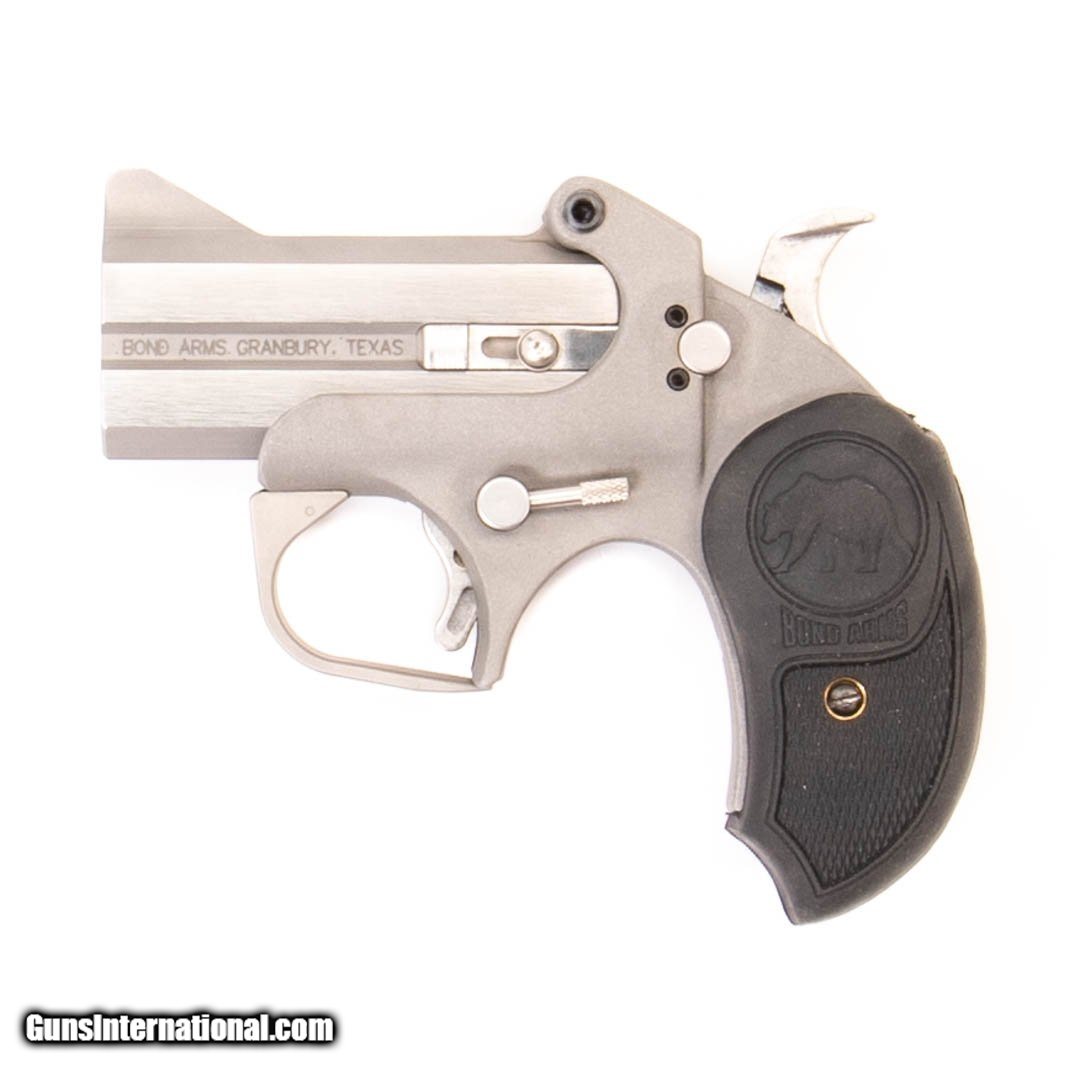 Description: Guns Listing ID: 503509 This Bond Arms derringer comes with the original case, owner‚‚s manual, extra grips and an extra 3\" 9mm derringer barrel. Get the best bang for your buck when you get a Certified Used Firearm . When you see the Certified Used stamp on any of our firearms, you can be confident that you’re getting exactly what you want – a gun only in very good to excellent condition and held to the highest quality standard. All Certified Used Guns come with a ‘no questions asked’ return policy . PLUS, ALL CERTIFIED USED GUNS SHIP FREE! SOLD Manufacturer: BOND ARMS Model: ROUGH N ROWDY Caliber Info: .45 LC/.410 GA Condition: Used - Certified Barrels: 3.00 Action: OVER/UNDER Finish: stainless Weight: 1.2 |