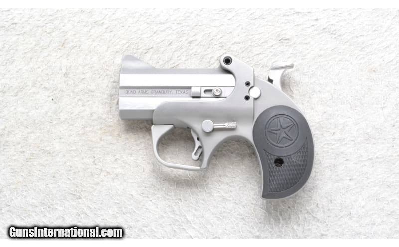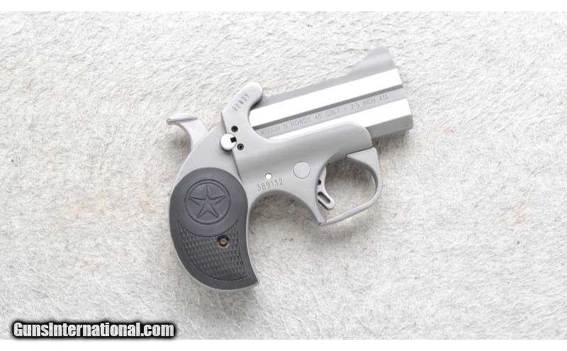 Description: This Bond Arms Model Rough N Rowdy is a stainless steel derringer that comes in .45LC/.410 Bore (2.5 inch shell). It has 3 inch barrels. A blade front sight and notch rear sight. The grip is a checkered black rubber with a star. .45 Colt / 410 Gauge SOLD Chambers: 2.5 inch. Metal Condition: Very Good. Bore Condition: Very Good. Barrels: 3 inch. Weight: 20 oz. Sights: Blade front. Notch rear. Item Location: Richfield, WI |