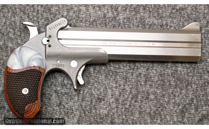 Description: Bond Arms Roughneck in 10 mm, 9 mm, 45 Colt/410 Gauge. This is in great condition with some marks from being used. It comes with a six-inch 10 mm barrel, a two- and half-inch barrel, and a three-inch 45 Colt/ 410 Gauge. The 45 Colt/410 Gauge barrel is a smooth bore barrel. It comes with a Bond Arms in the pocket holster that fits the six-inch barrel. It also comes with the original grips and original box 10mm Auto SOLD Barrels: 6 INCHES Weight: 21 Oz. Item Location: Charleston, WV |