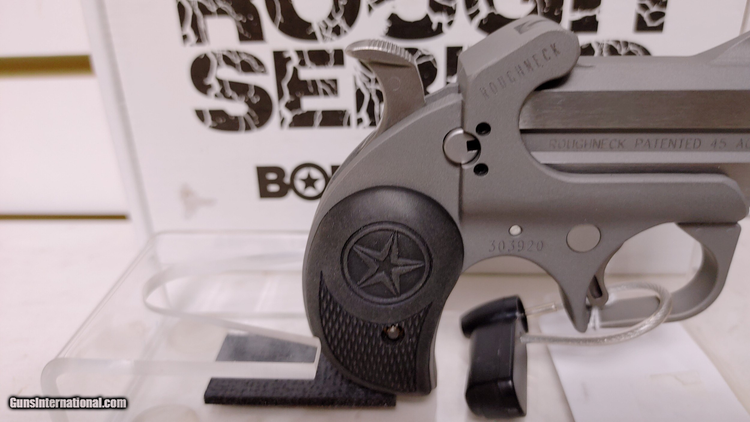 Description: Bond Arms Roughneck 45 ACP 2 1/2" barrel stainless new in box Buyer pays shipping Millers Gun Center Located in New Castle, Delaware "Home of TAX-Free shopping" No Credit Card Fees SOLD Serial Number: 303920 |
