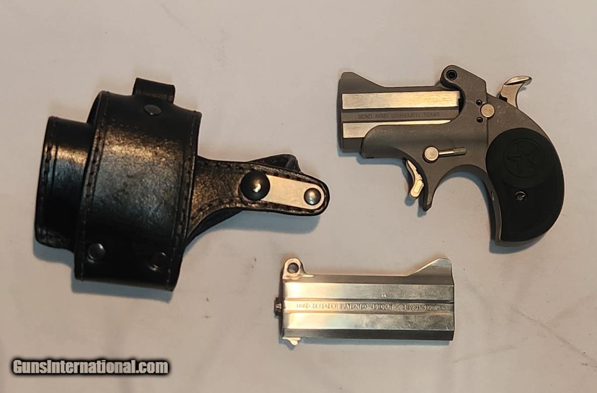 Description: Guns Listing ID: 1340620 Inventory Number: FCS096083 BOND ARMS ROUGHNECK, DERRINGER, 9MM PARABELLUM/410 BORE/45LC, MATTE STAINLESS, YES - INCLUDES HARD PROTECTIVE CASE, 2.5\" Barrel Length OPEN TO OFFERS Excellent Condition Derringer INCLUDES 2 BARRELS (9MM Luger and 45LC/.410) Comes with Original Case Holster Included (See Pictures) Specific Details: NRA Modern Gun Condition Rating Standards: EXCELLENT: New condition, used but little, no noticeable marring of wood or metal, bluing perfect, (except at muzzle or sharp edges). Finish / Color: Matte Stainless Case & Box: Yes - Includes hard protective case Caliber: 9mm Parabellum Action: Derringer Magazine: No - not included Optic: Yes - Red Dot Sight Holster: Yes - Holster Bravo Store Systems bravorevolution Bravo provides Brick & Mortar operators ways to sell on Amazon - Faster, Easier, Cheaper! No one does it better. SOLD Manufacturer: BOND ARMS Model: ROUGHNECK Caliber Info: 9MM LUGER (9X19 PARA) Condition: Used - Non-Certified Barrels: 2.5 BARREL Finish: STAINLESS |