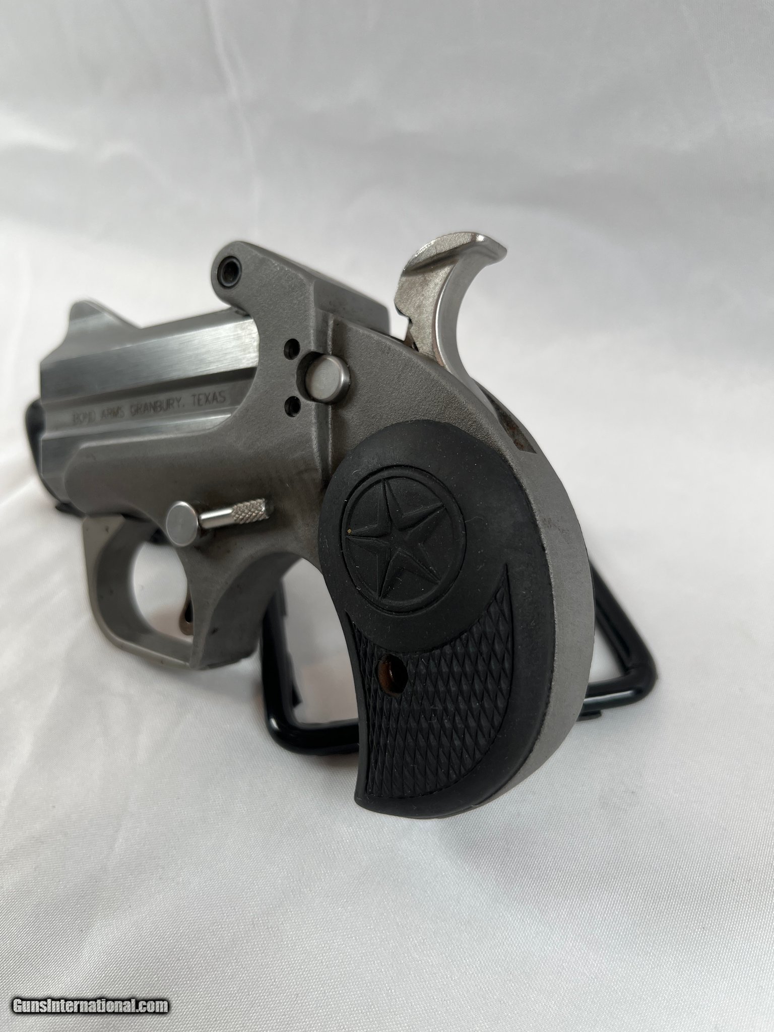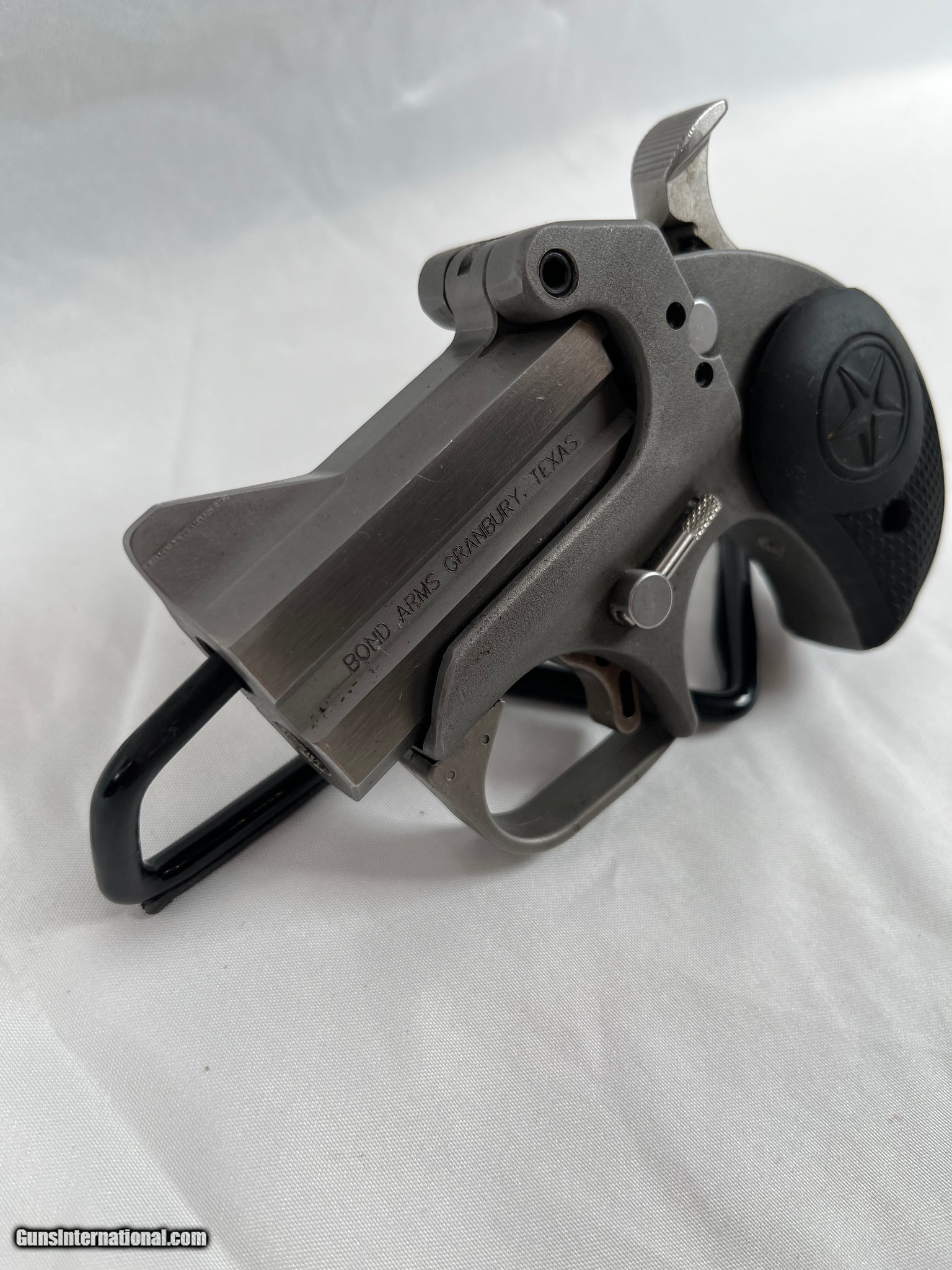 Description: Guns Listing ID: 547786 Bond Arms Roughneck – 9mm – Compact Derringer – Good Condition Overview: Up for sale is a Bond Arms Roughneck, chambered in 9mm. This rugged, compact derringer-style pistol is built for simplicity, strength, and concealability. Made in Texas and machined from solid stainless steel, the Roughneck series is designed for close-range personal defense and excels as a backup or deep-concealment firearm. The Roughneck features a stainless steel frame and double-barrel design, with interchangeable 2.5" barrels, allowing caliber swaps across other Bond Arms barrel options. It fires from a single-action trigger, and uses a rebounding hammer, cross-bolt safety, and spring-loaded cam lock lever for secure barrel operation. The 9mm chambering offers controllable recoil in a compact package with commonly available ammunition. This firearm is in Good Condition, showing minimal wear consistent with light use. The stainless steel finish has small handling marks but no deep scratches or mechanical flaws. The black rubber grips are intact and provide a secure, recoil-dampening hold. The bore is clean, and both barrels lock up tightly. Mechanically, the pistol functions as intended. Please review all provided photos carefully to evaluate cosmetic condition. Key Features: Compact derringer-style pistol chambered in 9mm Stainless steel construction – 2.5" interchangeable barrels Single-action only – rebounding hammer design Cross-bolt safety and spring-loaded locking lever Compatible with other Bond Arms caliber barrels Compact, easily concealable profile Rubber grips for improved control Includes: (1) Bond Arms Roughneck pistol SOLD Manufacturer: BOND ARMS Model: ROUGHNECK Caliber Info: 9MM LUGER (9x19 PARA) Condition: Used - Non-Certified Barrels: 2.5 BARREL Action: OVER/UNDER Finish: stainless steel |