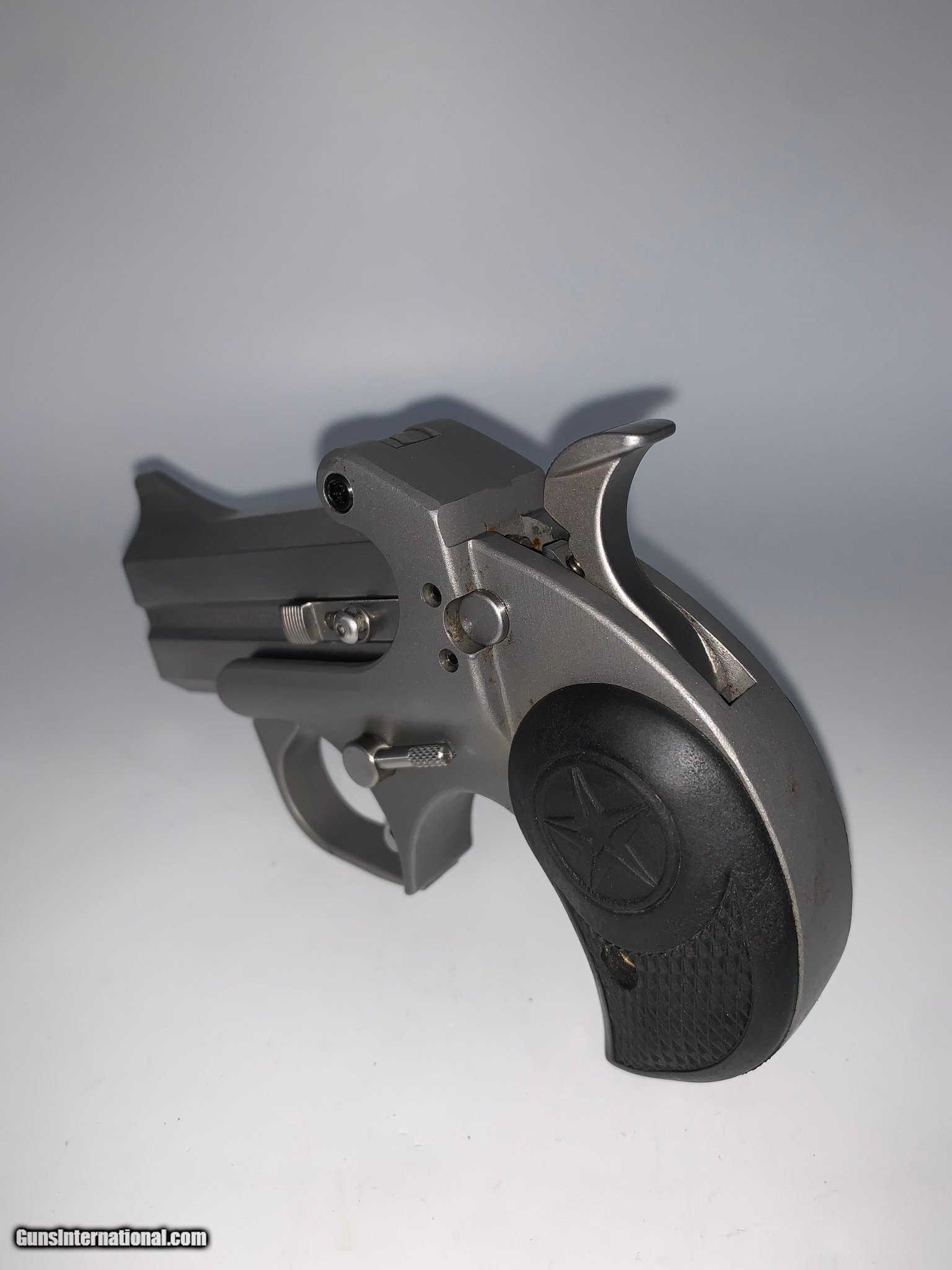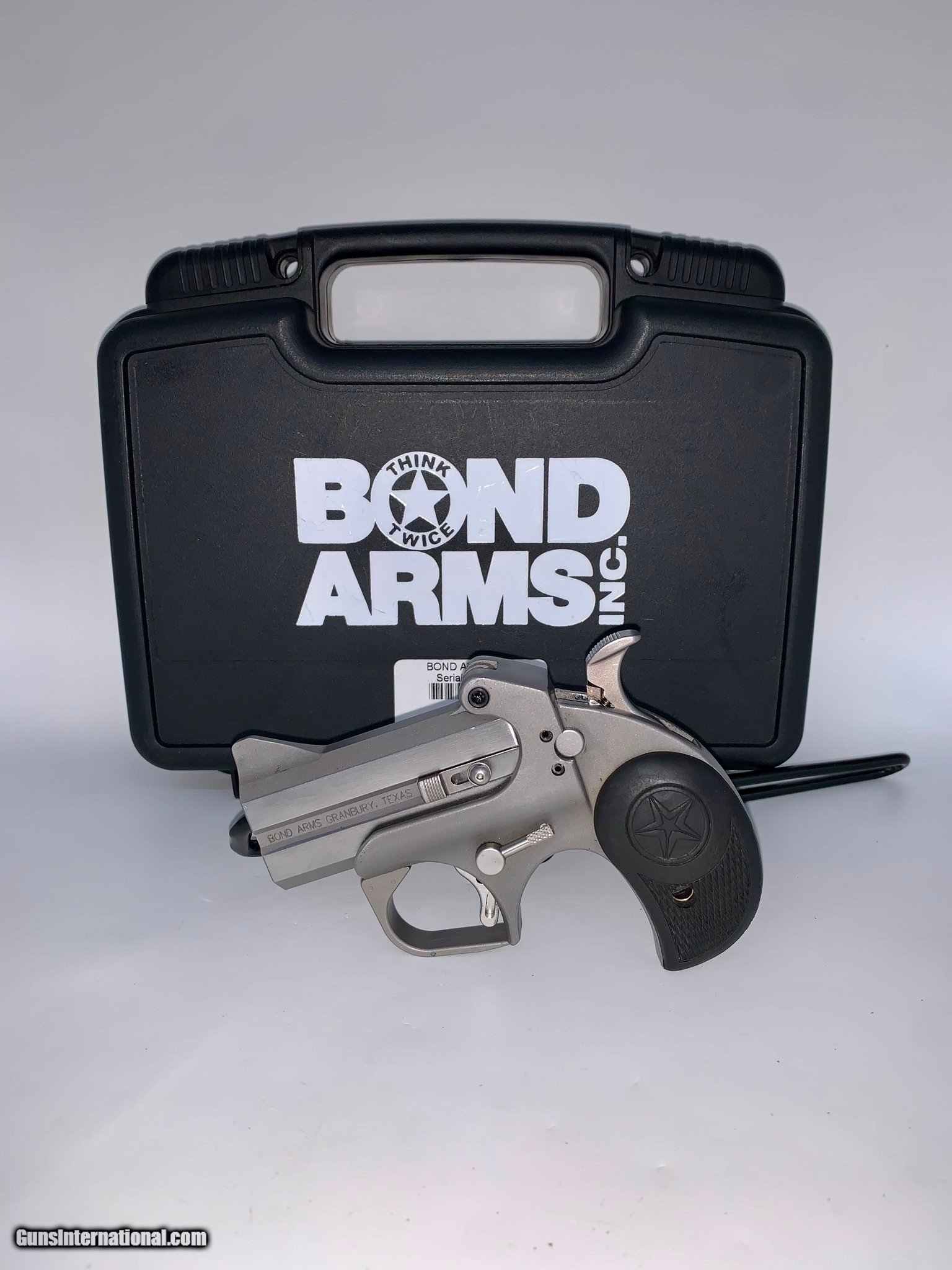 Description: Guns Listing ID: 557485 This is a preowned BOND ARMS ROWDY in GOOD condition. Comes as pictures. This is the Bond Arms Rowdy, a very solid, very well-made compact derringer chambered for both 45 Long Colt and 410 shotgun shells. Bond Arms derringers are unique in that the barrels are interchangeable, and are the \"caliber-specific\" components of the firearm. This model features 3-inch barrels. Model: Rowdy Caliber: 45LC/410 Barrel Length: 3\" Grip Material: Rubber Grip Size: Standard Sights: Front blade, fixed rear Compatible with all standard Bond Arms barrels Patented rebounding hammer Retracting firing pins 1024073-SUM-VS SOLD Manufacturer: BOND ARMS Model: ROWDY Caliber Info: .45 COLT/.45 ACP Condition: Used - Non-Certified Barrels: 3 BARREL Action: SINGLE SHOT Finish: stainless & black |