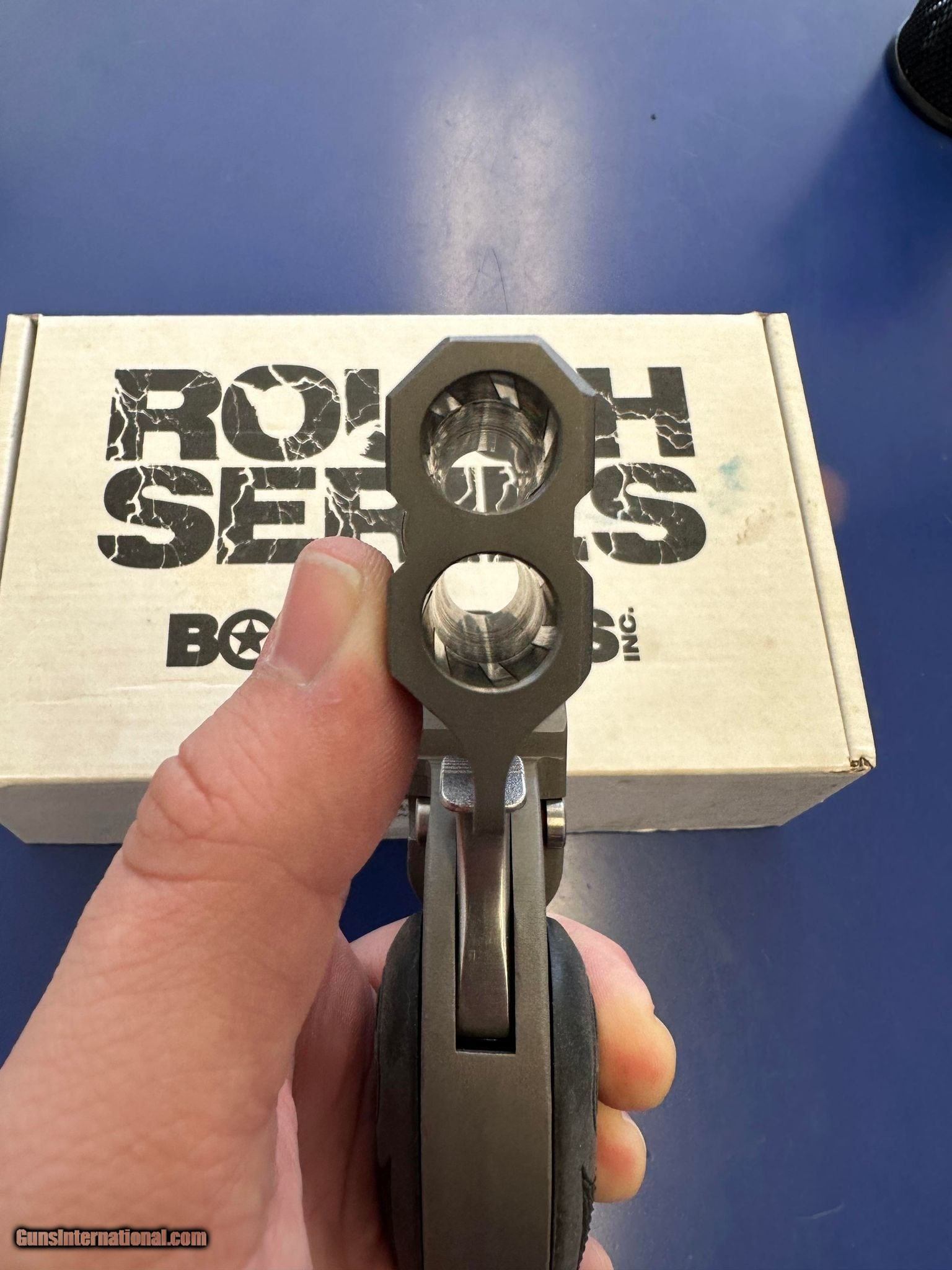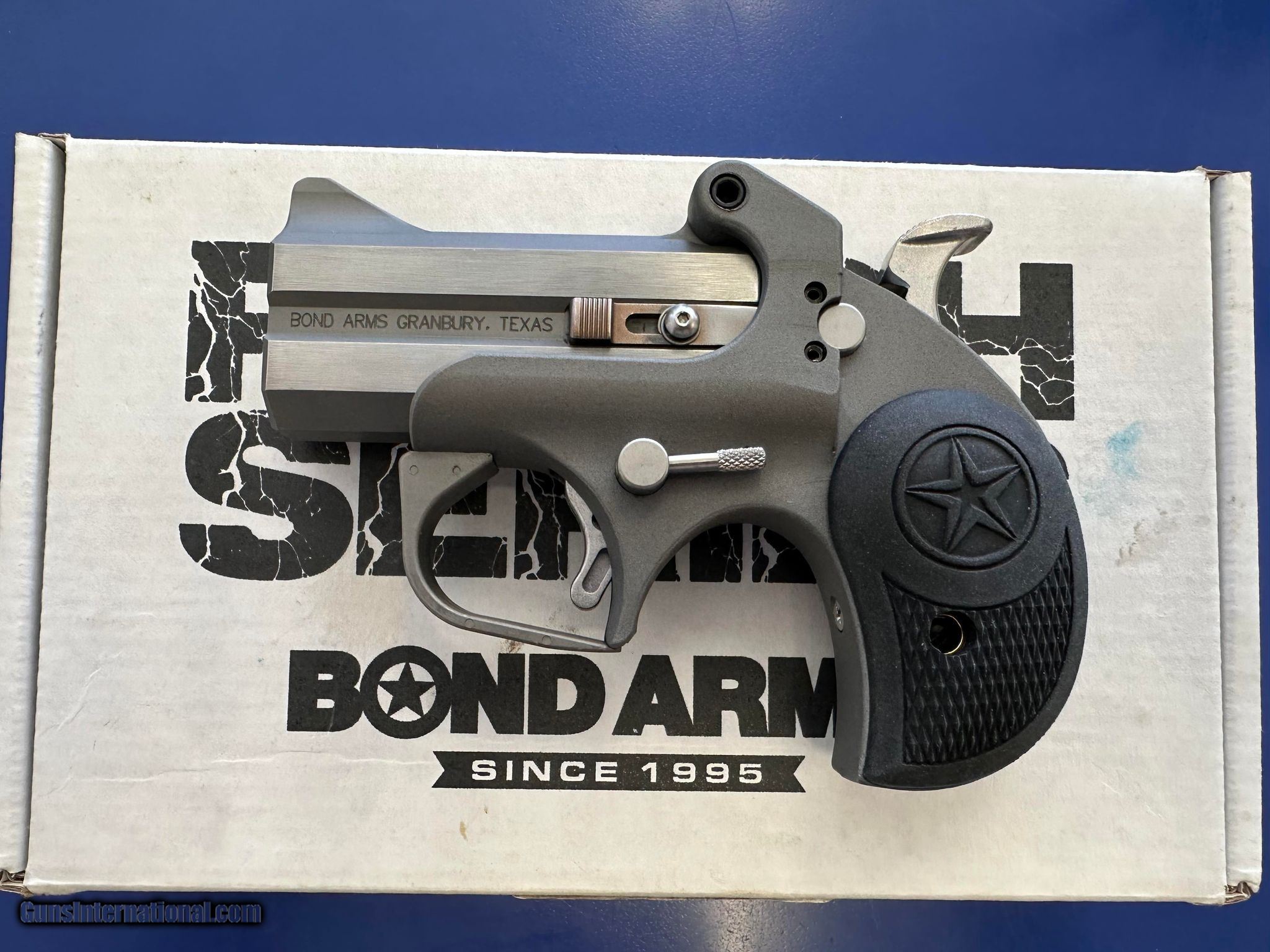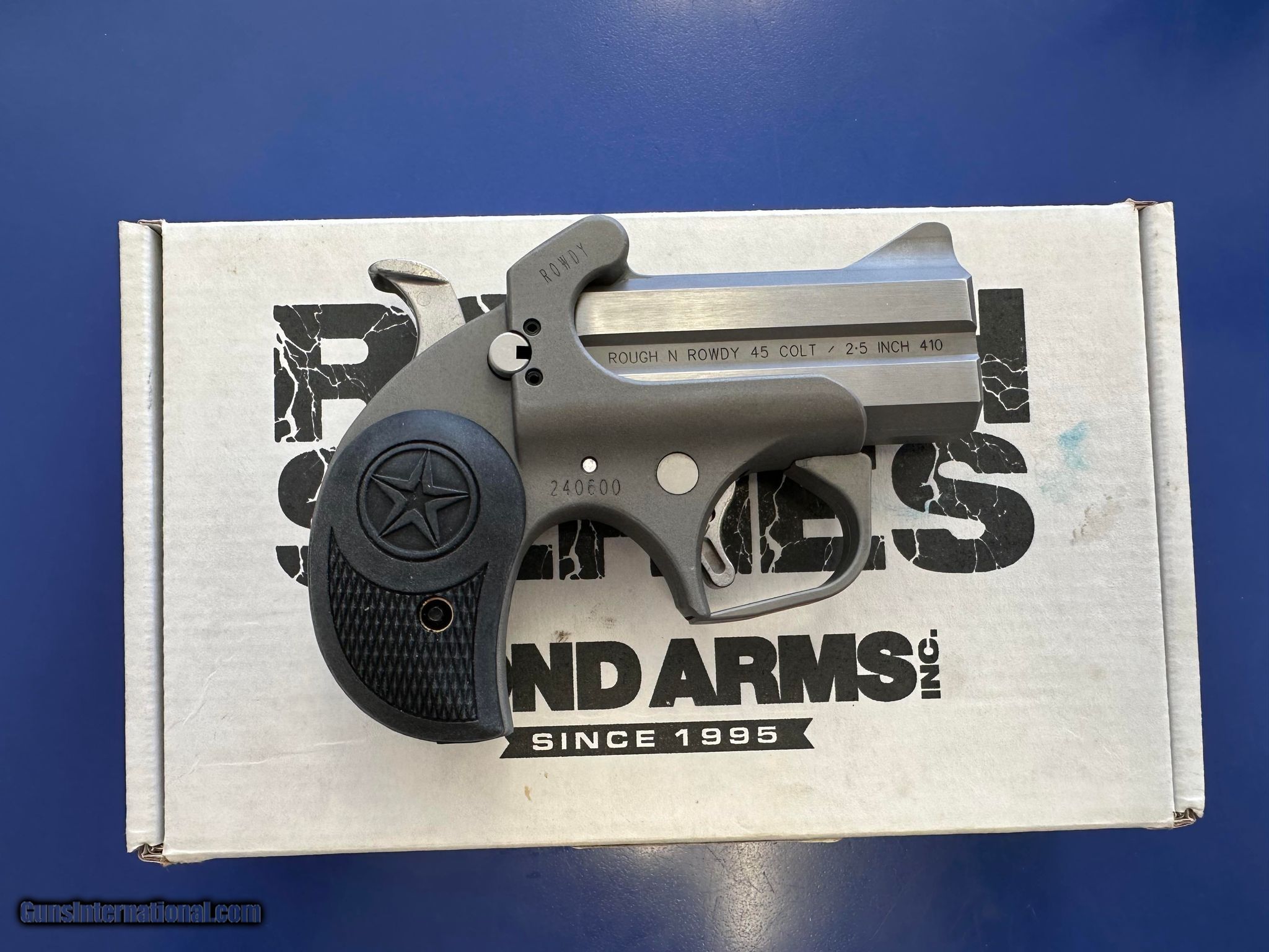 Description: Guns Listing ID: 1115580 Little to no usage can be visibly seen on the derringer. Come with the original box. SOLD Manufacturer: BOND ARMS Model: ROWDY Caliber Info: .45 LC/.410 GA Condition: Used - Non-Certified Barrels: 3 BARREL |