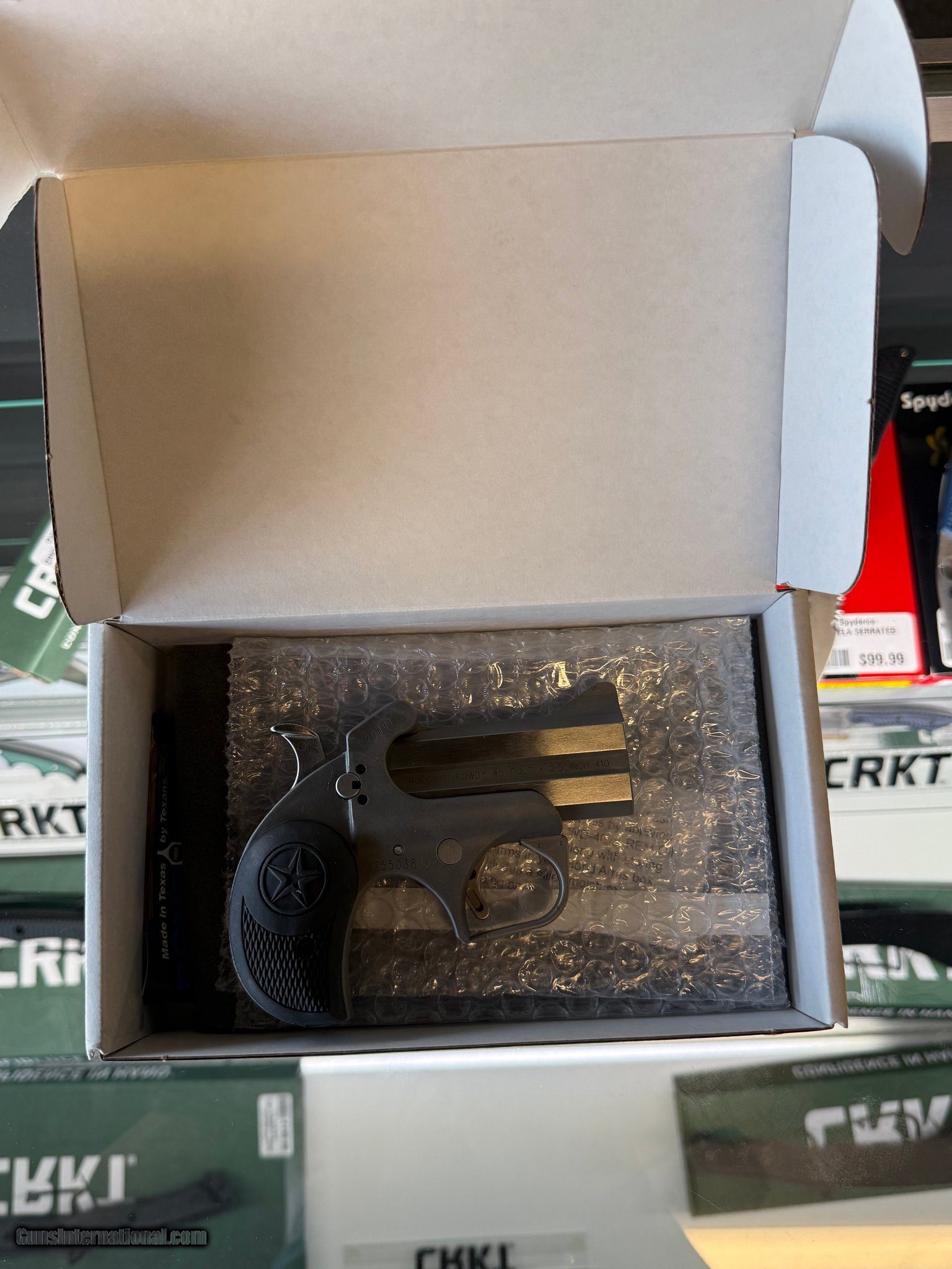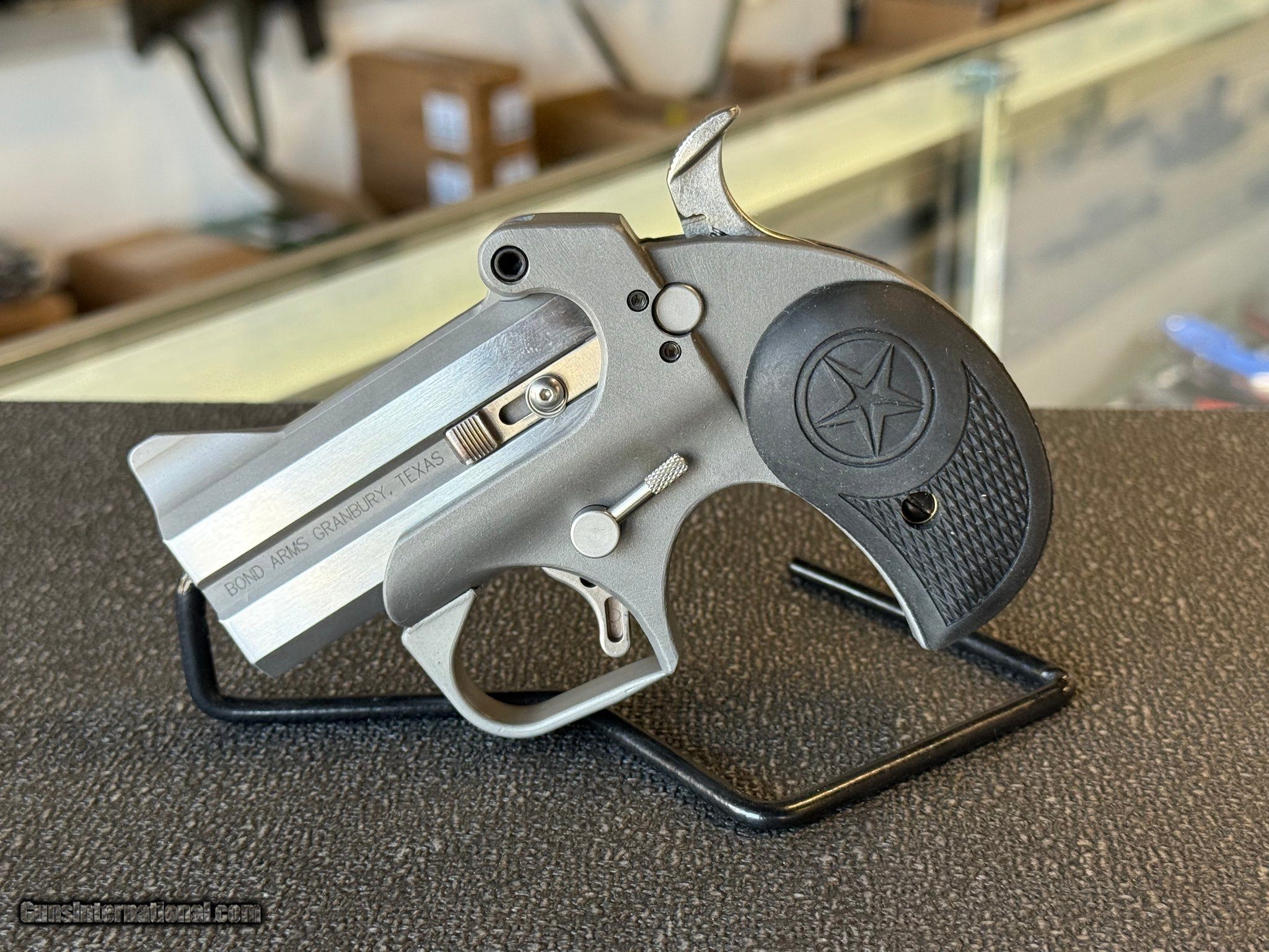 Description: Guns Listing ID: 524485 - EXCELLENT CONDITION - ORIGINAL BOX SOLD Manufacturer: BOND ARMS Model: ROWDY Caliber Info: .45 LC/.410 GA Condition: Used - Non-Certified Barrels: 3 BARREL Action: OVER/UNDER Weight: 1.4 LBS. |